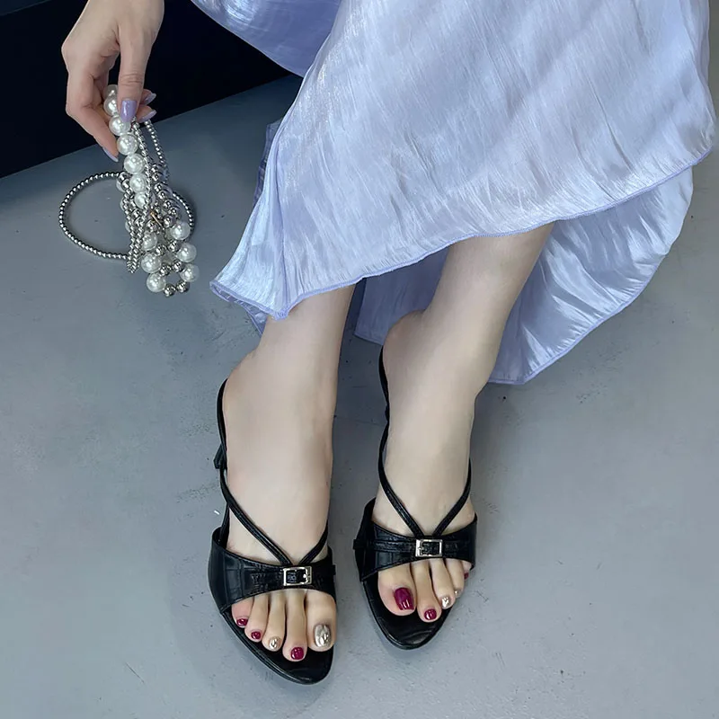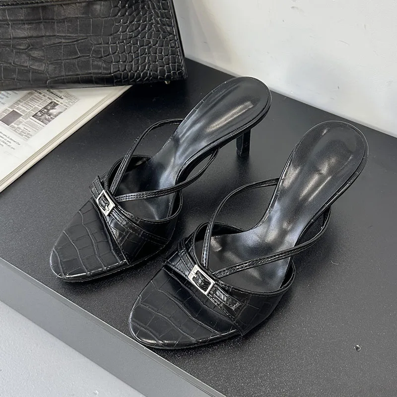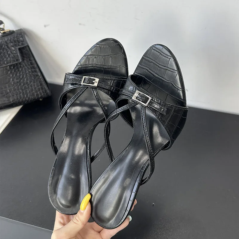 KYLETHOMASW - Big Size 43 Fashion Round Toe Ladies Thin Heels Sandals Shoes Shallow Elegant Women Heeled Sandals Shoes Female Footwear Black