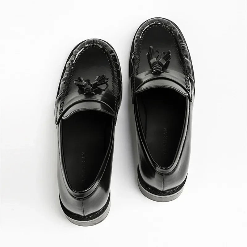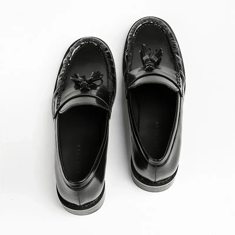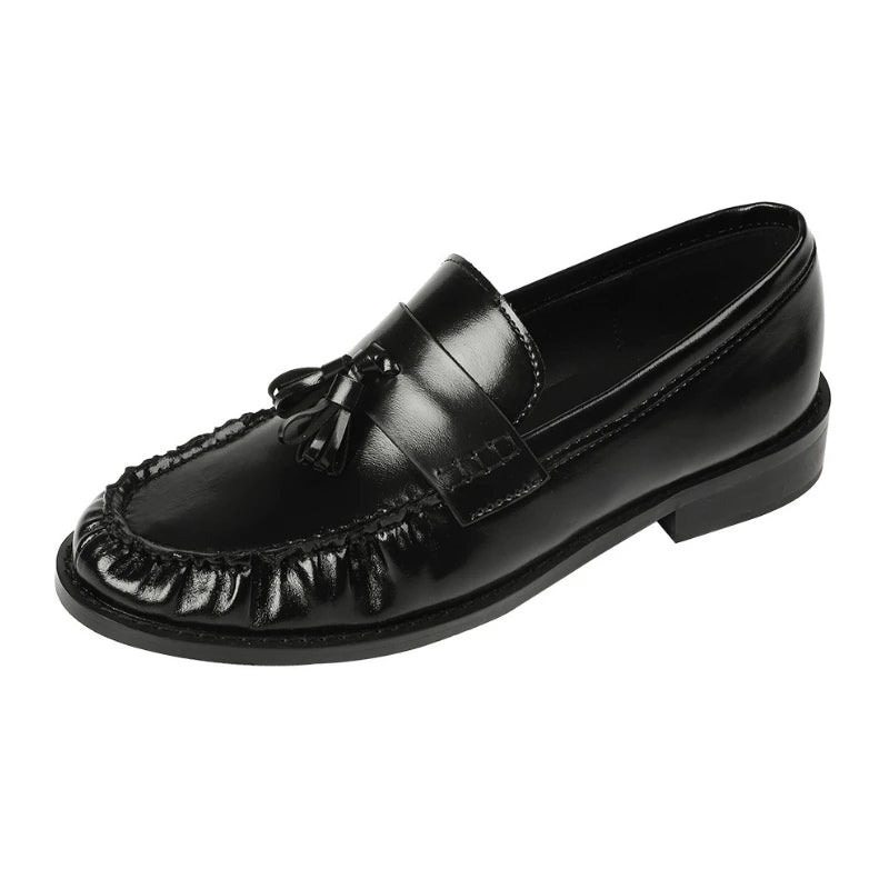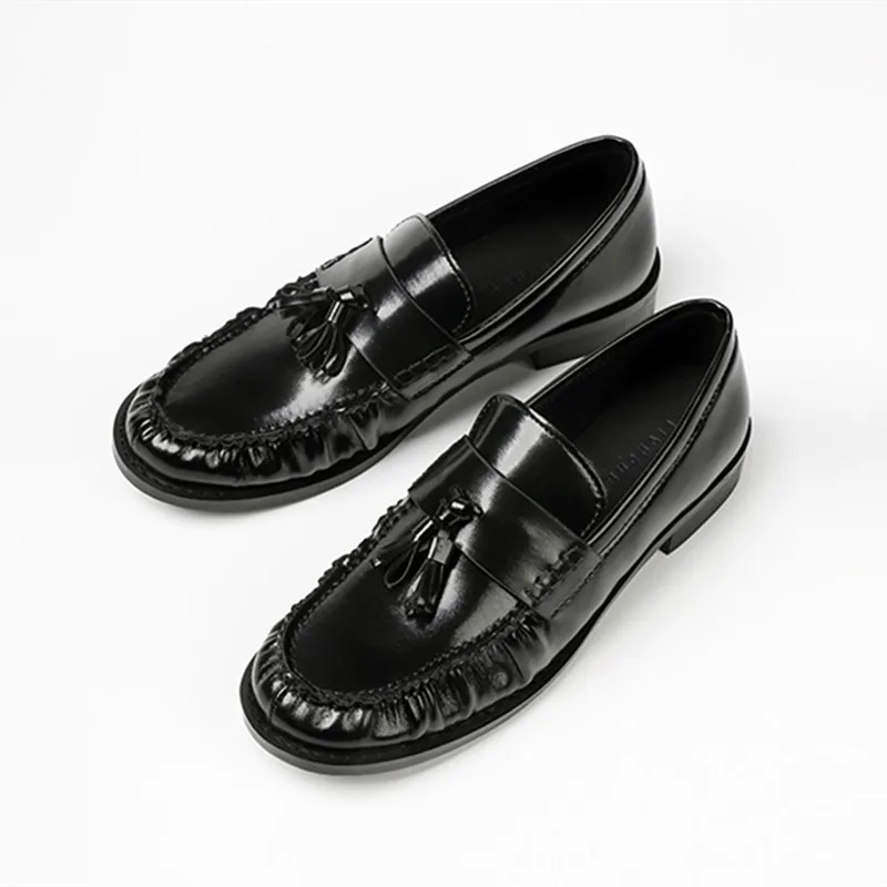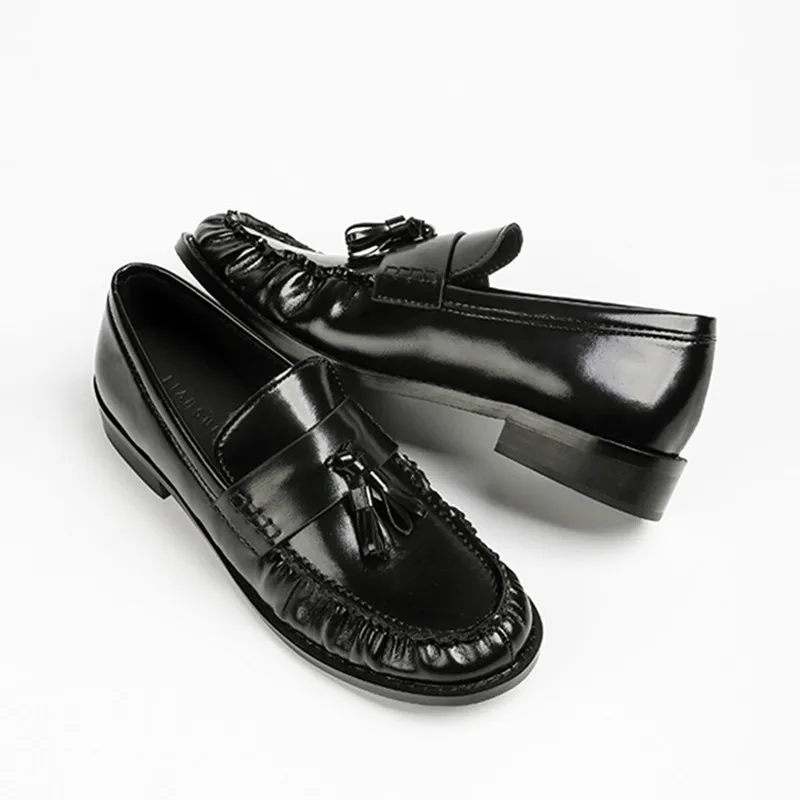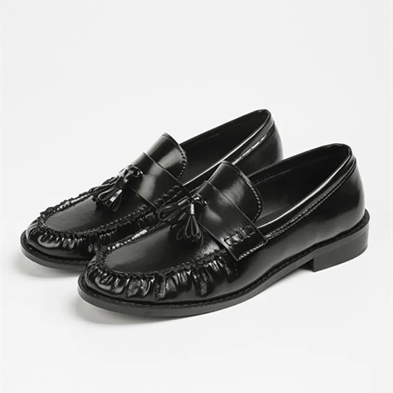KYLETHOMASW - Black Patent Leather Chunky Heel Loafers Fashion Pleated Fringe Sewing Designer Shoes Comfortable Soft Leather Zapatos De Mujer