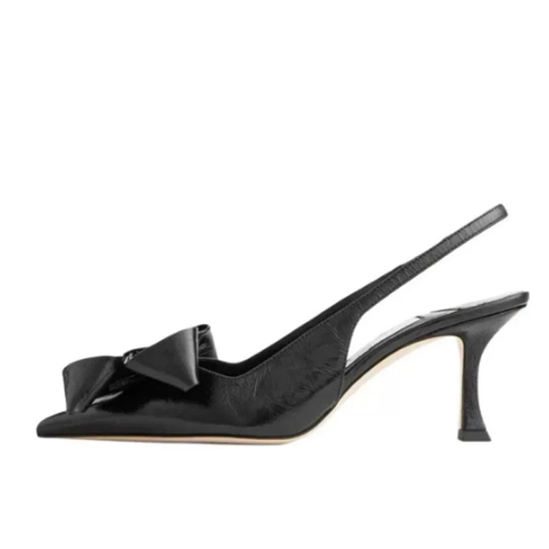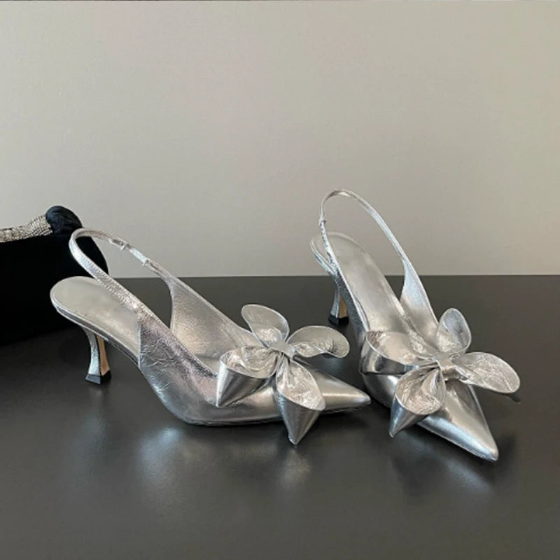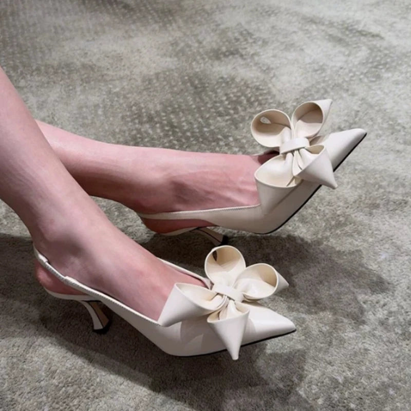 KYLETHOMASW - Bow Flower Pointed Toe Slip-On Stiletto Sandals Woman Summer 2025 White Slingback Rear Strap High Heel Shoes Fashion Pumps