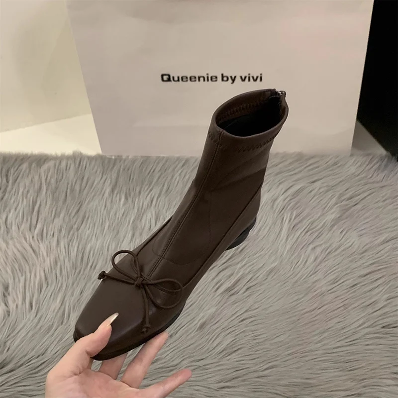 KYLETHOMASW - Brown Bow Back Zipper Ankle Boots Women Point Flat Head Square Heel Autumn Winter Shoes Chic Sewing Thread Boot for Woman