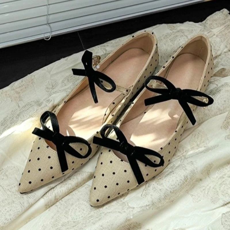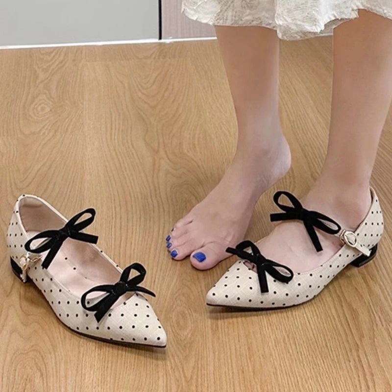 KYLETHOMASW - Cute Bow Double Buckle Low Heel Pumps Women Fashion Polka Dot Pointed Toe Designer Shoes Comfort Soft Sole Commuter Office Shoes