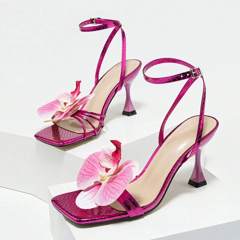KYLETHOMASW - Flowers Square Toe Open Toe Women High Heel Brand Design Narrow Band Party Women's Thin High Sandals Summer Sexy Stripper Shoes