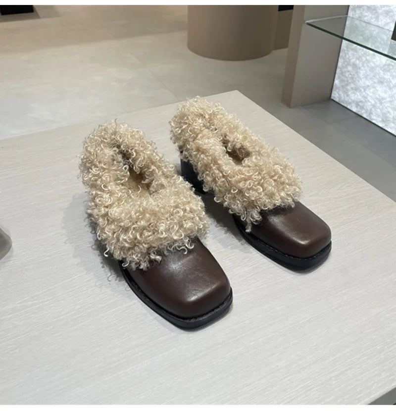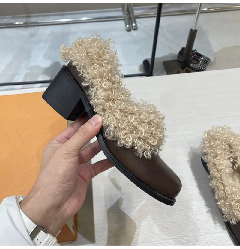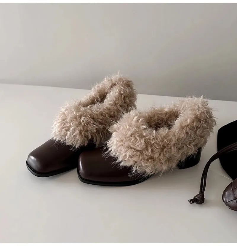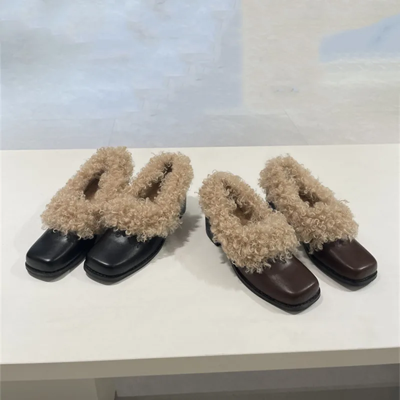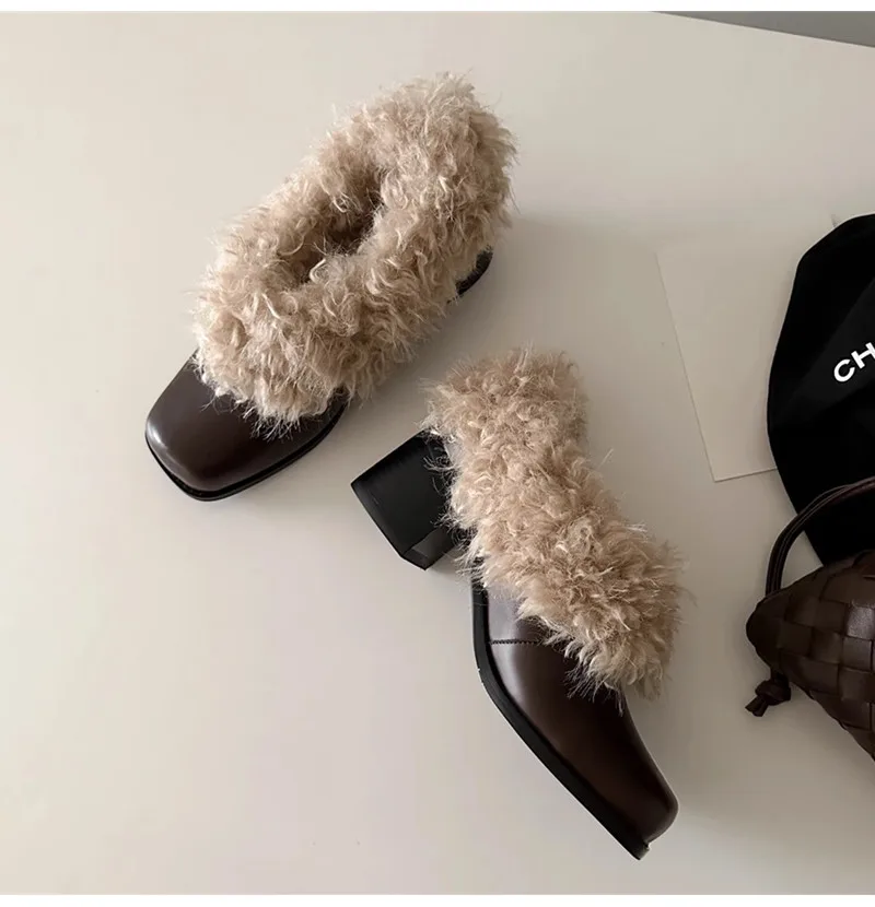 KYLETHOMASW - Ins style Fashion Square toe Patent Leather Wool Women Pumps Autumn Winter Warm High heels Loafers Casual Girls Chunky Shoes
