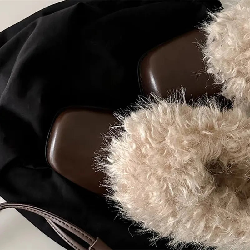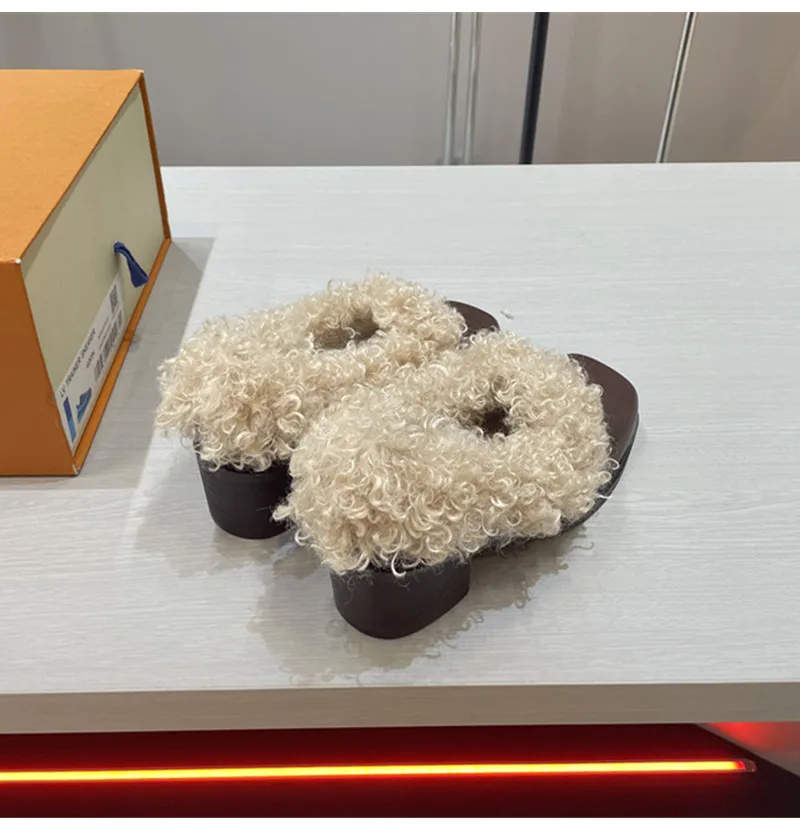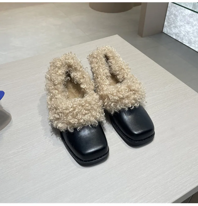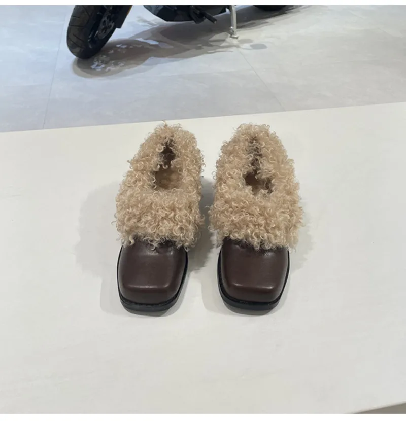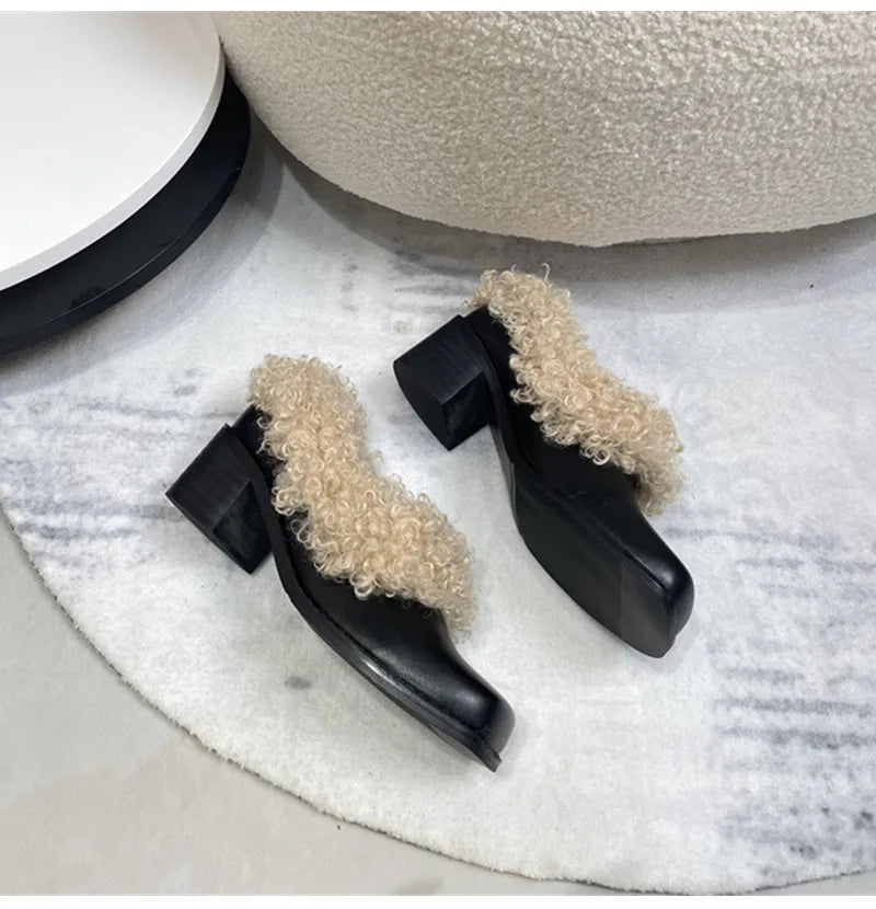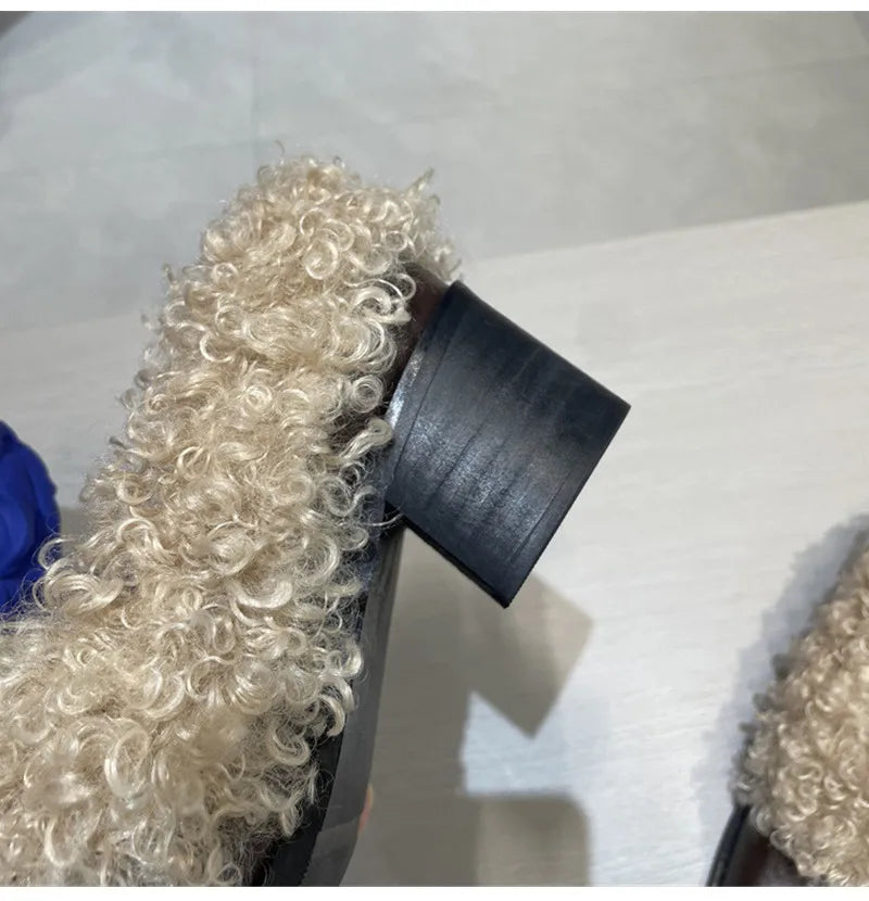 KYLETHOMASW - Ins style Fashion Square toe Patent Leather Wool Women Pumps Autumn Winter Warm High heels Loafers Casual Girls Chunky Shoes