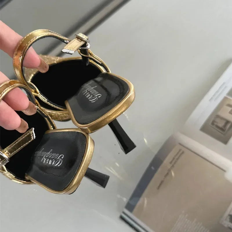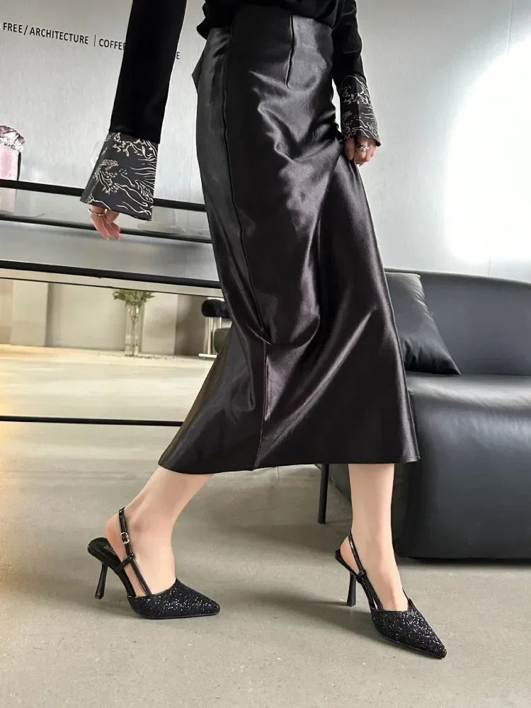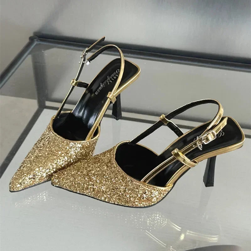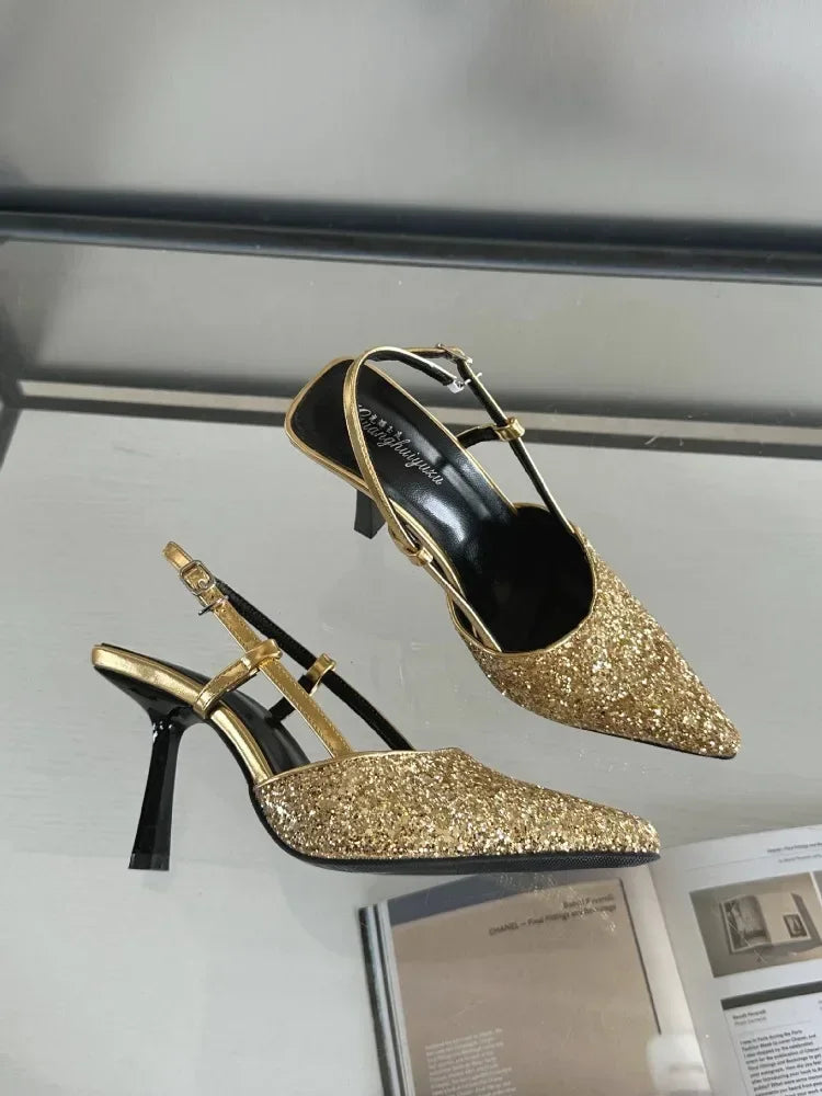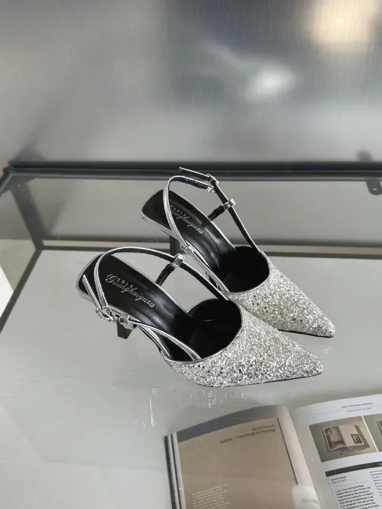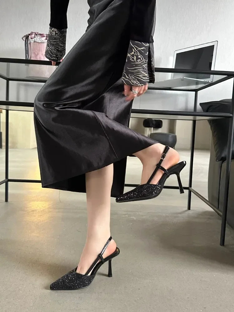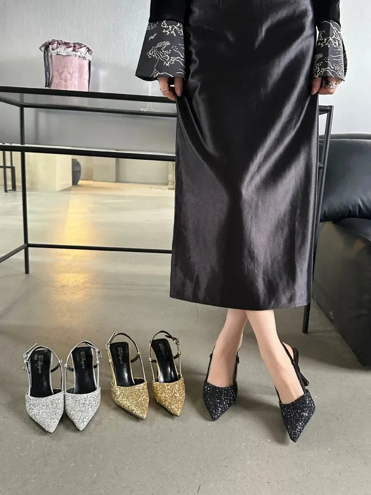KYLETHOMASW - Luxury Bling Design Mules Sandals Women Sexy Pointed Toe Thin High Heels Summer Back Strap Banquet Dress Shoes Women Pums