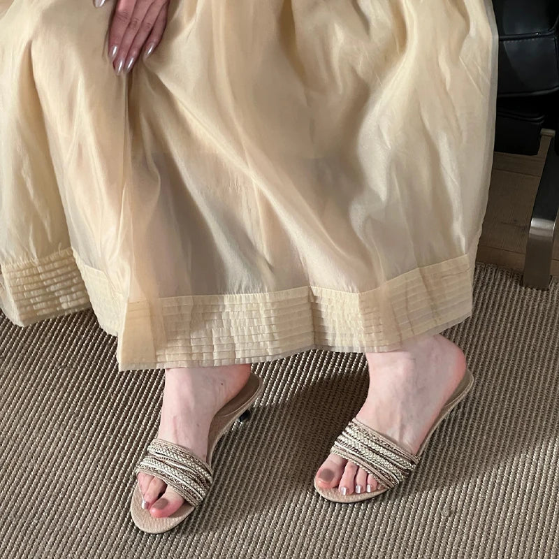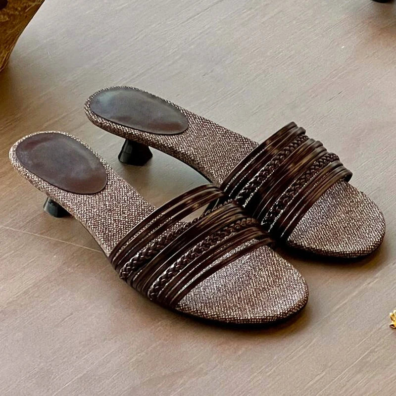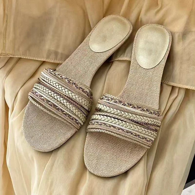 KYLETHOMASW - Luxury Designer Summer Low Heel Women Weave Slippers Elegant Open Toe Dress Slides Outdoor Gladiator Shoes