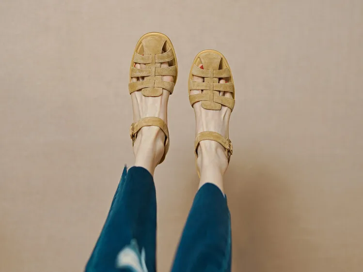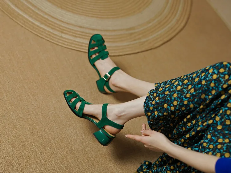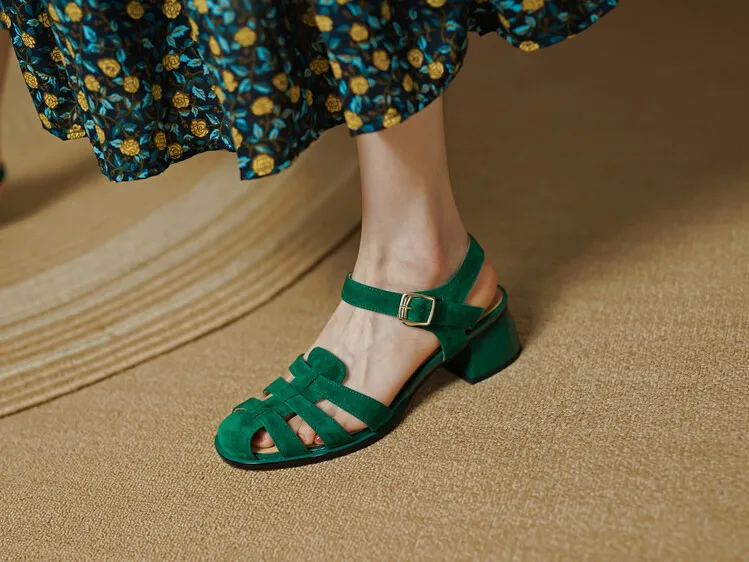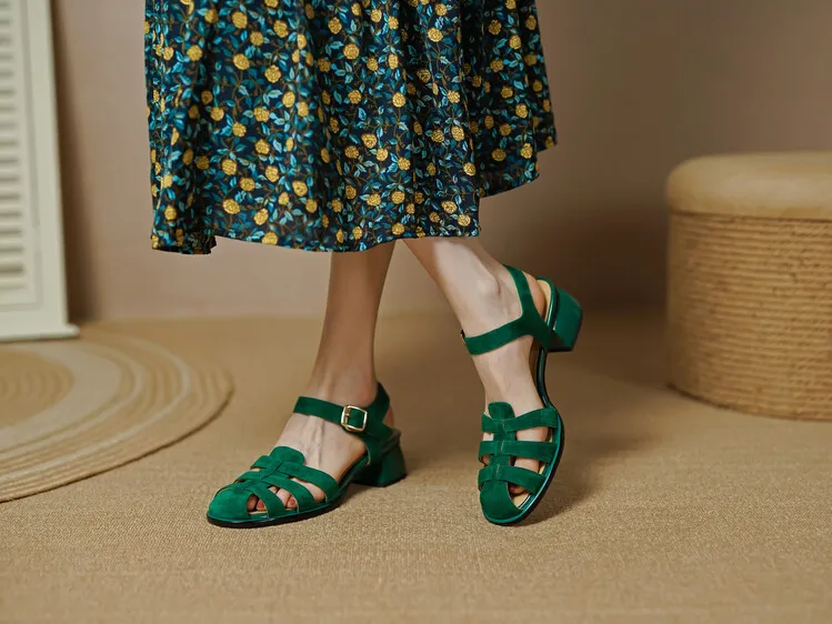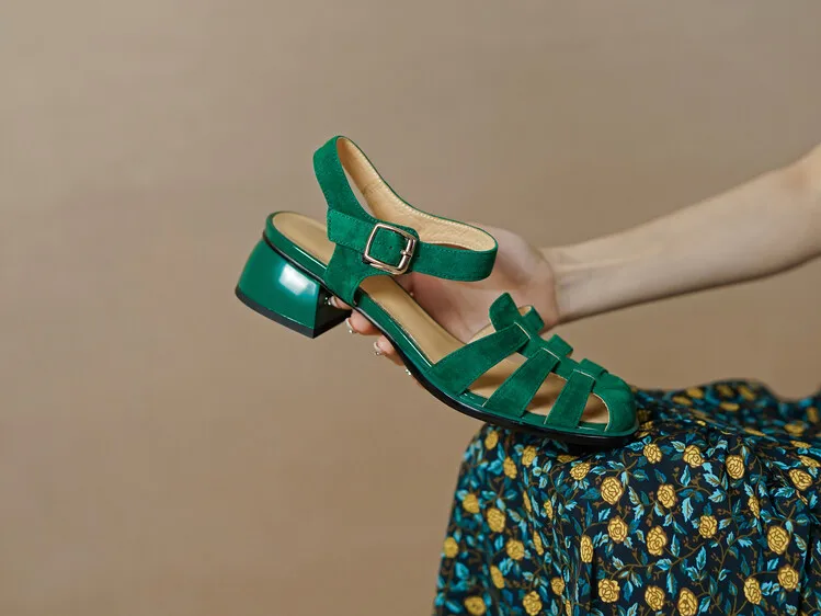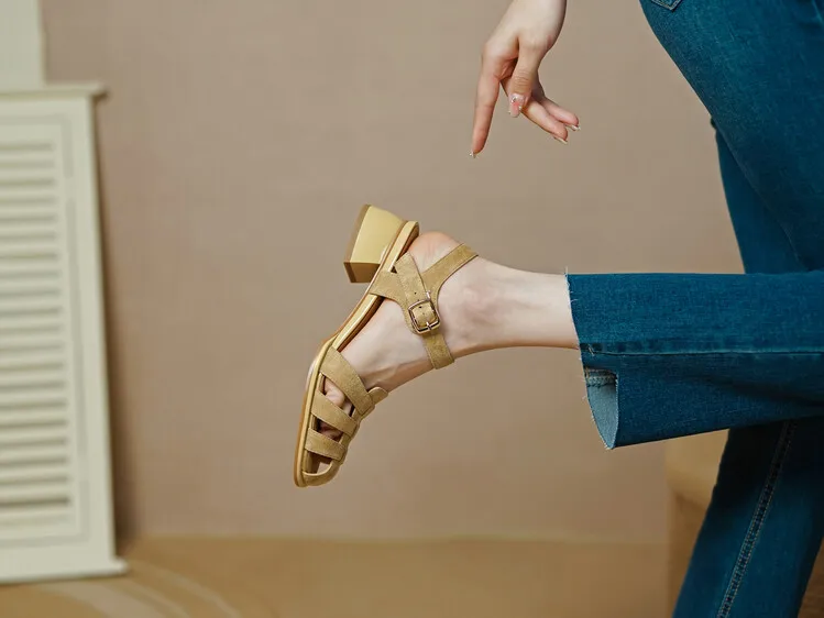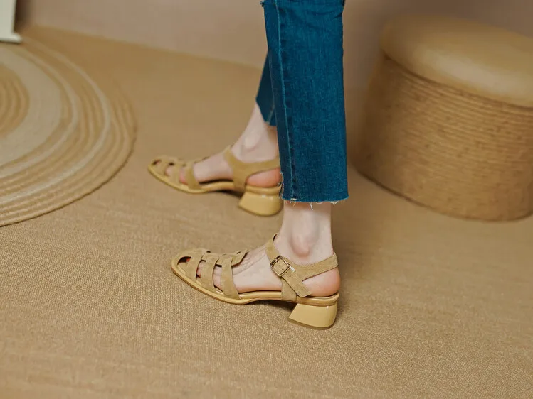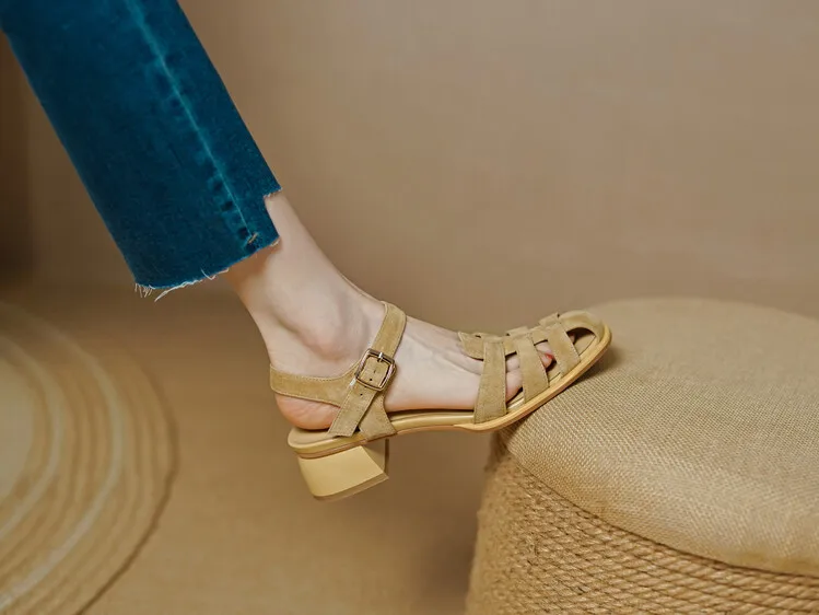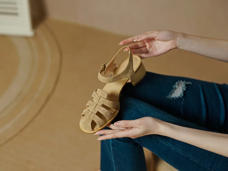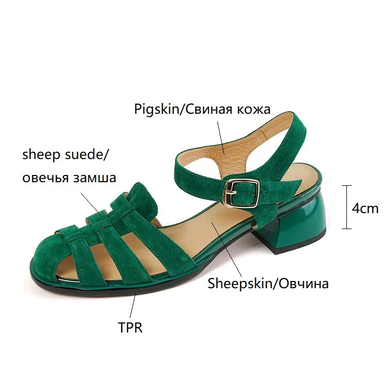 Kylethomasw NEW Summer Women Sandals Sheep Suede Leather Shoes for Women Round Toe Chunky Heel Shoes Cover Toe Sandals Solid Gladiator Shoes