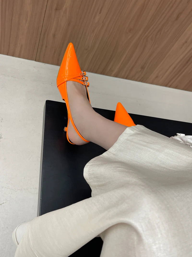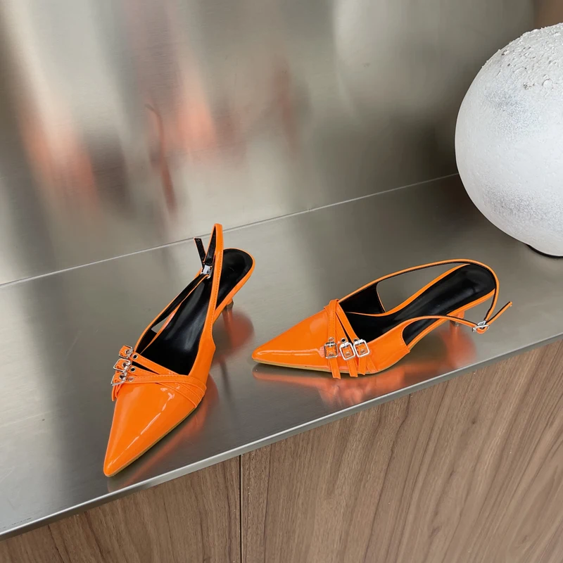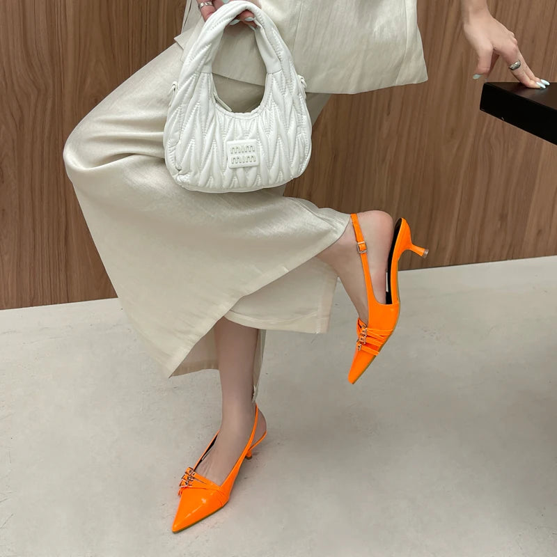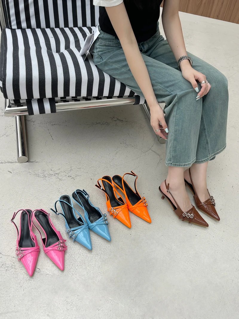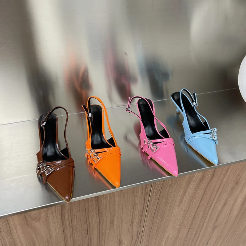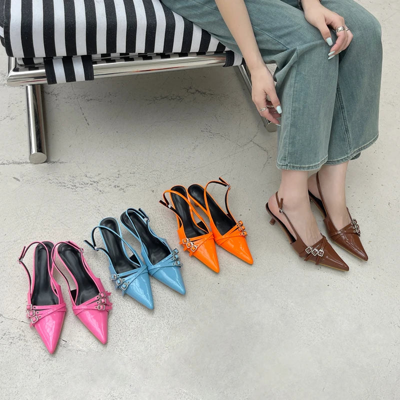 KYLETHOMASW - Orange Ladie Pumps Pink High Heels Sexy Pointed Toe Slingback Shoes Women Belt Buckle Low Heel Summer Office Shoes Blue