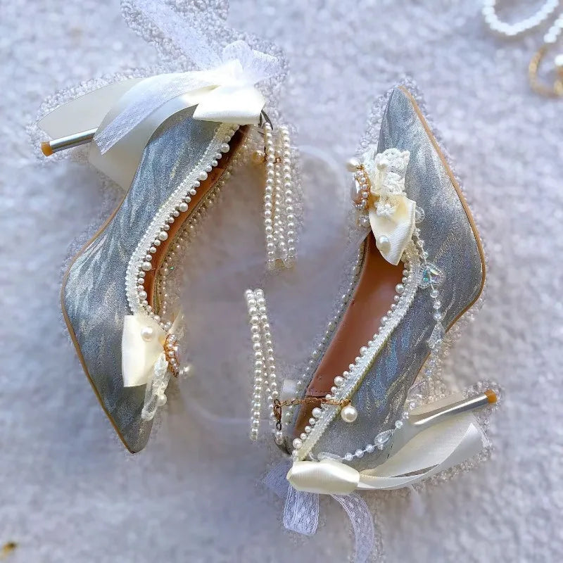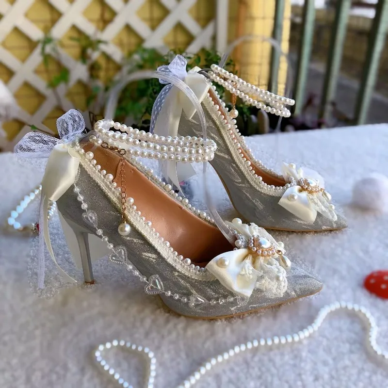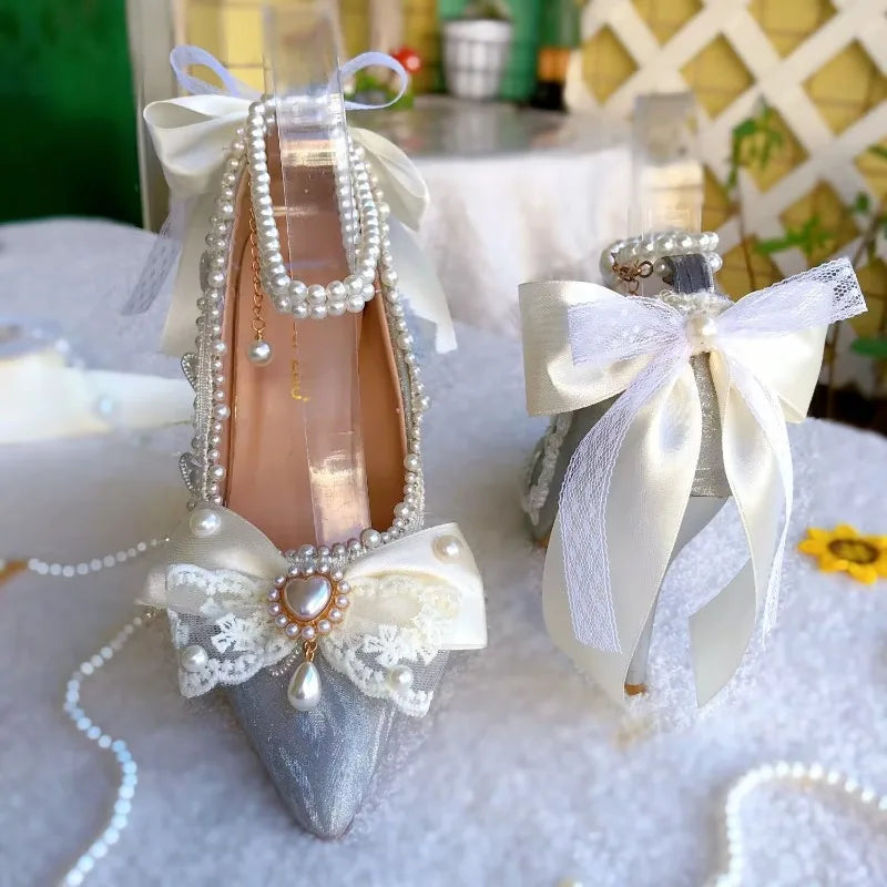 KYLETHOMASW - Original Handmade Lolita Shoes Flower Wedding Gorgeous High Heels Loli Sparkling Pearl Bow Princess Pumps Wedding Shoes Bride
