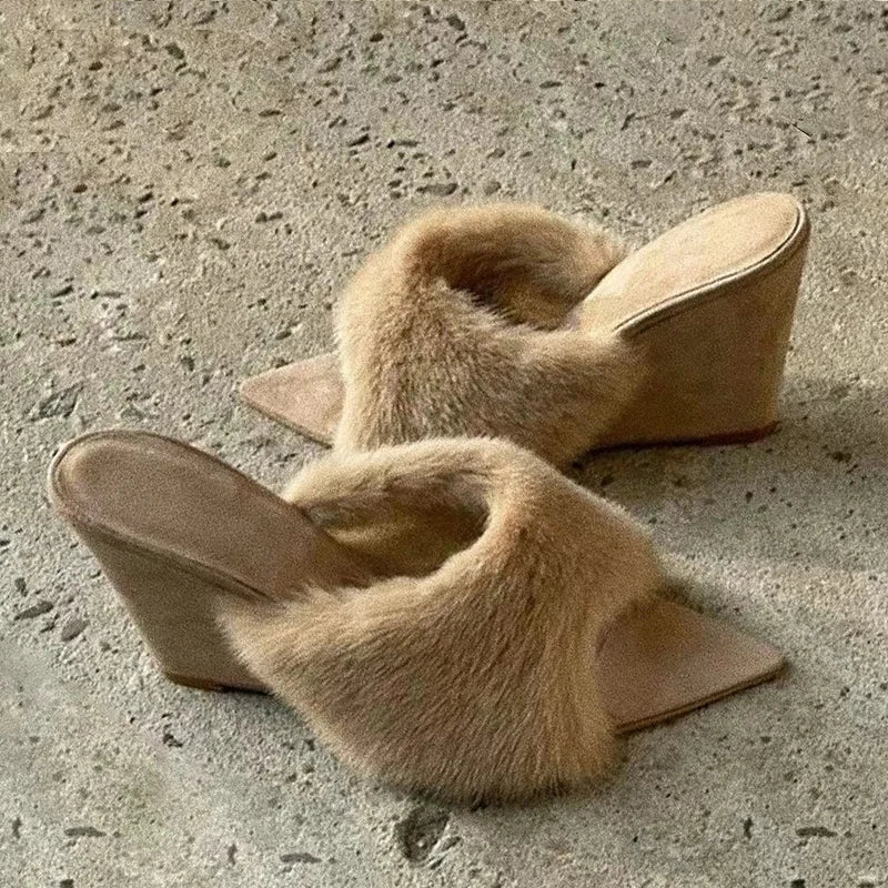 KYLETHOMASW  -  Plush Women's Autumn Slippers French Pointed Open-toed Fluffy Slippers Home Outdoors Fashion Wedge Shoes Women Heels Highquality