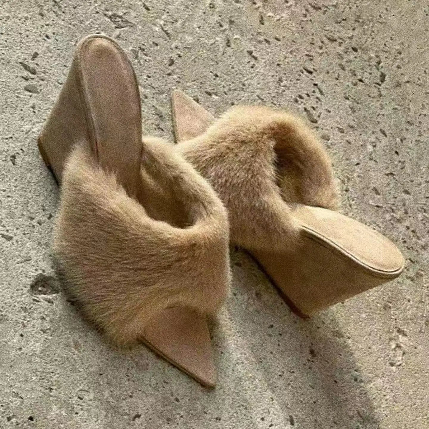 KYLETHOMASW - Plush Women's Autumn Slippers French Pointed Open-toed Fluffy Slippers Home Outdoors Fashion Wedge Shoes Women Heels Highquality