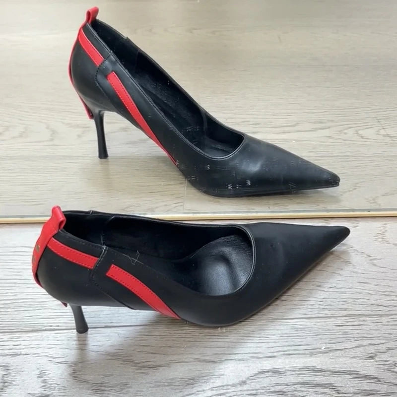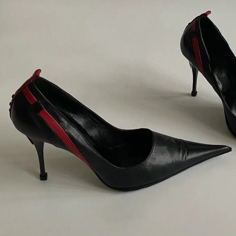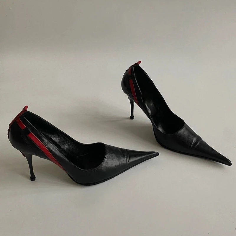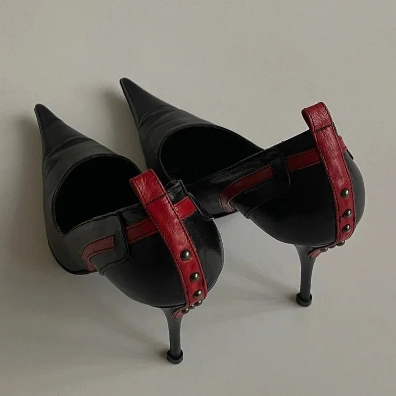 KYLETHOMASW - Pointed Toe Stiletto Rivet Decoration Women Shoes Fashion Black and Red Rome Women Shoes Slip-on Hand-made