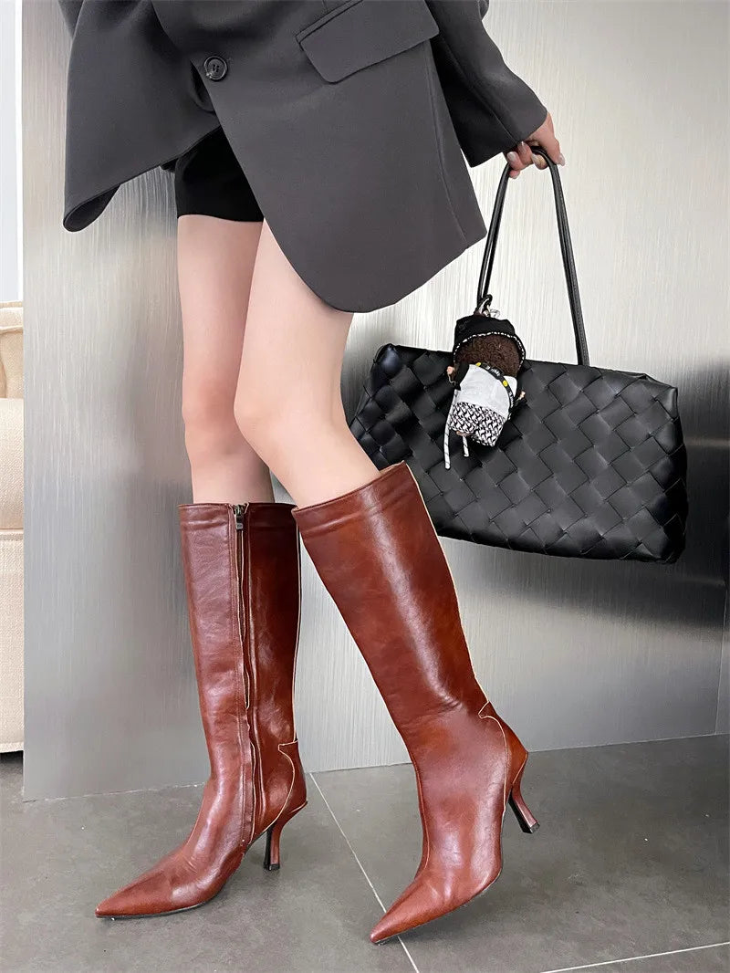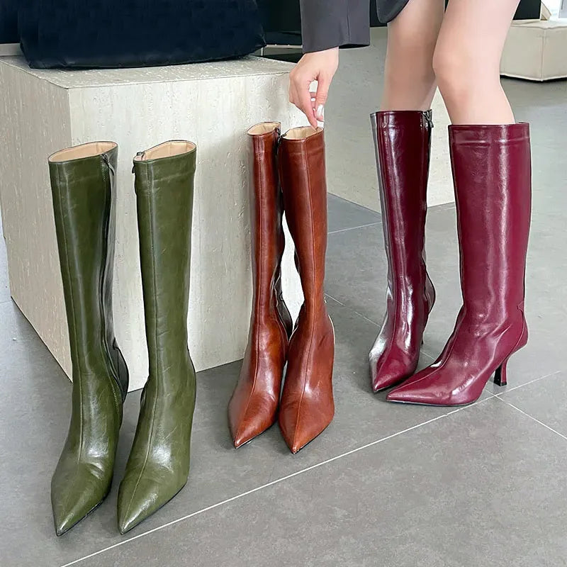 KYLETHOMASW - Sexy Pointy Toe Knee High Boots Women High Quality Leather High Heel Winter Boots for Women Side Zipper Designer Luxury Shoes
