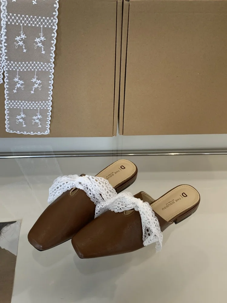 KYLETHOMASW - Slippers Casual Flat Shoes Female Lace Beige Heeled Sandals Slides Cover Toe Slipers Women Mules Sexy Butterfly-Knot Luxury Blac