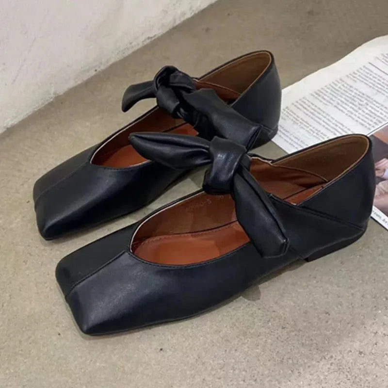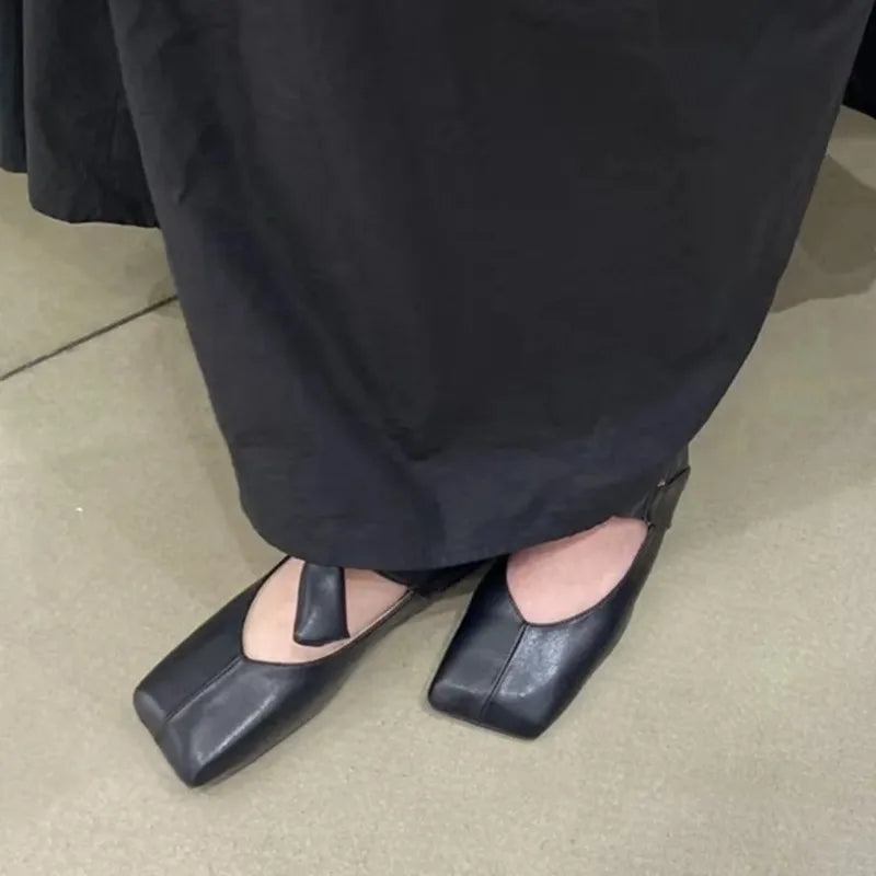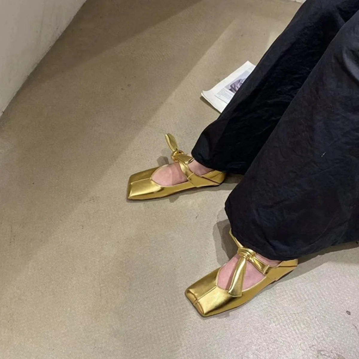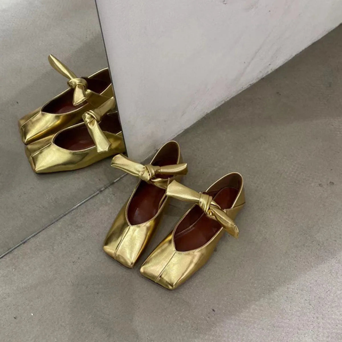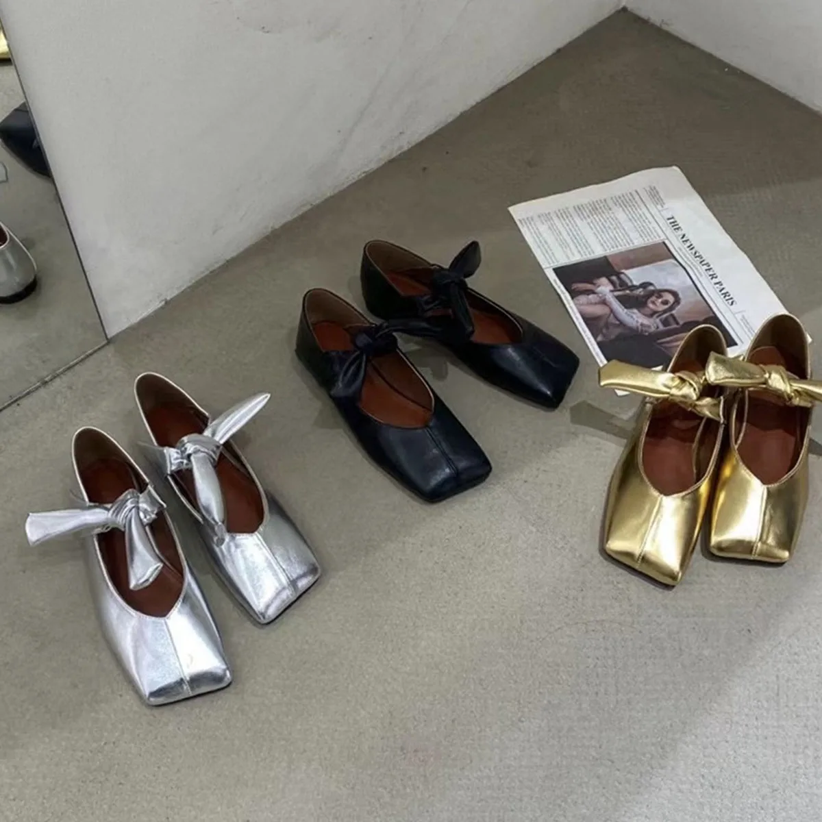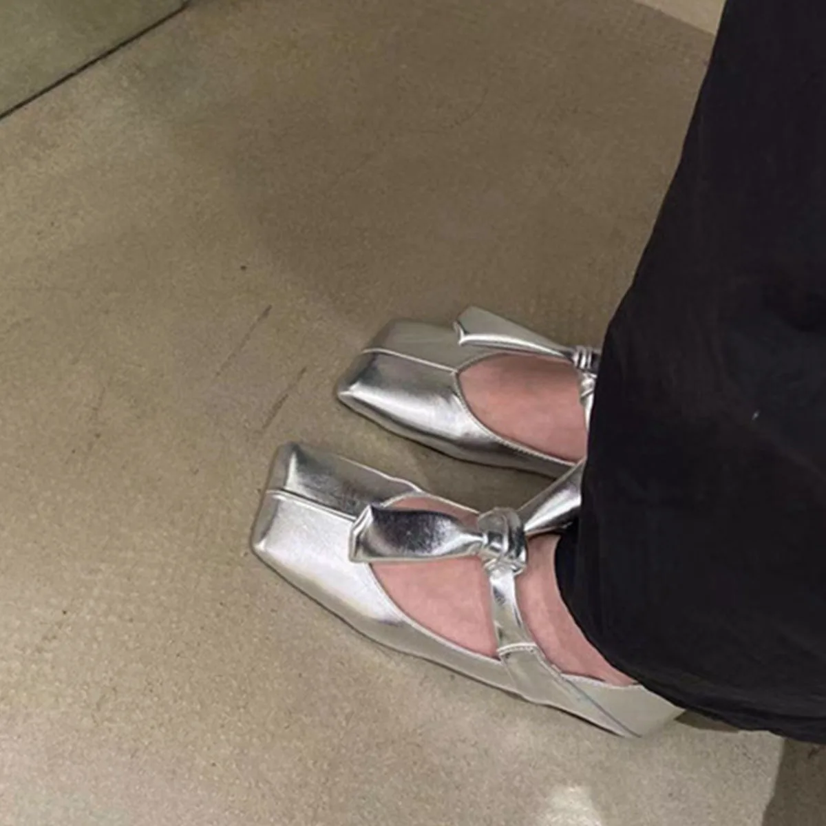 KYLETHOMASW - Square Toe Lace-up Shiny Mary Jane Flats Stylish French Flat Silver New Spring and Autumn Shallow One-strap Women Shoes