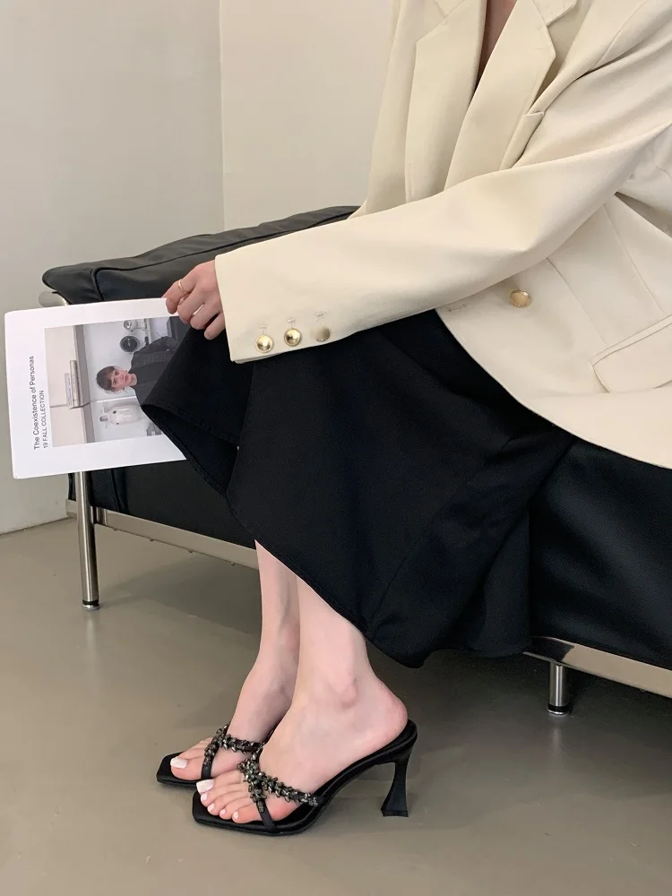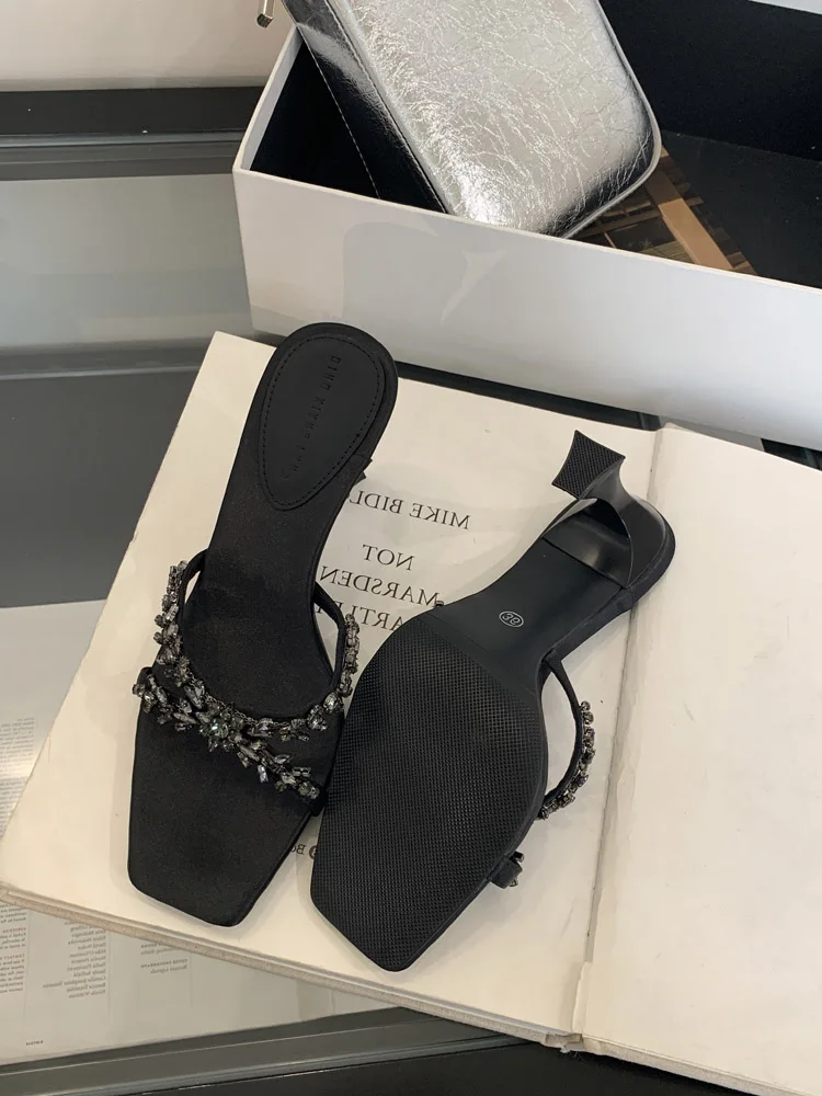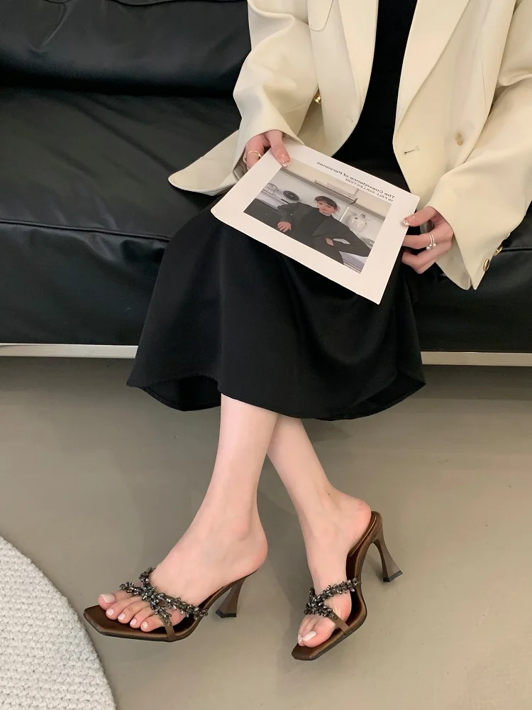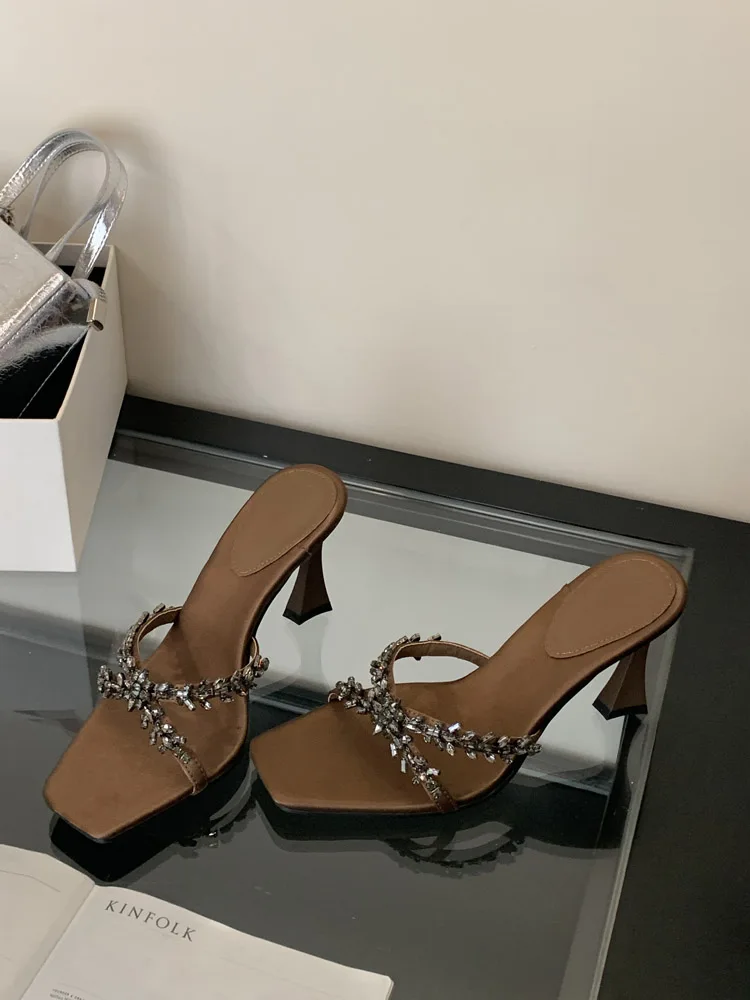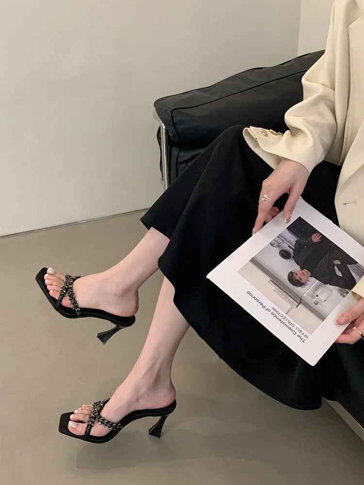 KYLETHOMASW - Street Style CRYSTAL Narrow Band Slippers Woman Open Toe Thin High Heels Sandals Stripper Party Slides Shoes