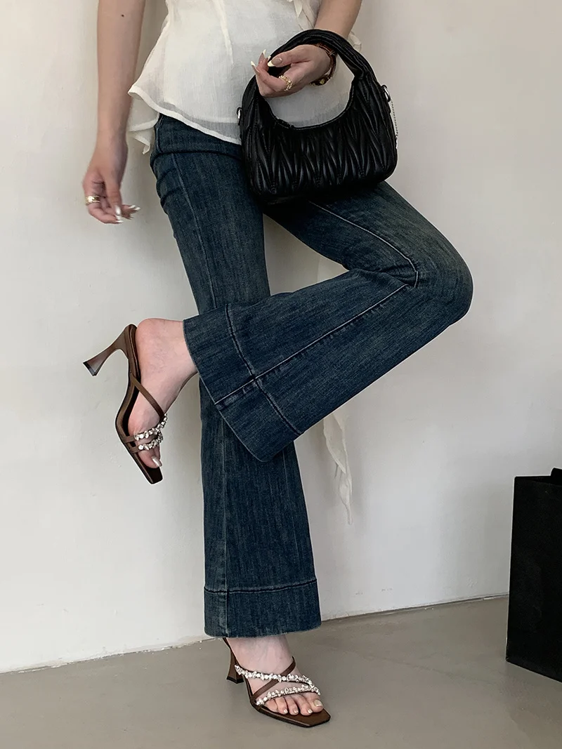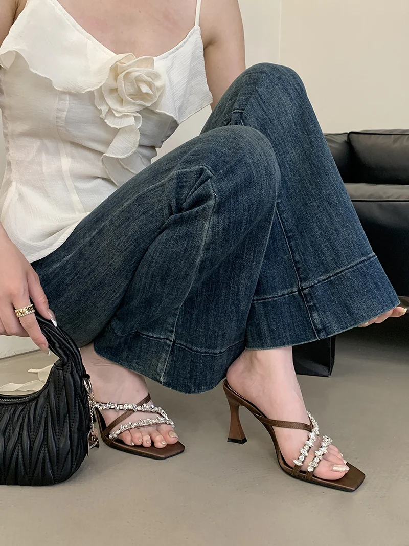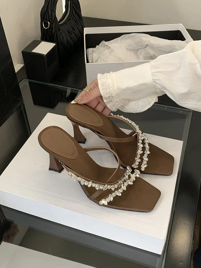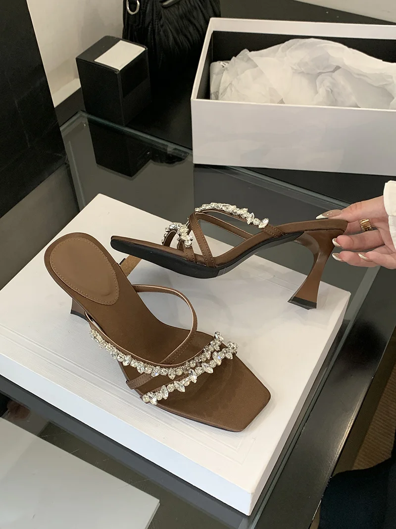 KYLETHOMASW  -  Street Style Crystal Rhinestone Silk Women Slippers Sandals Fashion Open Toe Thin High Heels Stripper Party Slides Shoes