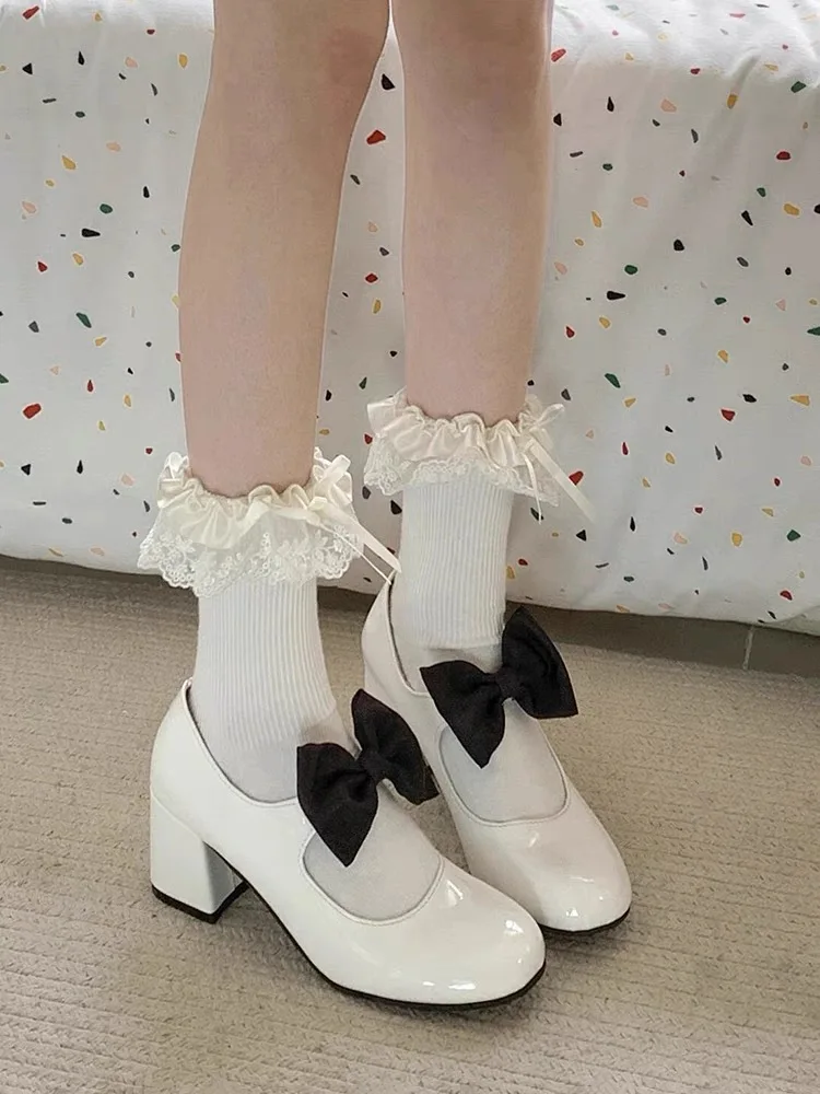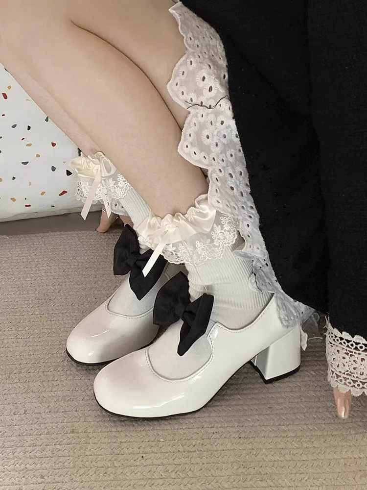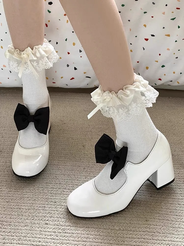 KYLETHOMASW - Sweet Round Toe Mary Janes Bow Detail Block Middle Heels Fashion Classic Women Dress Party Summer Casual Shoes