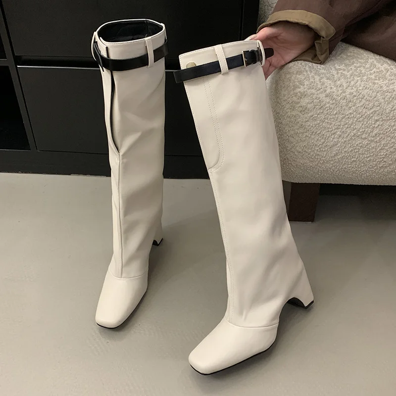 KYLETHOMASW - White Square Toe Belt Buckle Shaped Heel Knight Boots Woman Winter 2025 Black Slip-On Thick Heel Knee-High Boots Shoes for Women