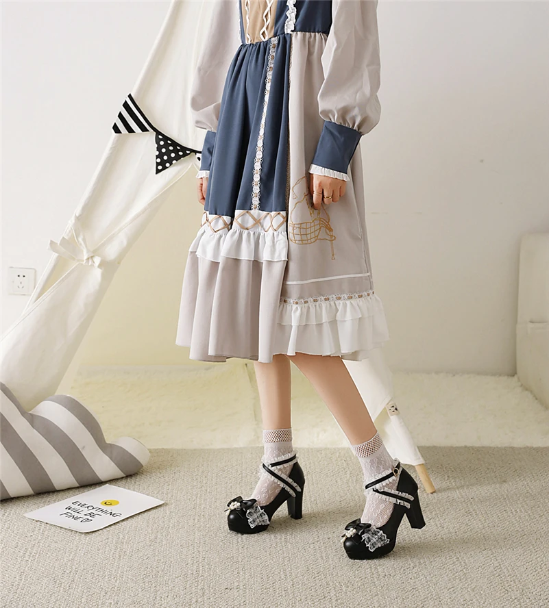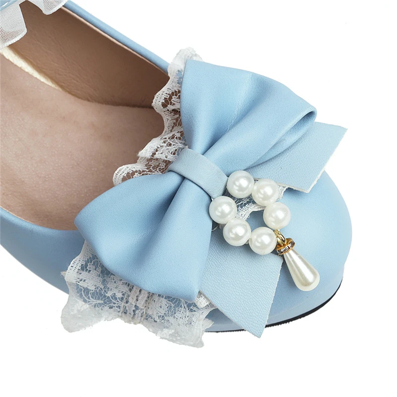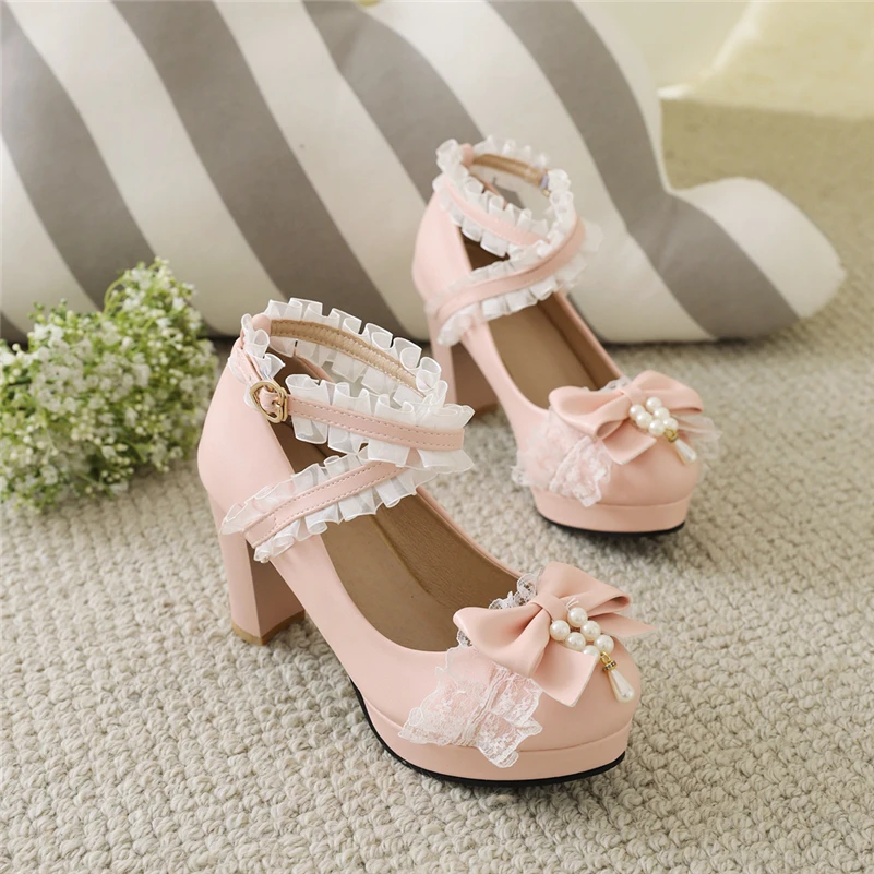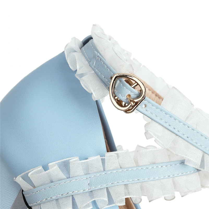 KYLETHOMASW - Woman Lolita Style Ankle Strap Shoes Platform Block High Heels Pumps Round Toe Bow Buckle Lady Footwear Spring 46 Blue