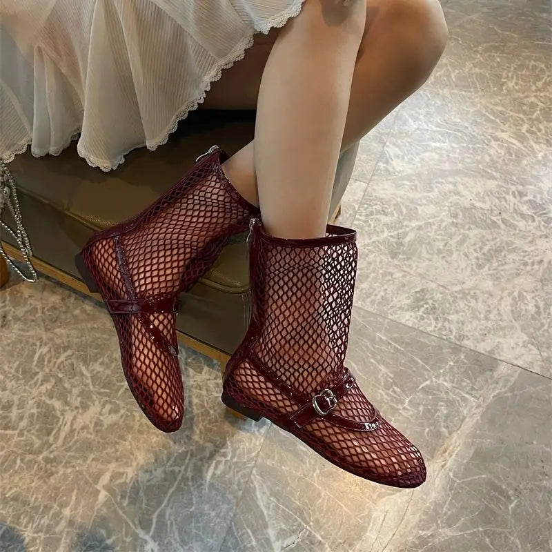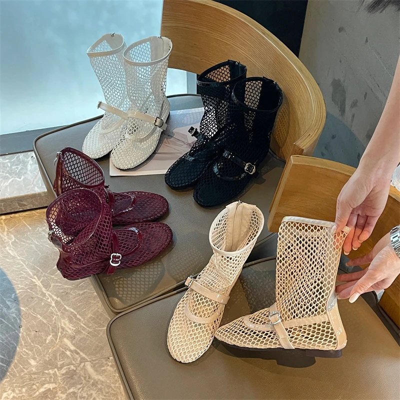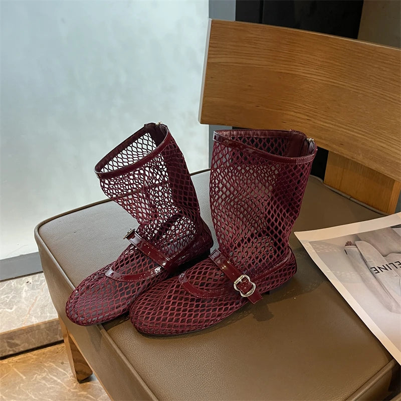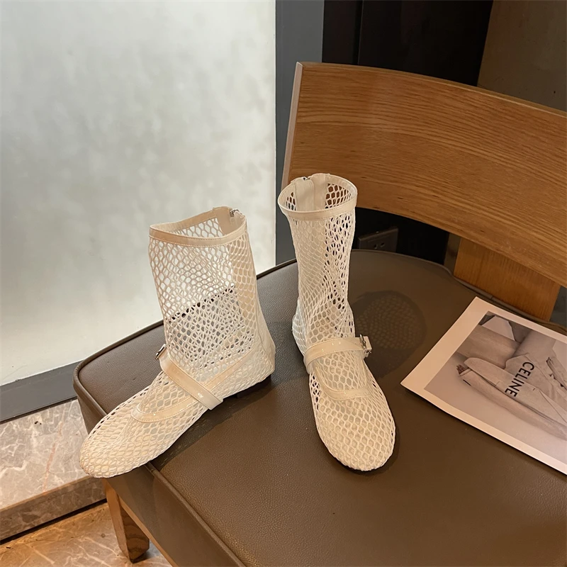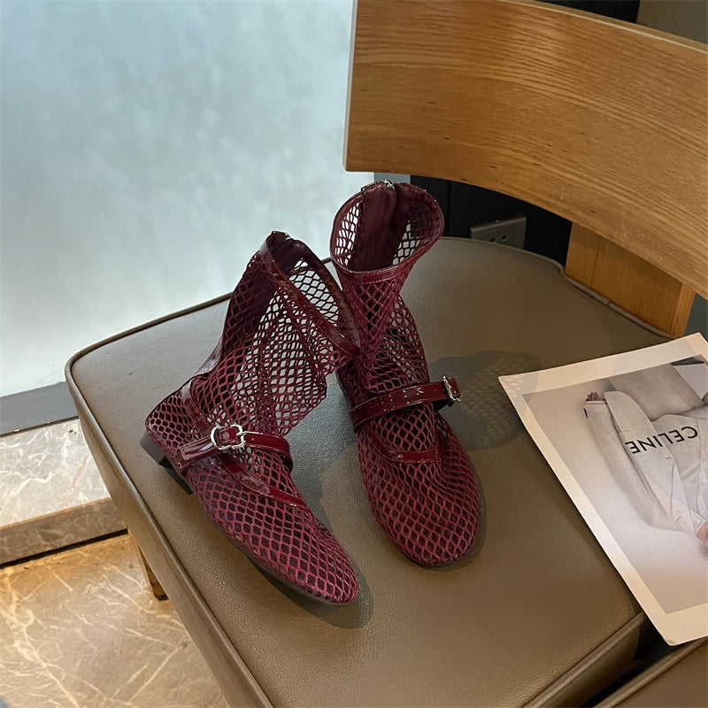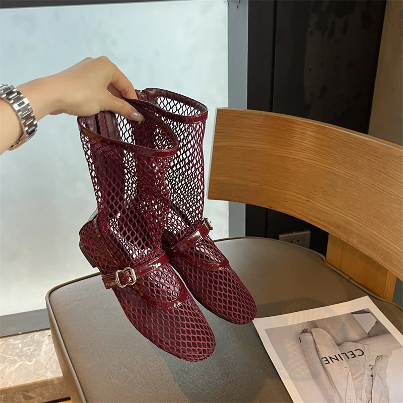 KYLETHOMASW - Woman Summer Ankle Boots Burgundy Mesh Flat Shoes Porosity Round Toe Low Heels Ladies Shoes White Flats Size 43 Botas Feminino