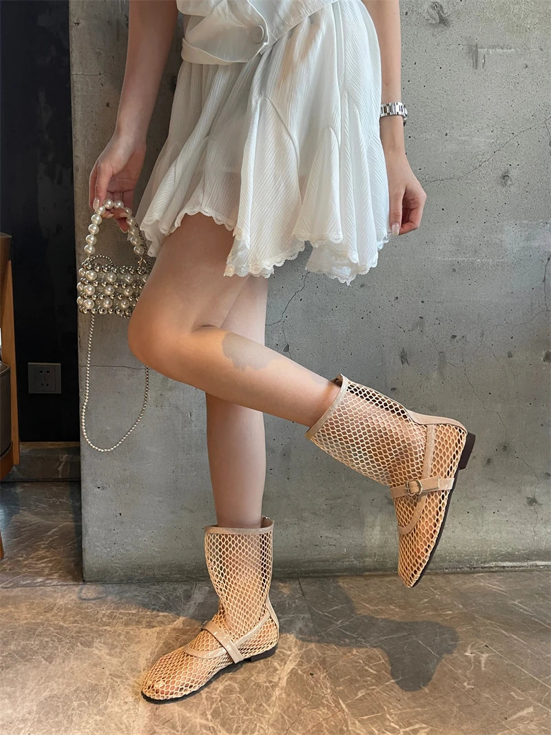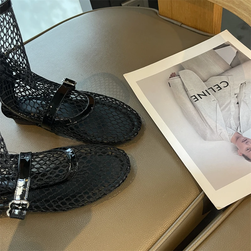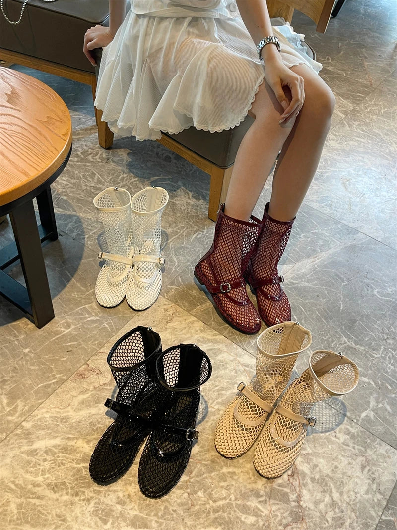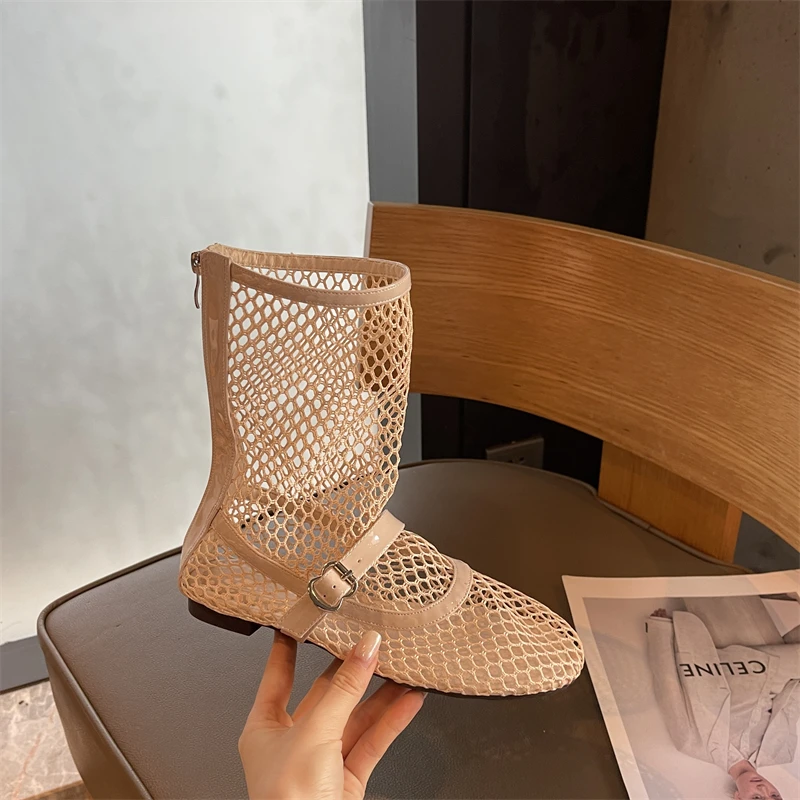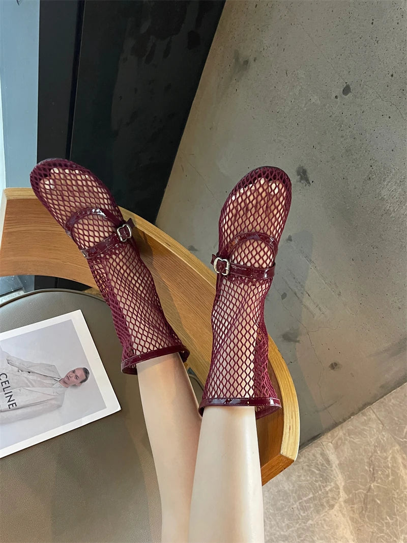 KYLETHOMASW - Woman Summer Ankle Boots Burgundy Mesh Flat Shoes Porosity Round Toe Low Heels Ladies Shoes White Flats Size 43 Botas Feminino