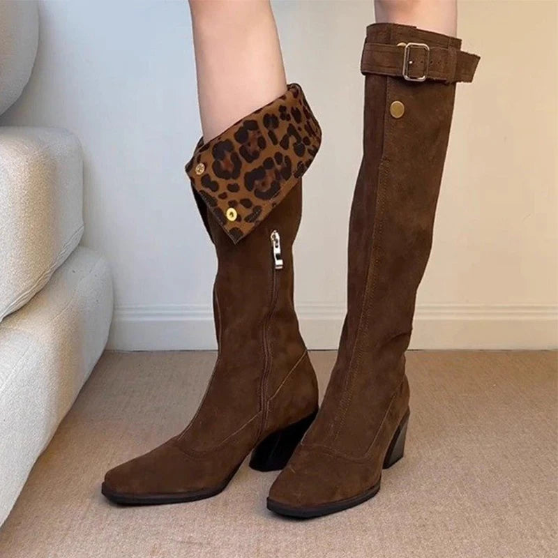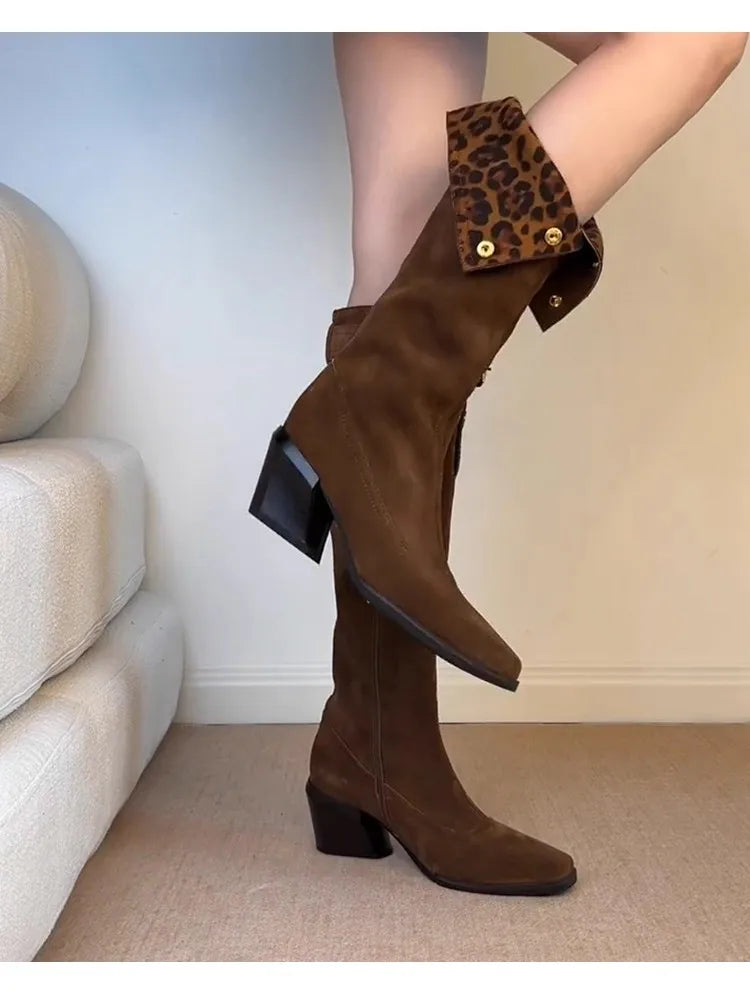 KYLETHOMASW - Women Leopard Knee High Boots Sexy High Heels Shoes Winter Warm Long Boots New Suede Pumps Chunky Chelsea Boots Snow Botas