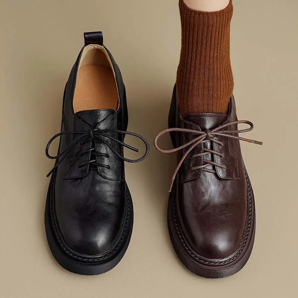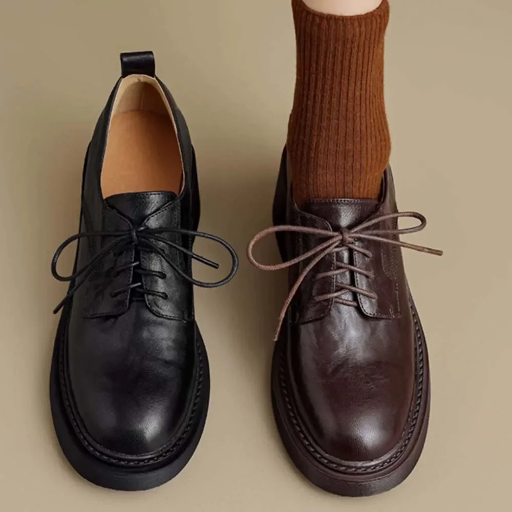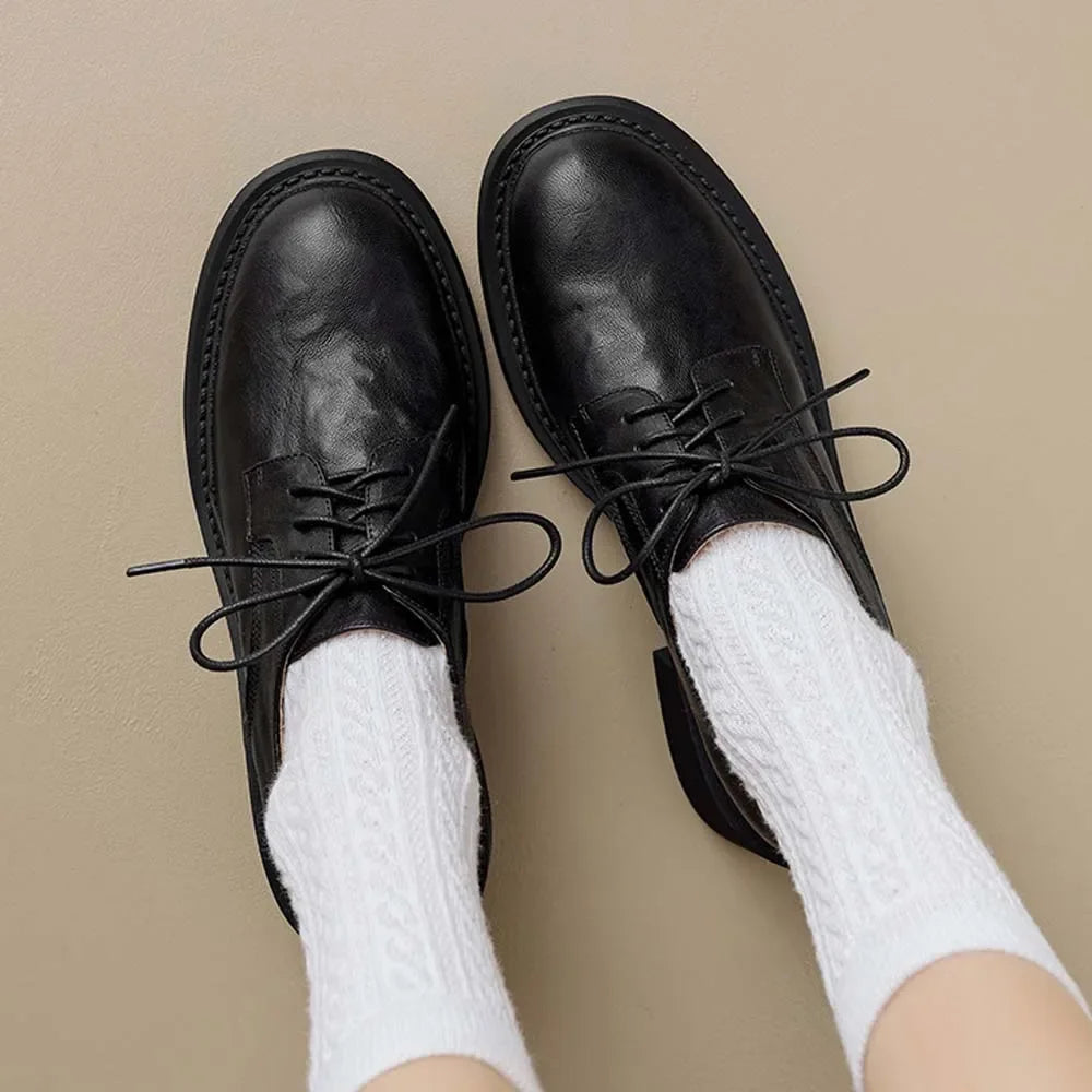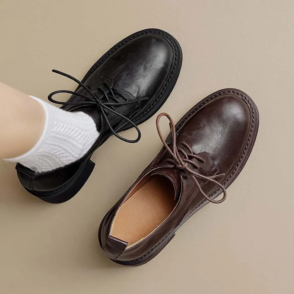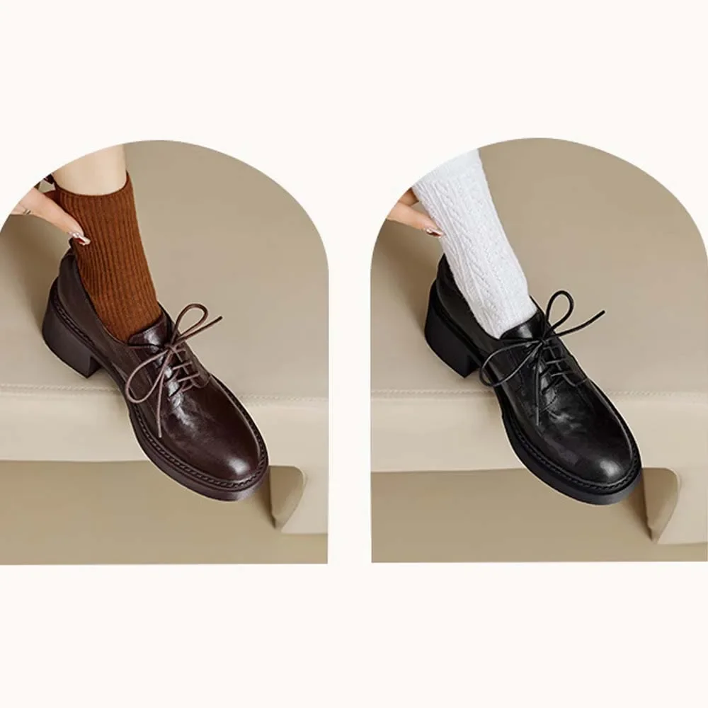 KYLETHOMASW - Womens Cowhide Lace Up Flat Shoes Oxford Round Toe Retro British High-Quality Soft Comfortable All Season Daily Shoes