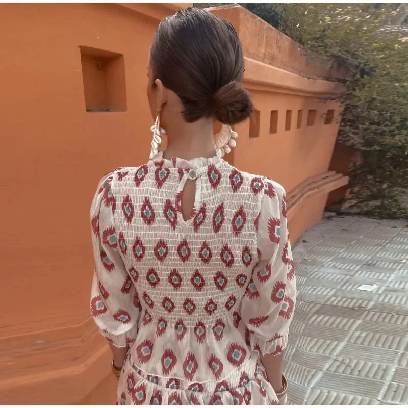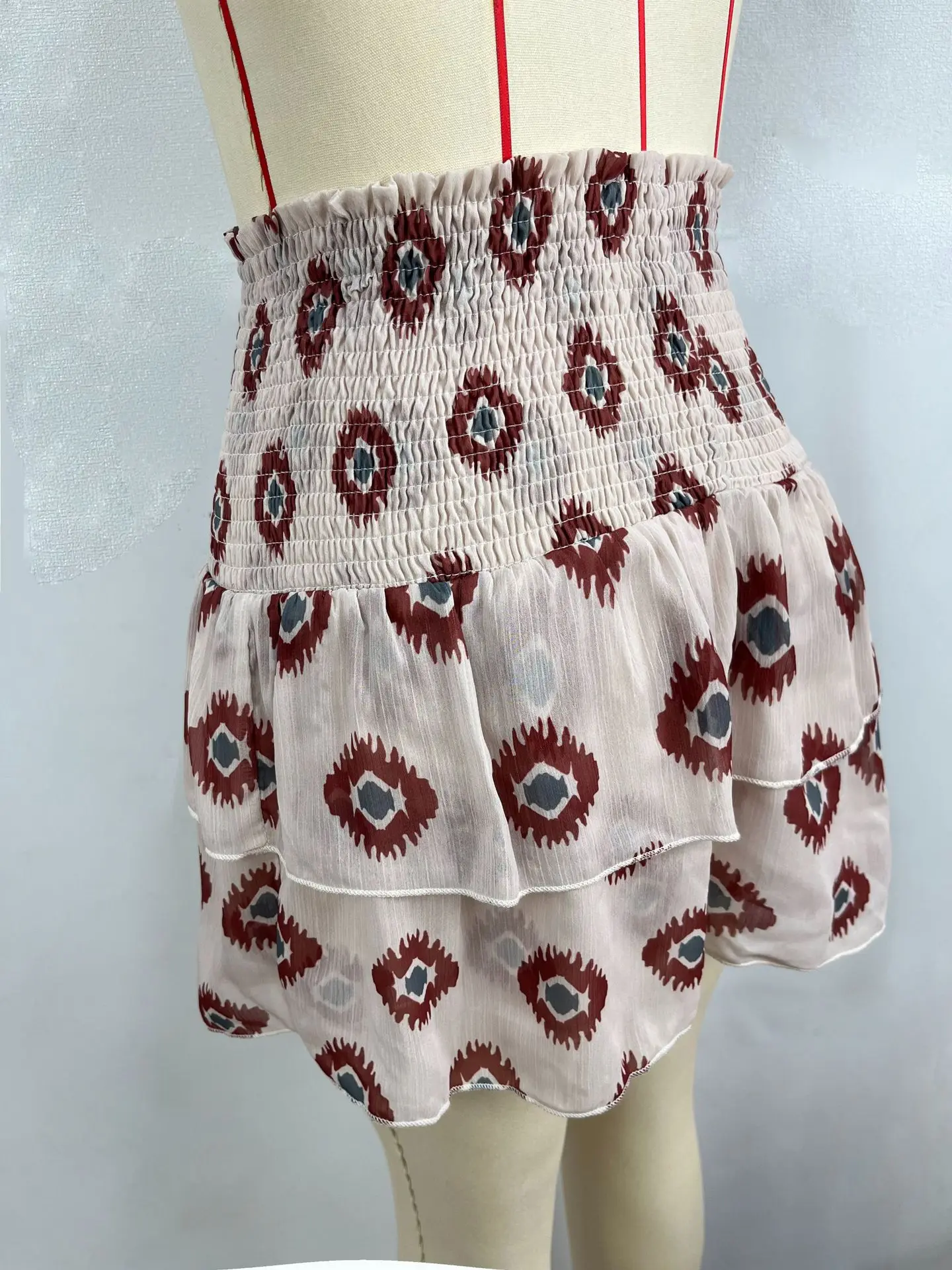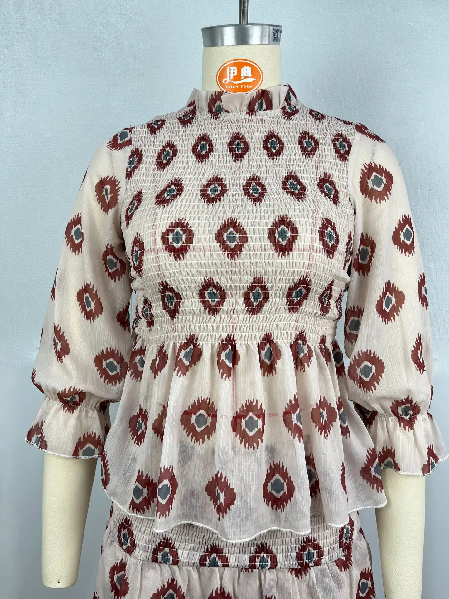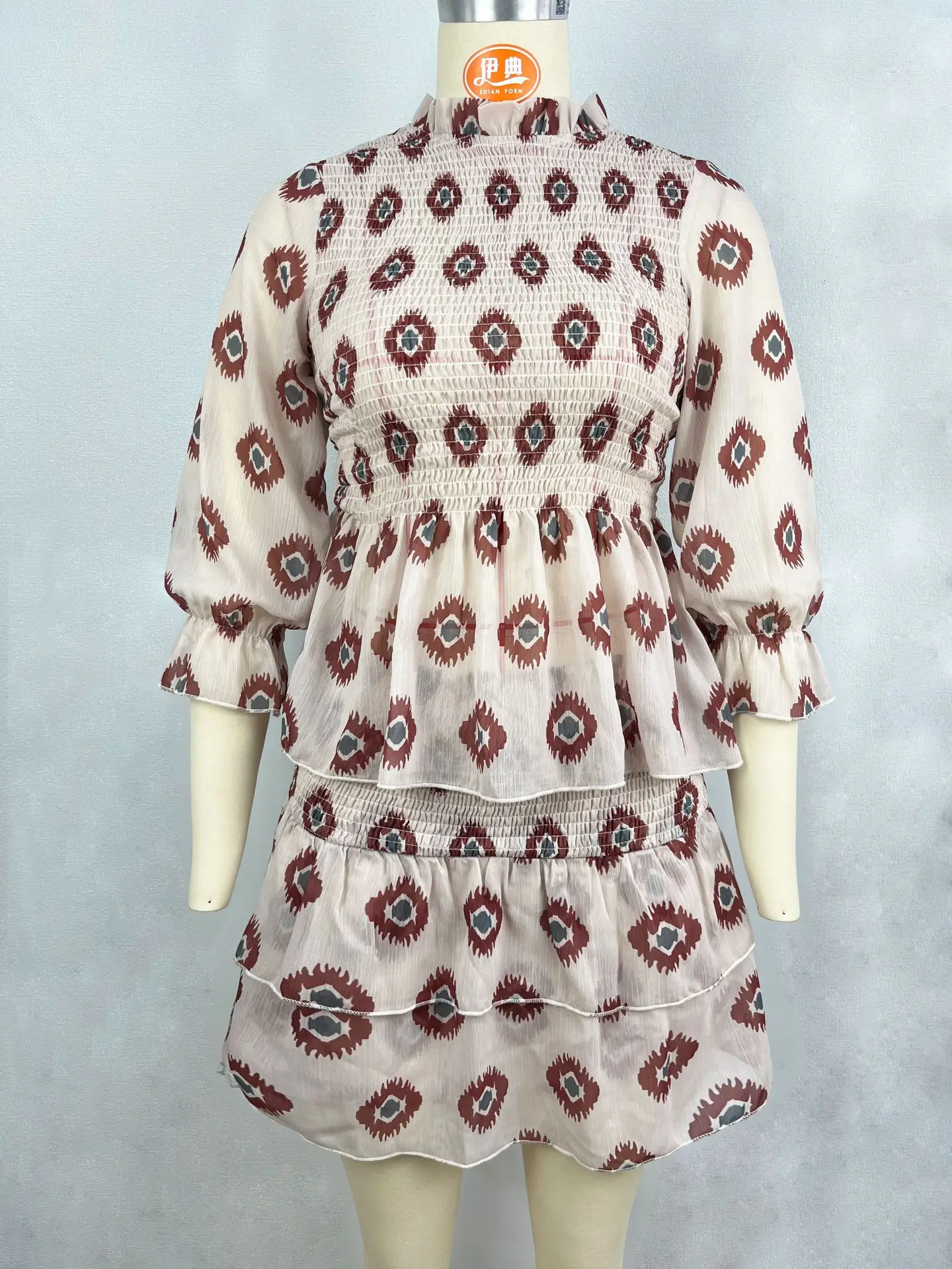 Kylethomasw 2024 New Woman Ruffles Hem Mini Printed Shirt Skirt 2 Piece Set Female Puff Sleeve Blouse High Waist Mini Dress Suit Outfits