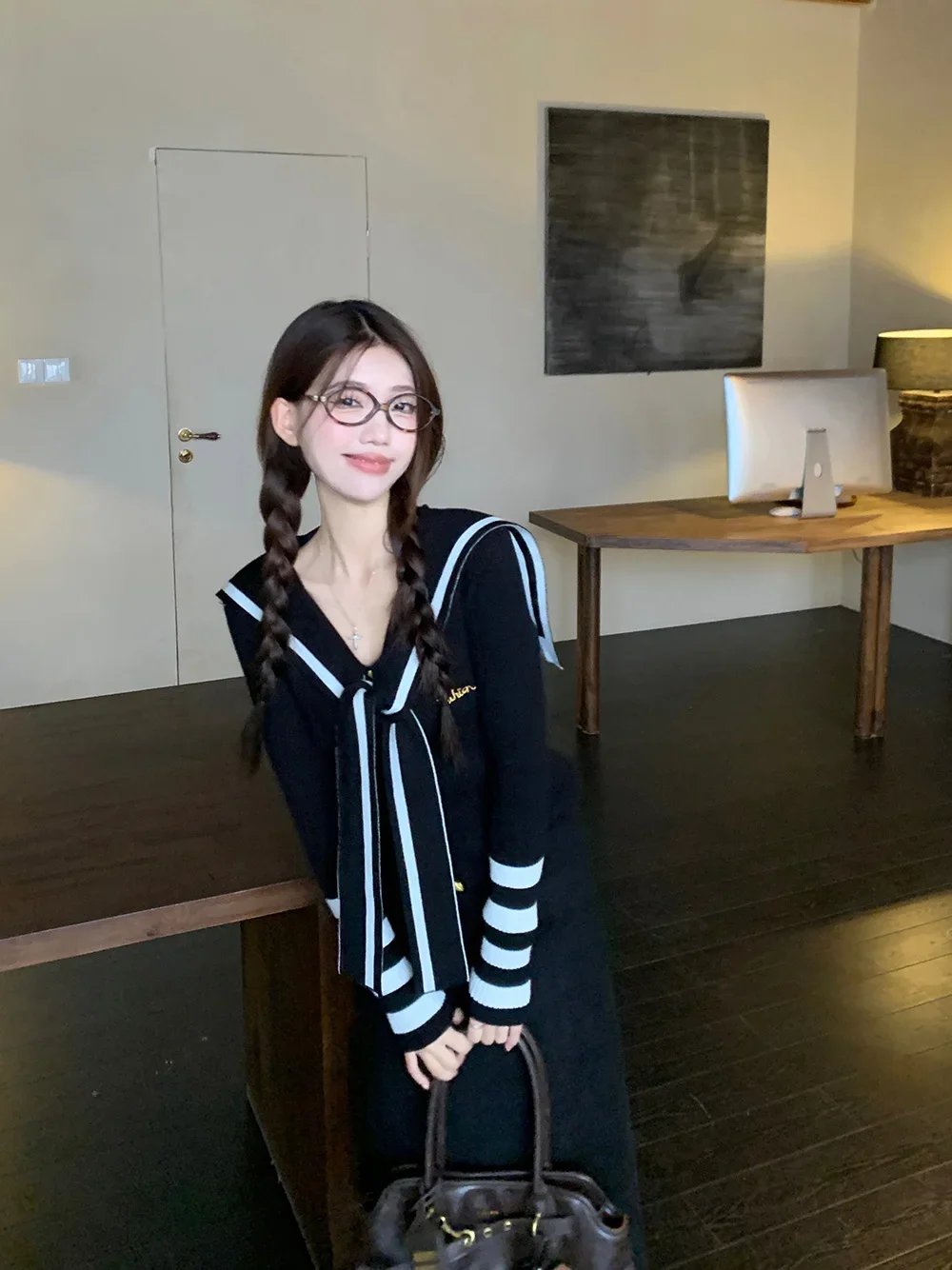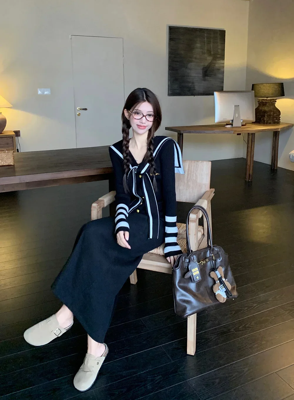 Kylethomasw Autumn New Japanese Contrast Color Patchwork Lace-up Long Sleeve Cardigan Women + Loose Knitted A-line Skirt Two-piece Suit