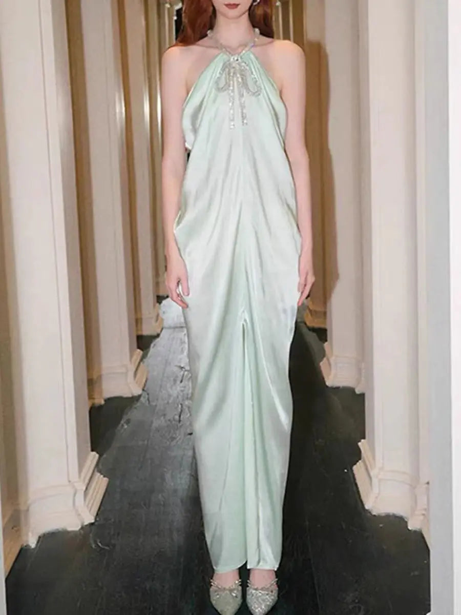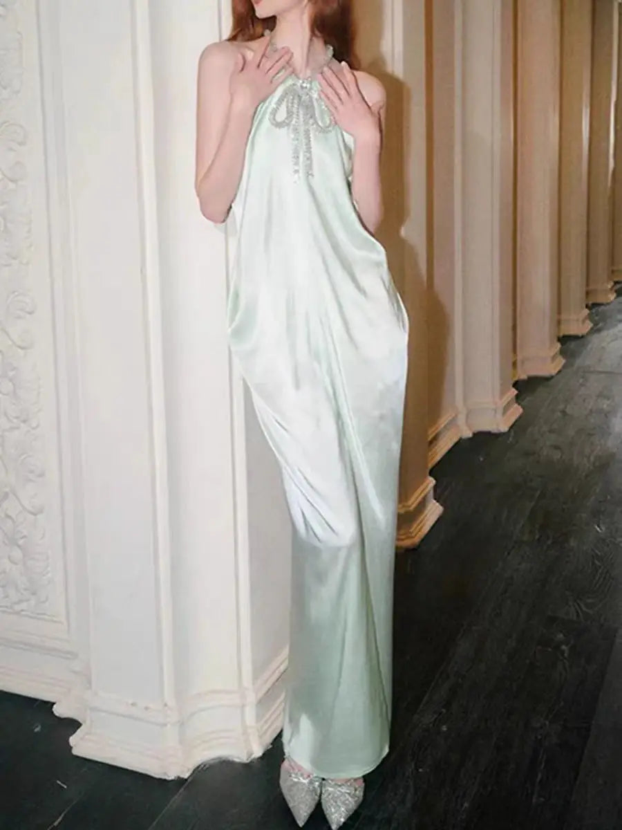 KYLETHOMASW - Dresse for Women Summer High-end Advanced French Elegant Style Temperature Diamond Chain Bow Halter Neck Draped Slit Sling Skirt