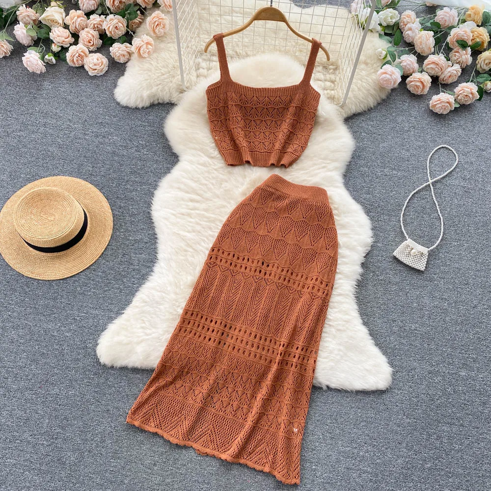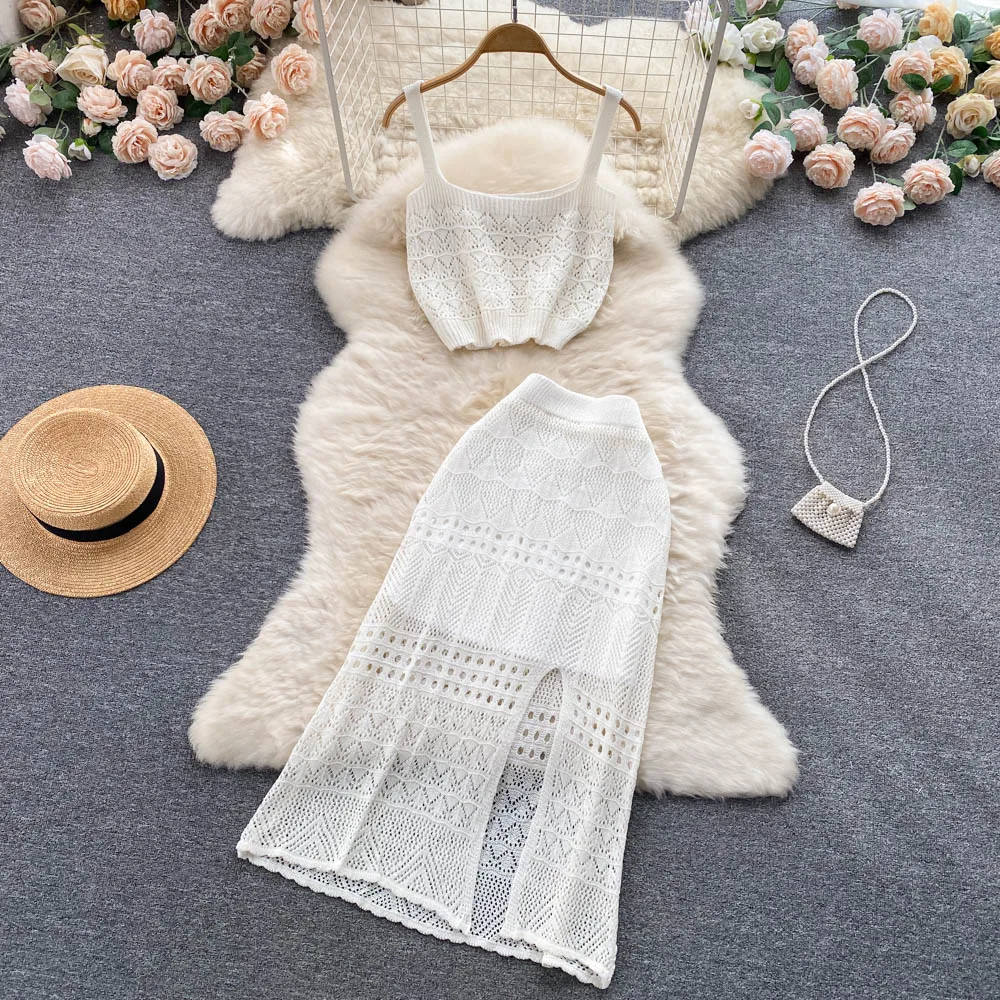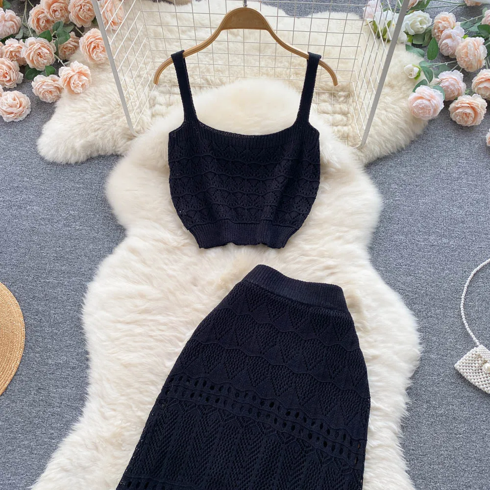 Kylethomasw Elegant Hollow Out Knitted Skirt 2 Piece Set Women Summer Casual Sleeveless Tank Tops Hight Waist Slim Skirt Outfits Clothes