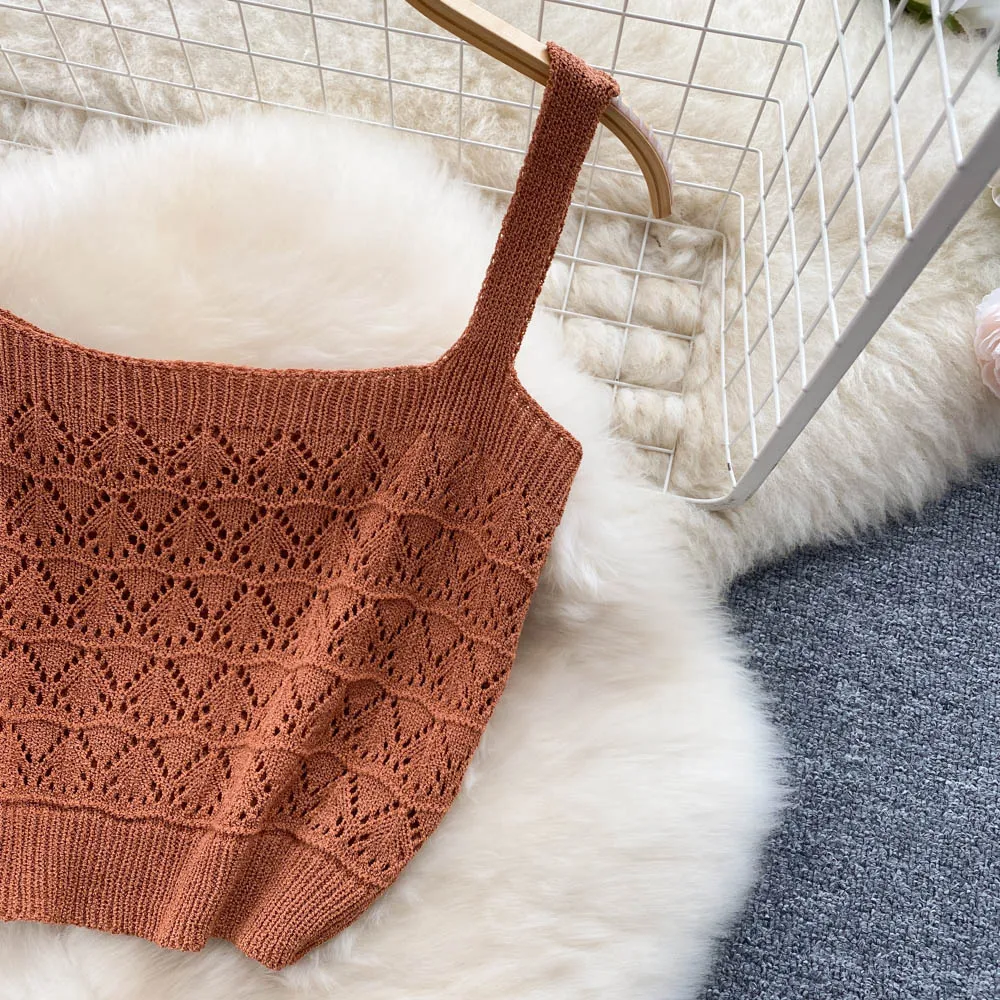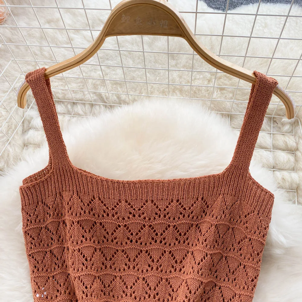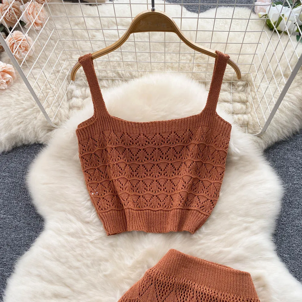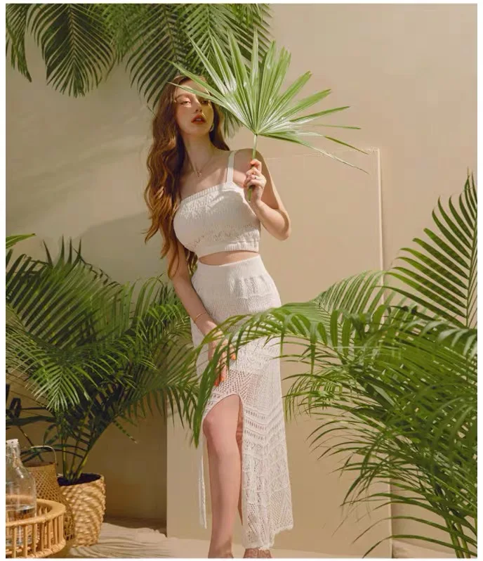 Kylethomasw Elegant Hollow Out Knitted Skirt 2 Piece Set Women Summer Casual Sleeveless Tank Tops Hight Waist Slim Skirt Outfits Clothes