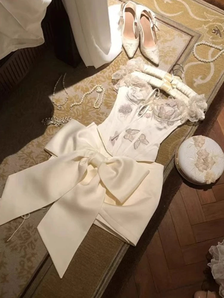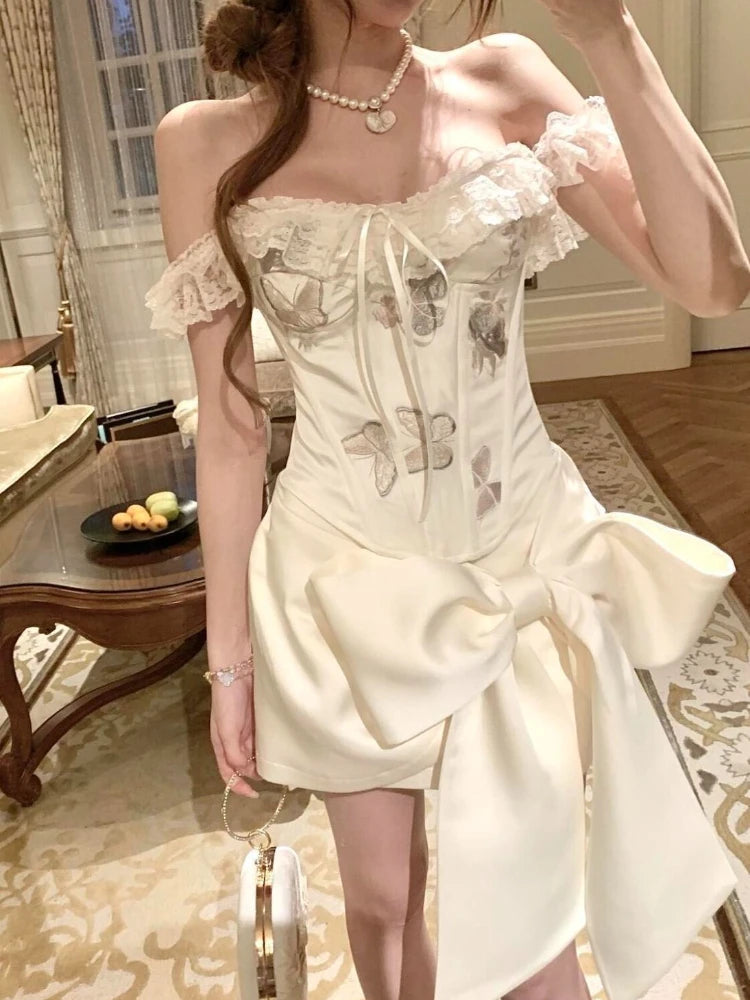 KYLETHOMASW - French Hottie Vintage Elegant Women 2 Piece Set Y2k Design Lace Tops + Chic Bow Mini Skirt Female Princess Party Dress Outfits
