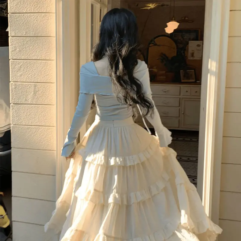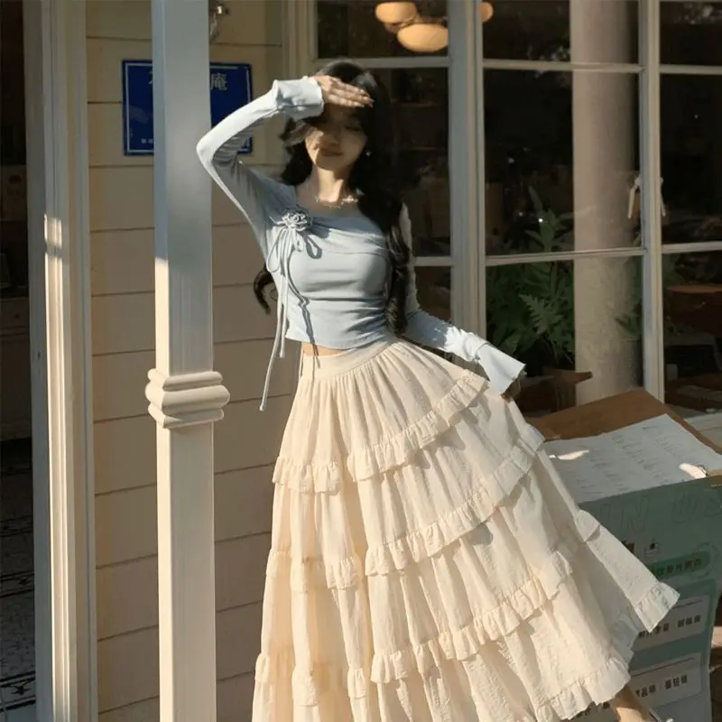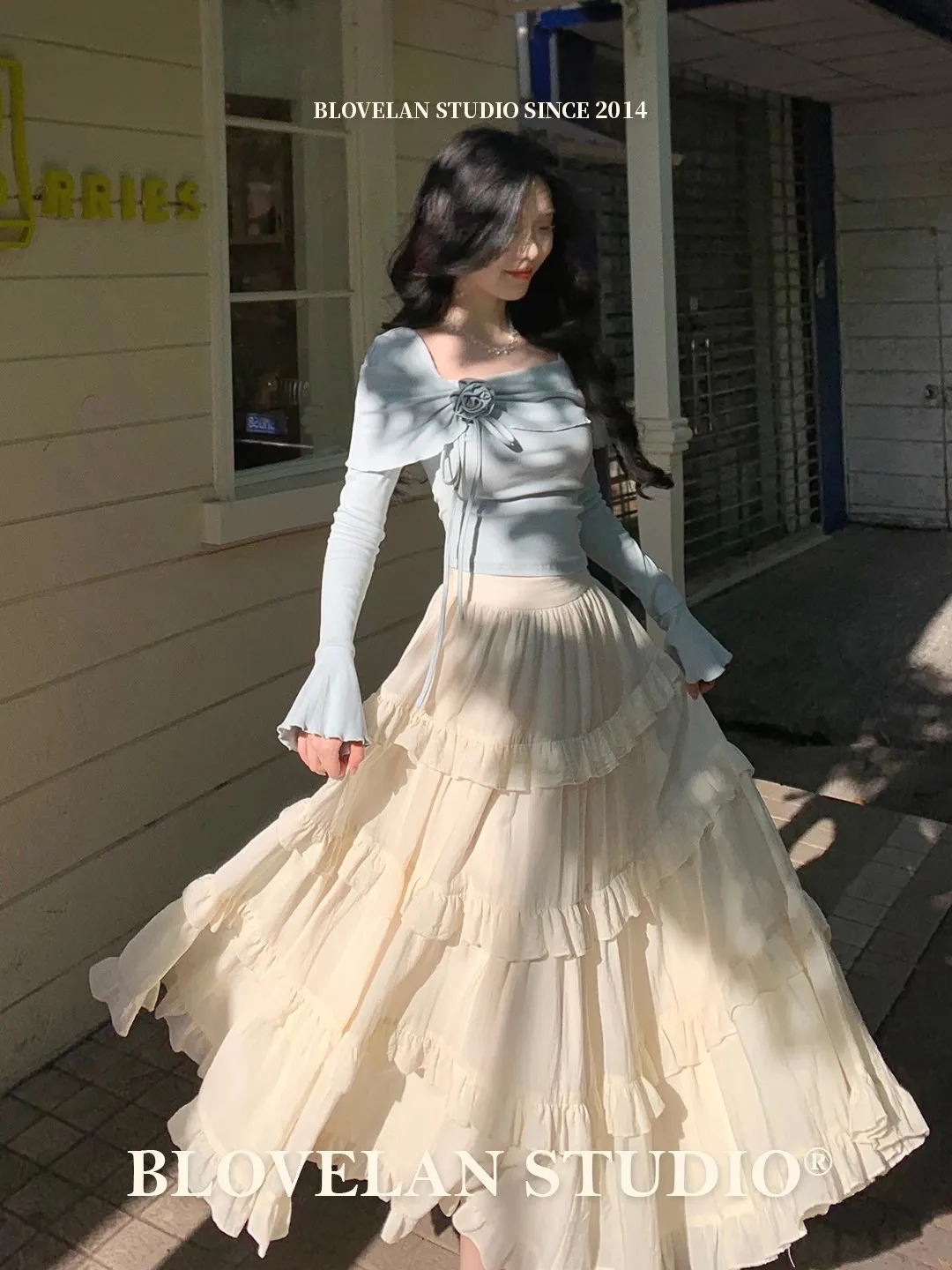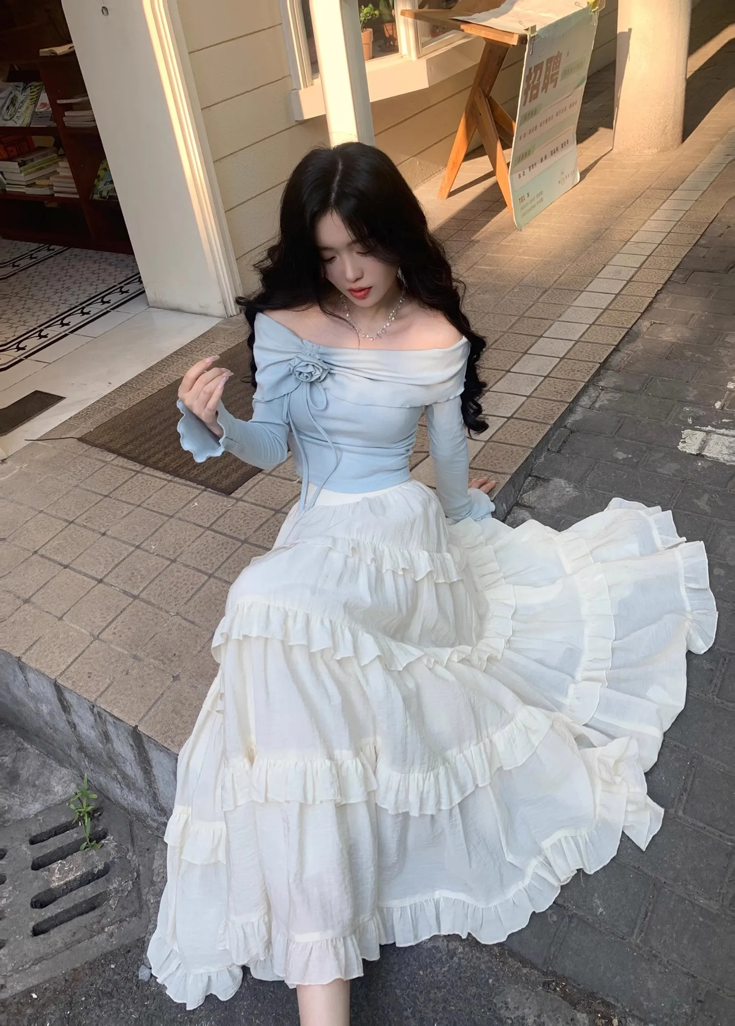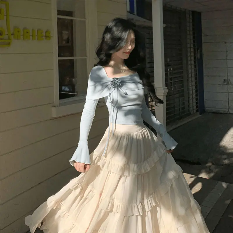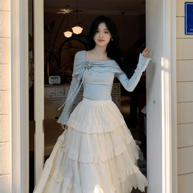 KYLETHOMASW - Korean Elegant Outfits Two Piece Skirt Set Women Off Shoulder Long Sleeve Blue Tops +High Waist A-line Midi Skirt Autumn New
