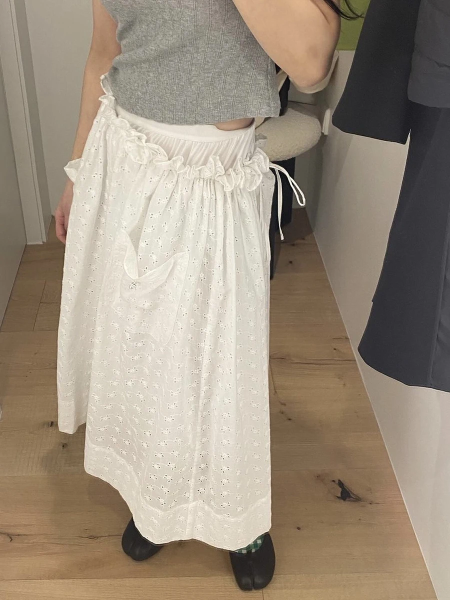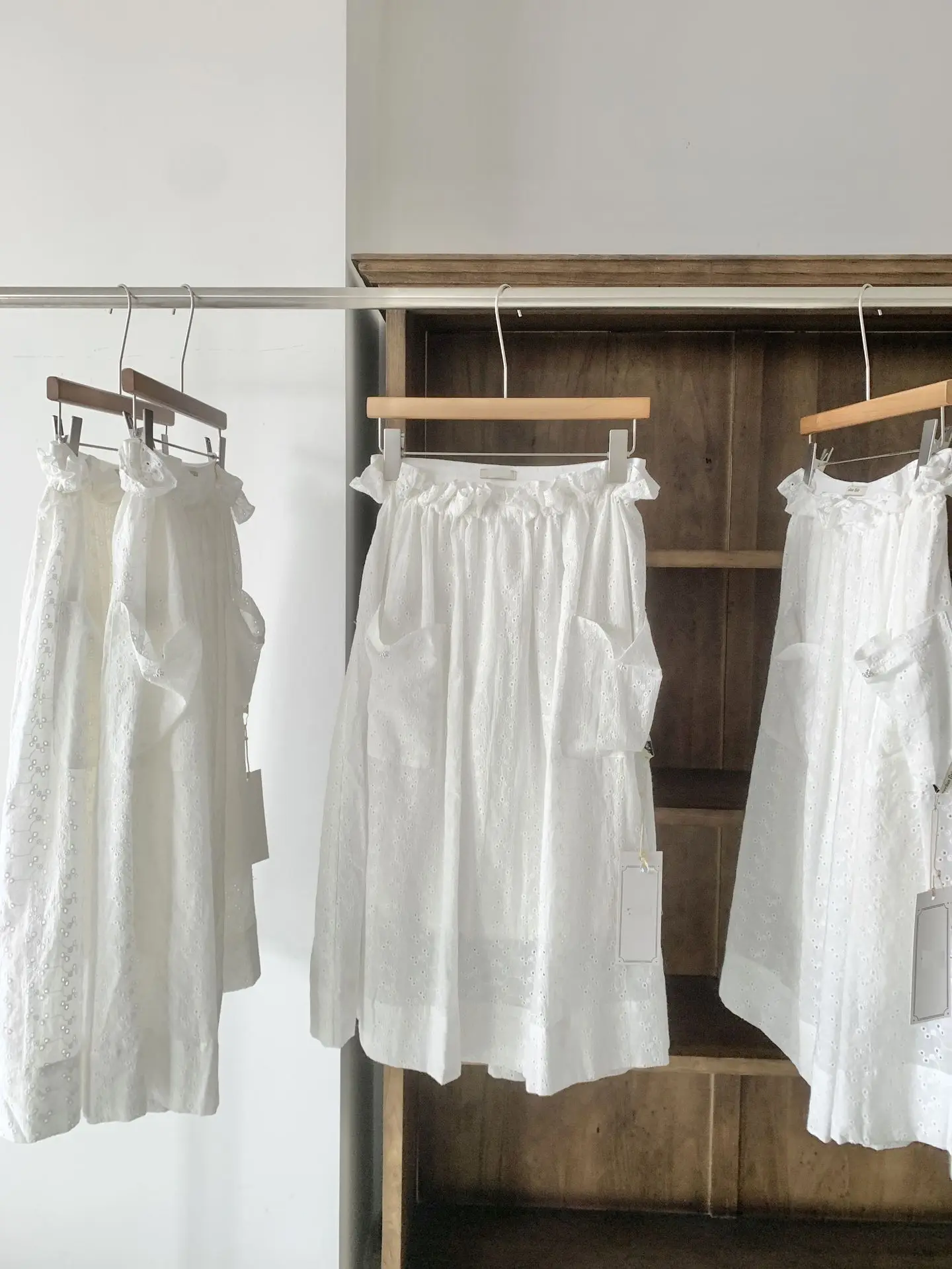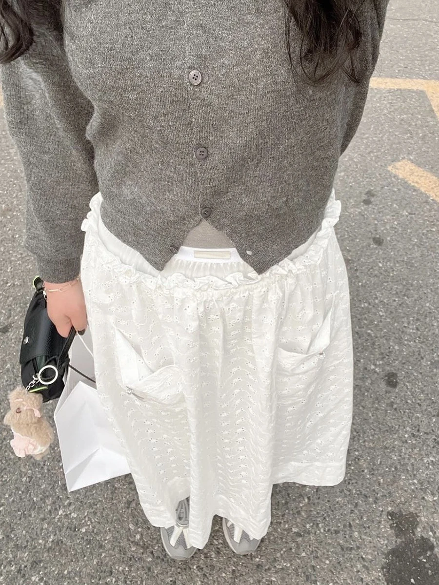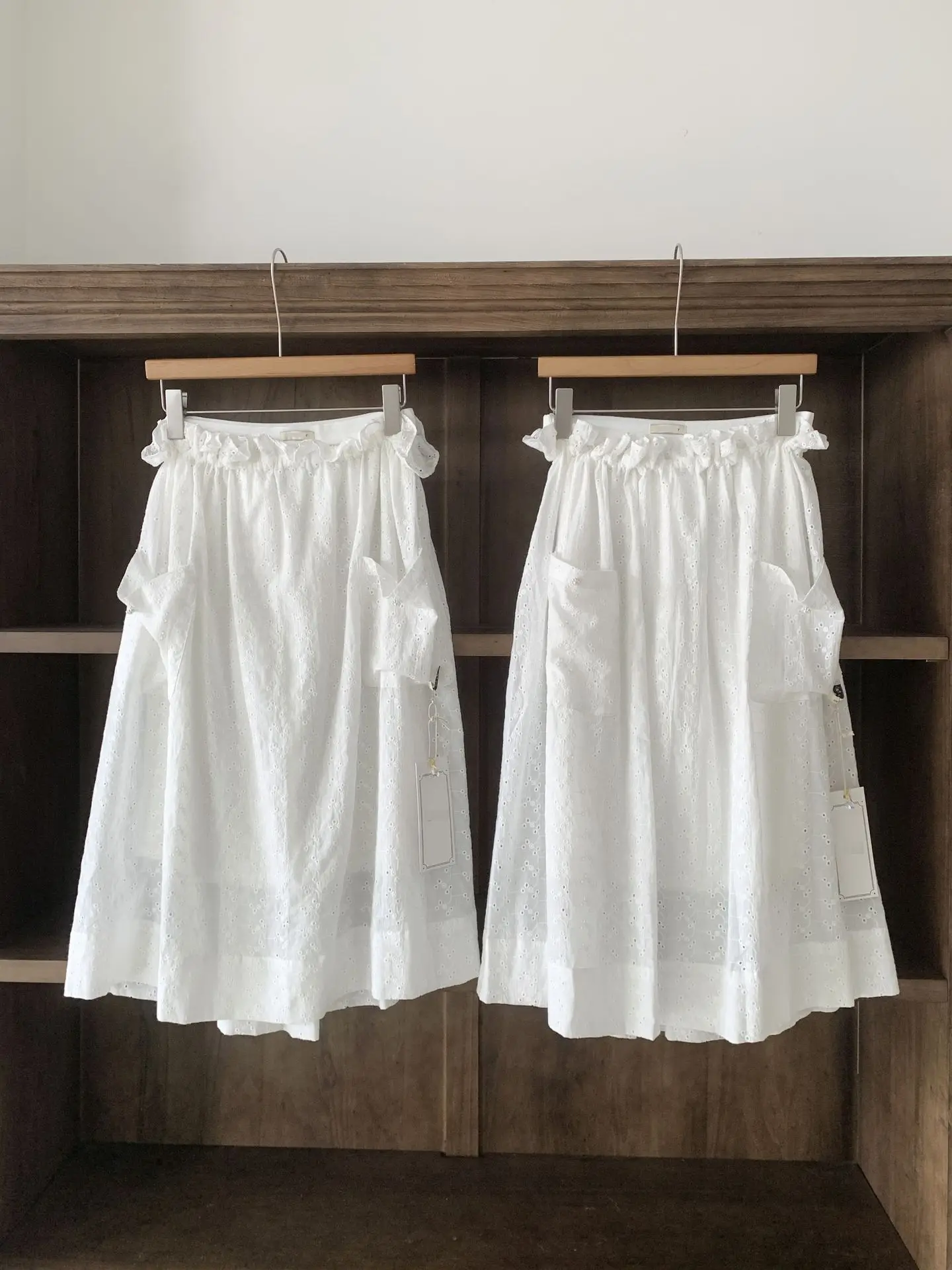 Kylethomasw - Korean Fashion White Hollow Out Midi Skirts Women Summer High Waist Ruffle Pocket Long Skirt Elegant Casual Faldas Lady 2024 New