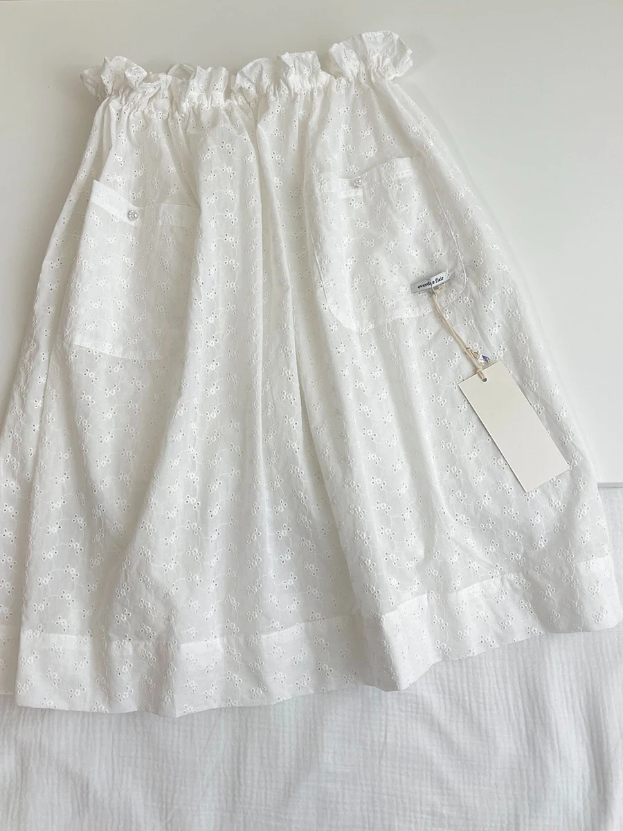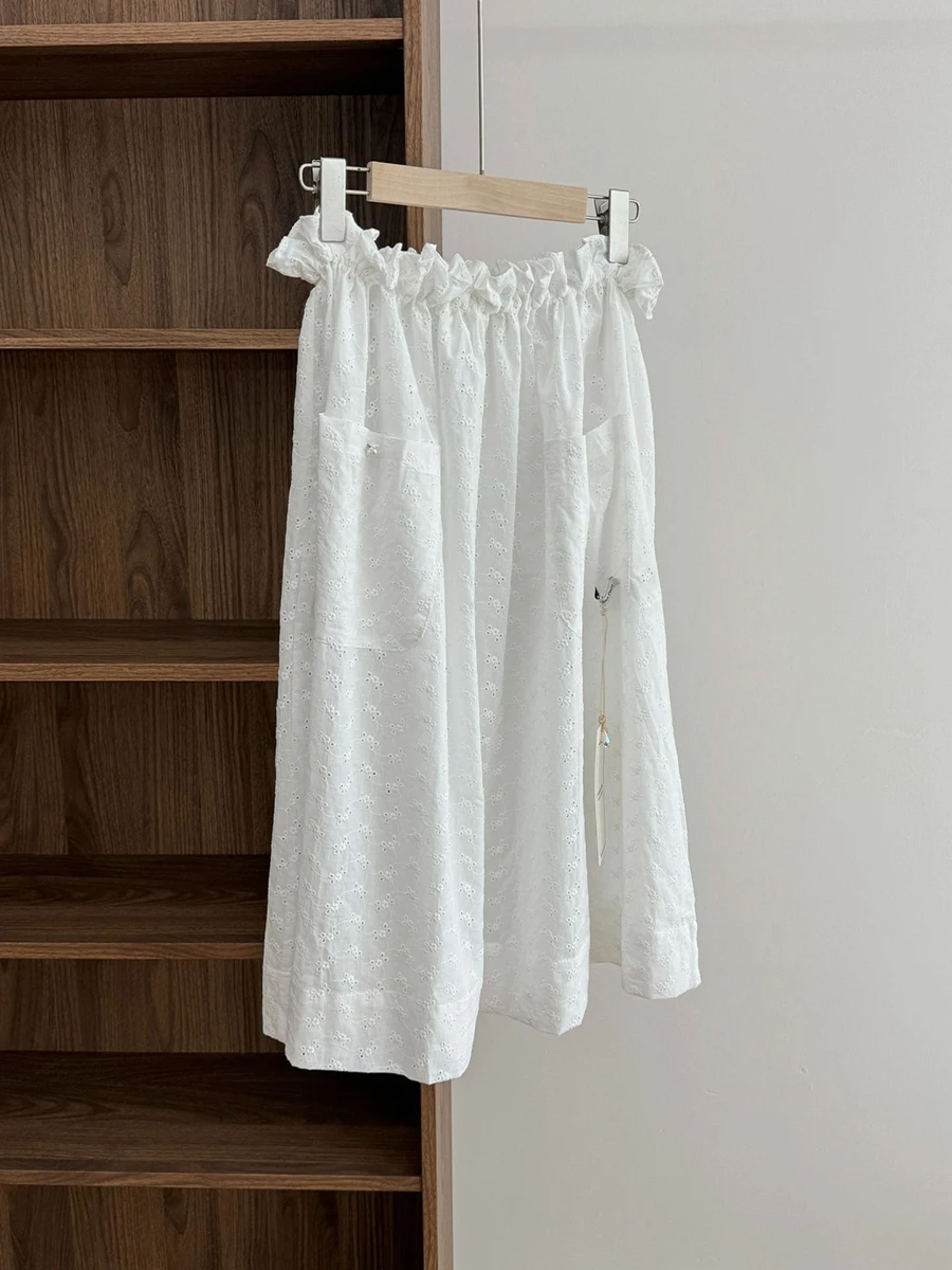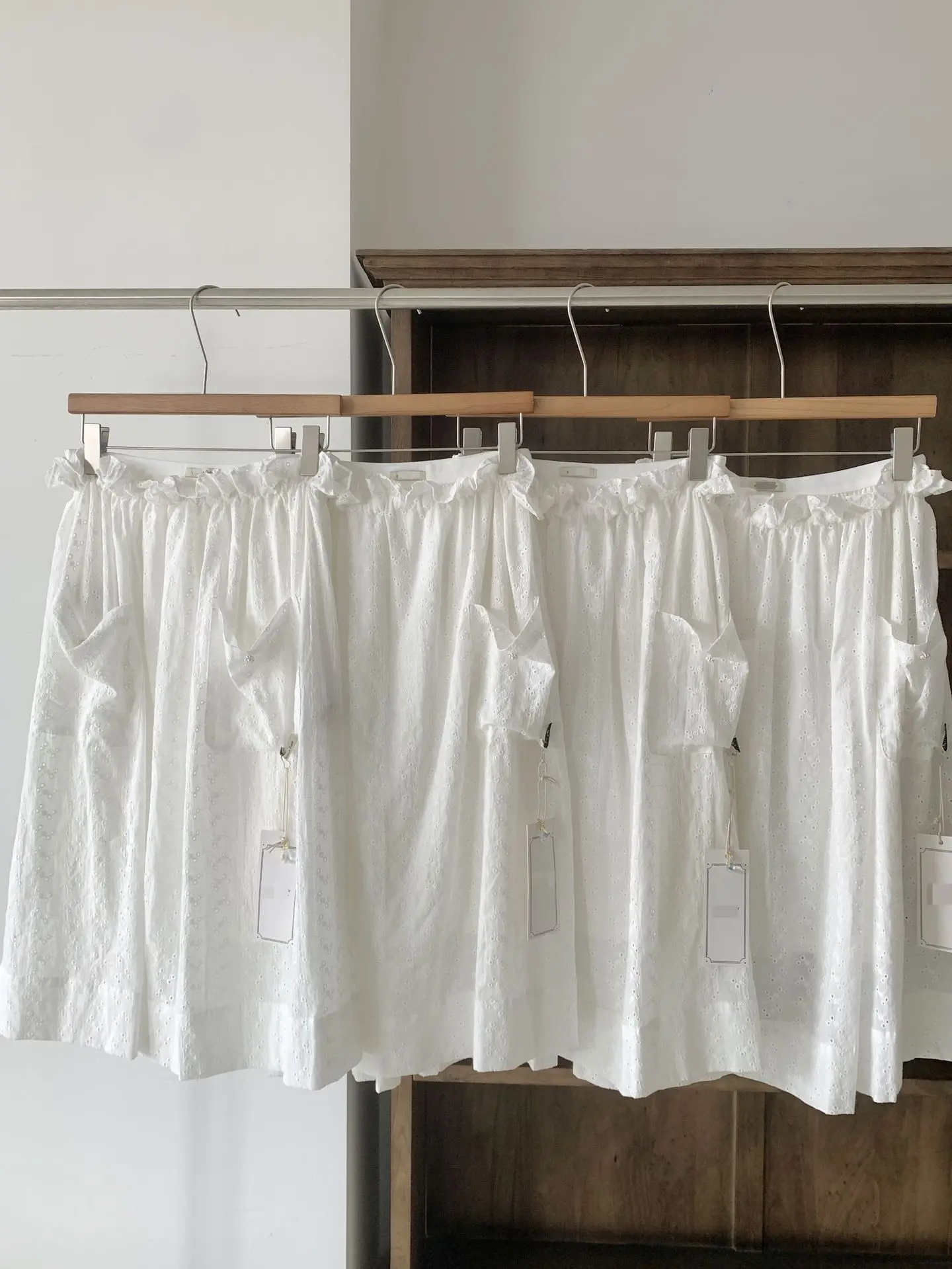 Kylethomasw - Korean Fashion White Hollow Out Midi Skirts Women Summer High Waist Ruffle Pocket Long Skirt Elegant Casual Faldas Lady 2024 New