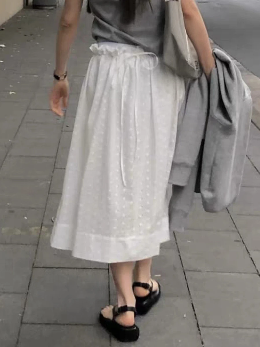 Kylethomasw   -  Korean Fashion White Hollow Out Midi Skirts Women Summer High Waist Ruffle Pocket Long Skirt Elegant Casual Faldas Lady 2024 New