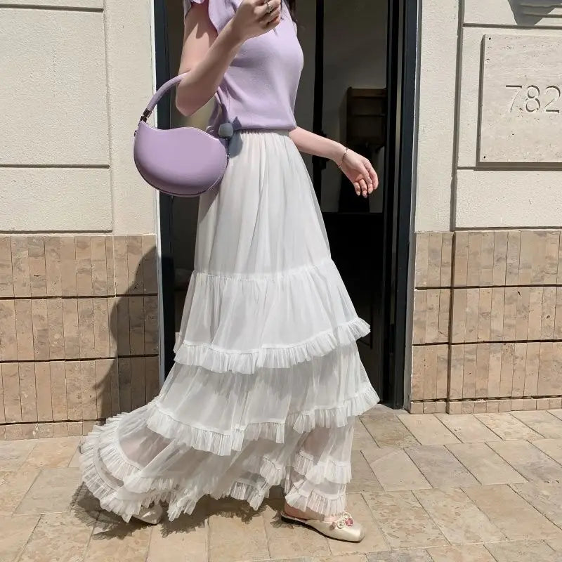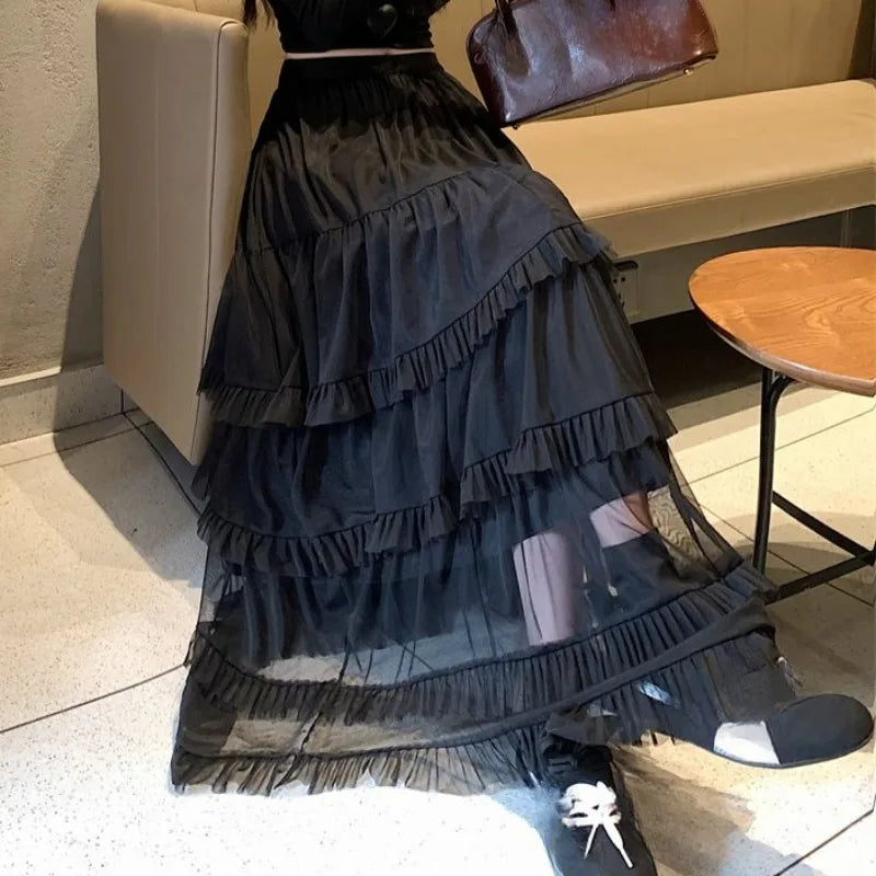 KYLETHOMASW - Long Skirts Mesh Ruffles Solid A-line Spring Summer Sweet Women Skirt Elegant Vintage High Waist Faldas Mujer