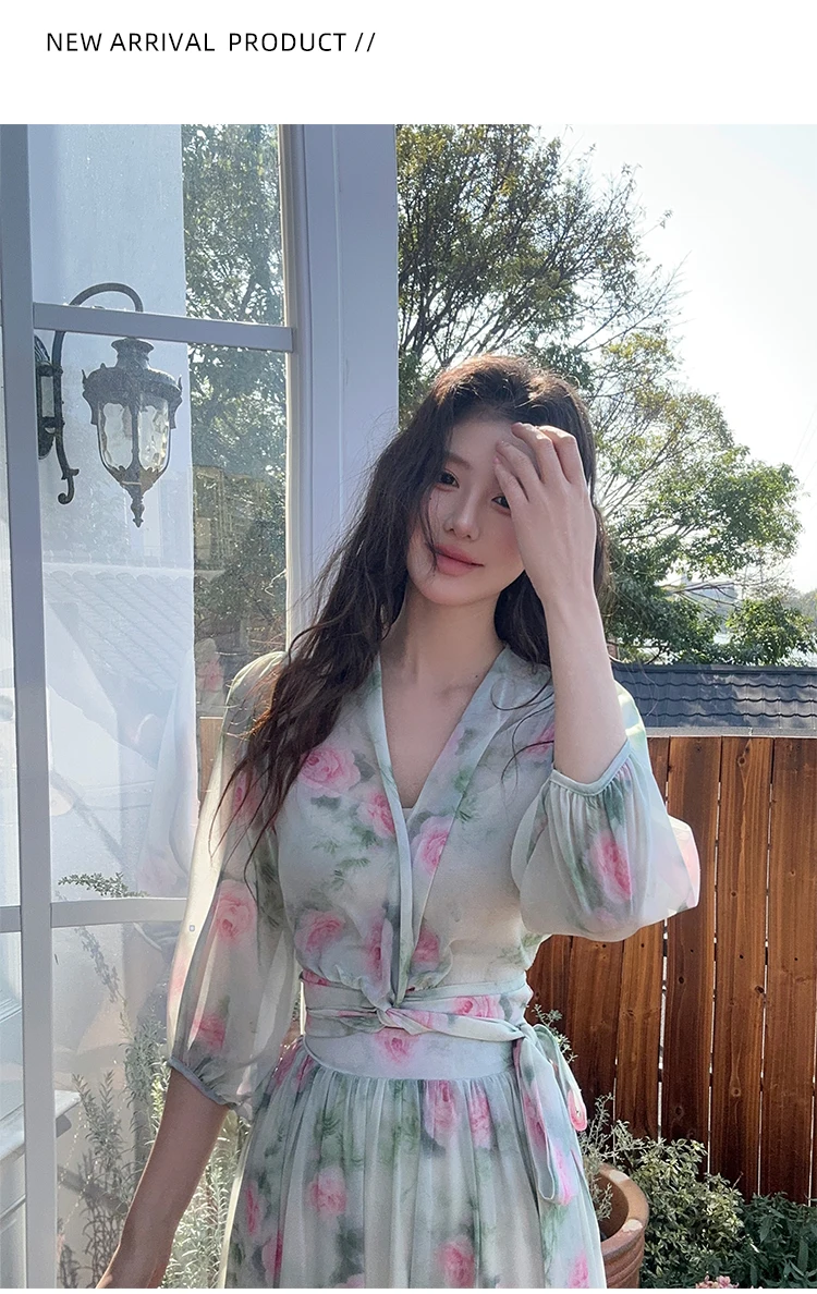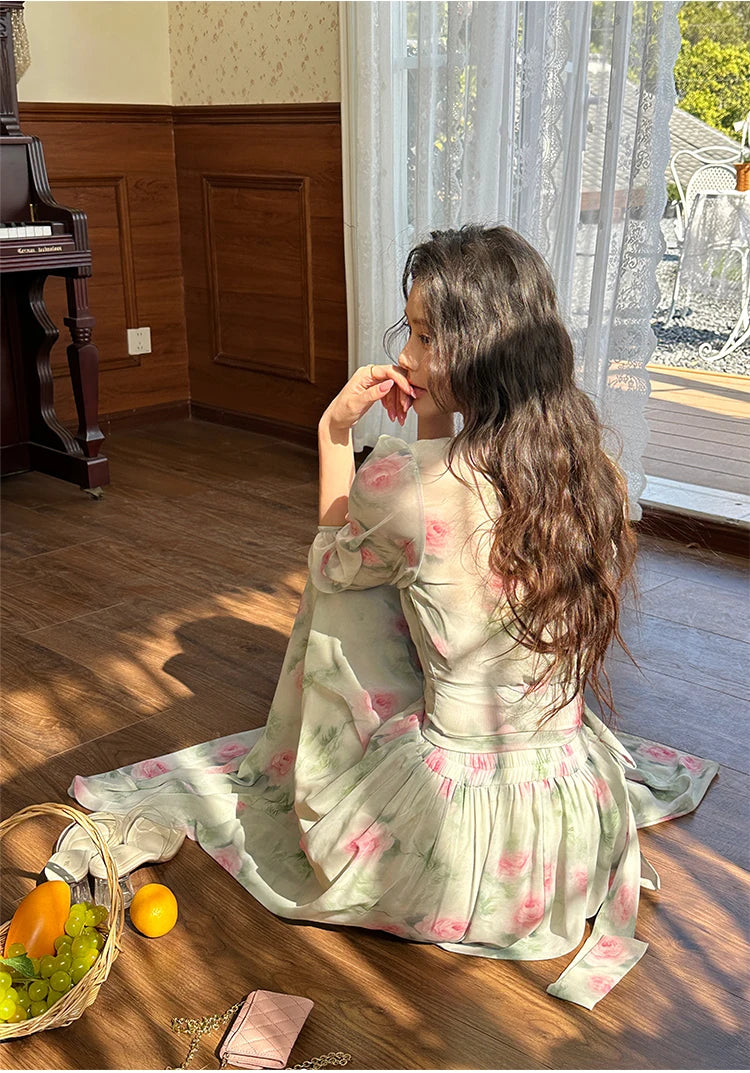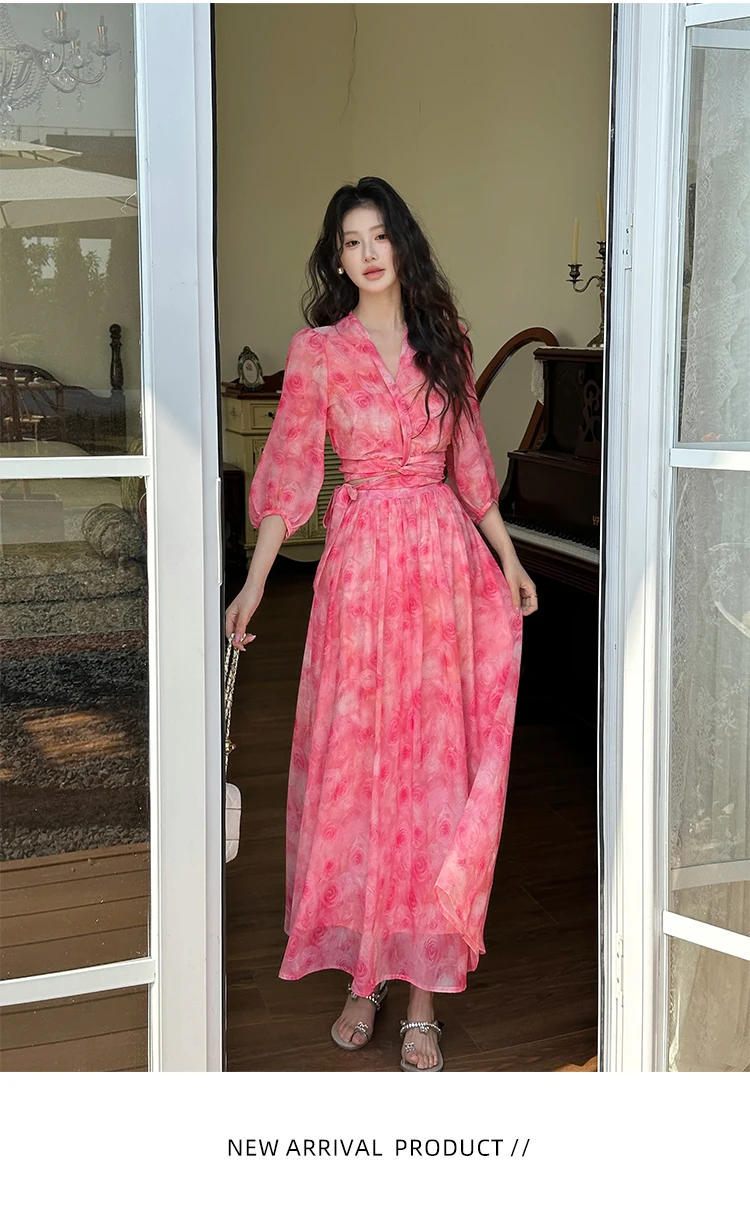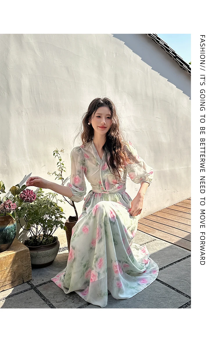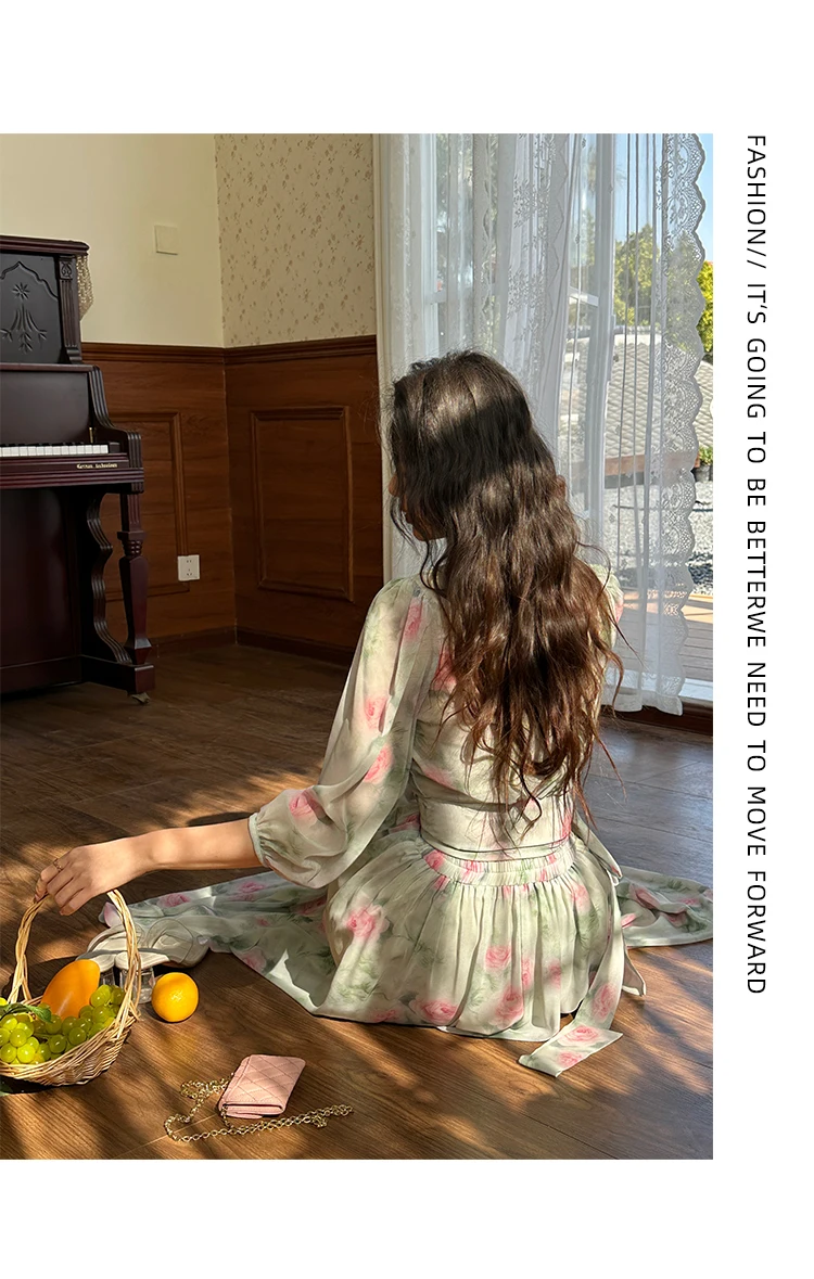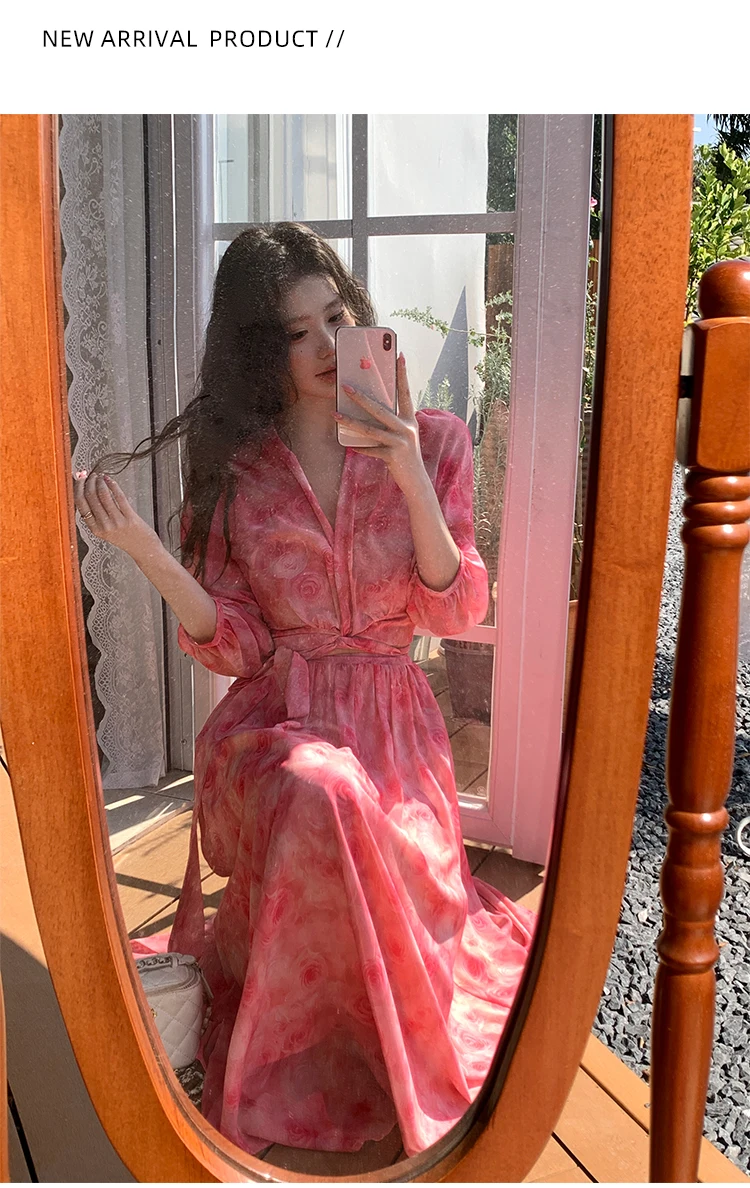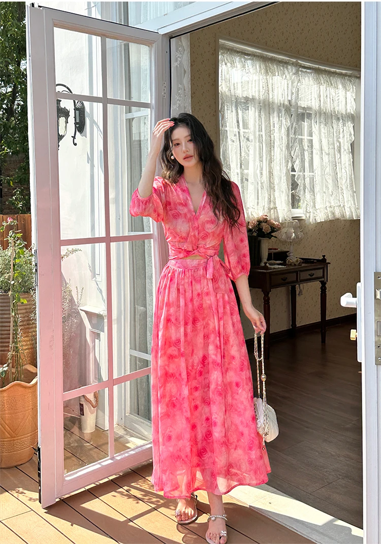 KYLETHOMASW - New Chiffon Suits Skirt Two Piece Half Sleeve Autumn Boho Floral Sets Korean Fashion V Neck Bandage Cropped Tops Long Skirt