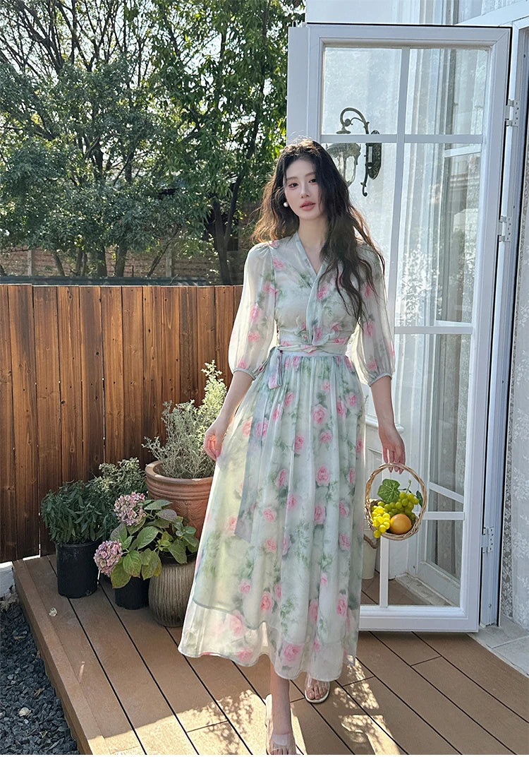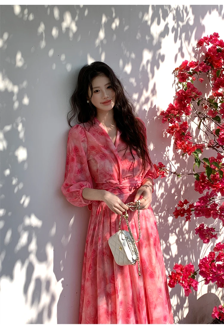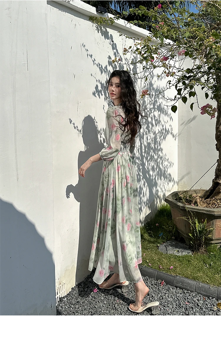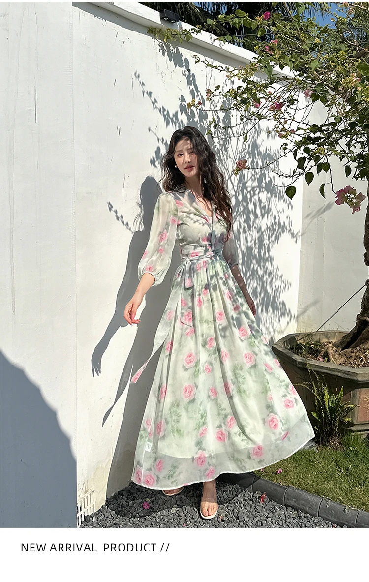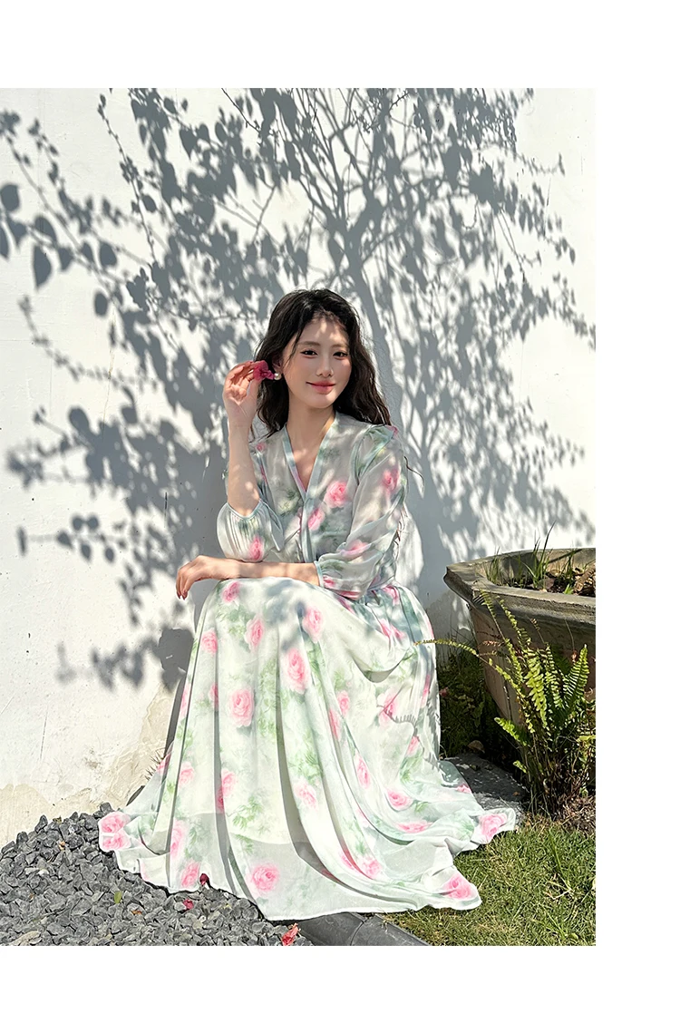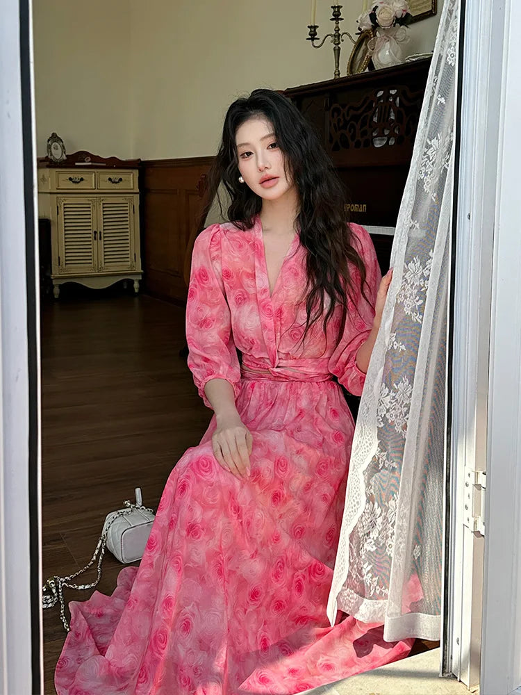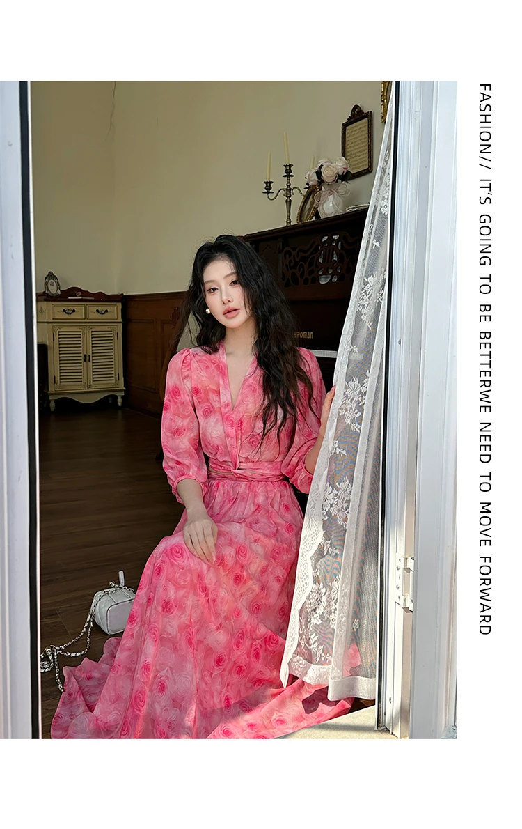 KYLETHOMASW - New Chiffon Suits Skirt Two Piece Half Sleeve Autumn Boho Floral Sets Korean Fashion V Neck Bandage Cropped Tops Long Skirt