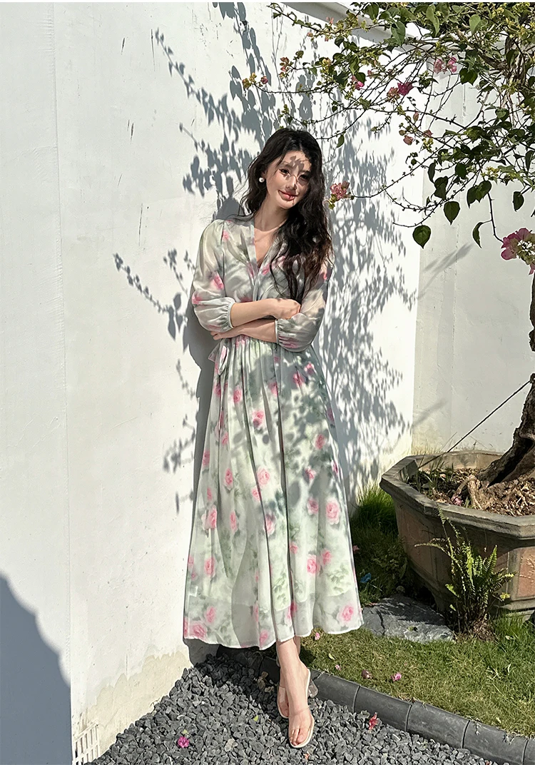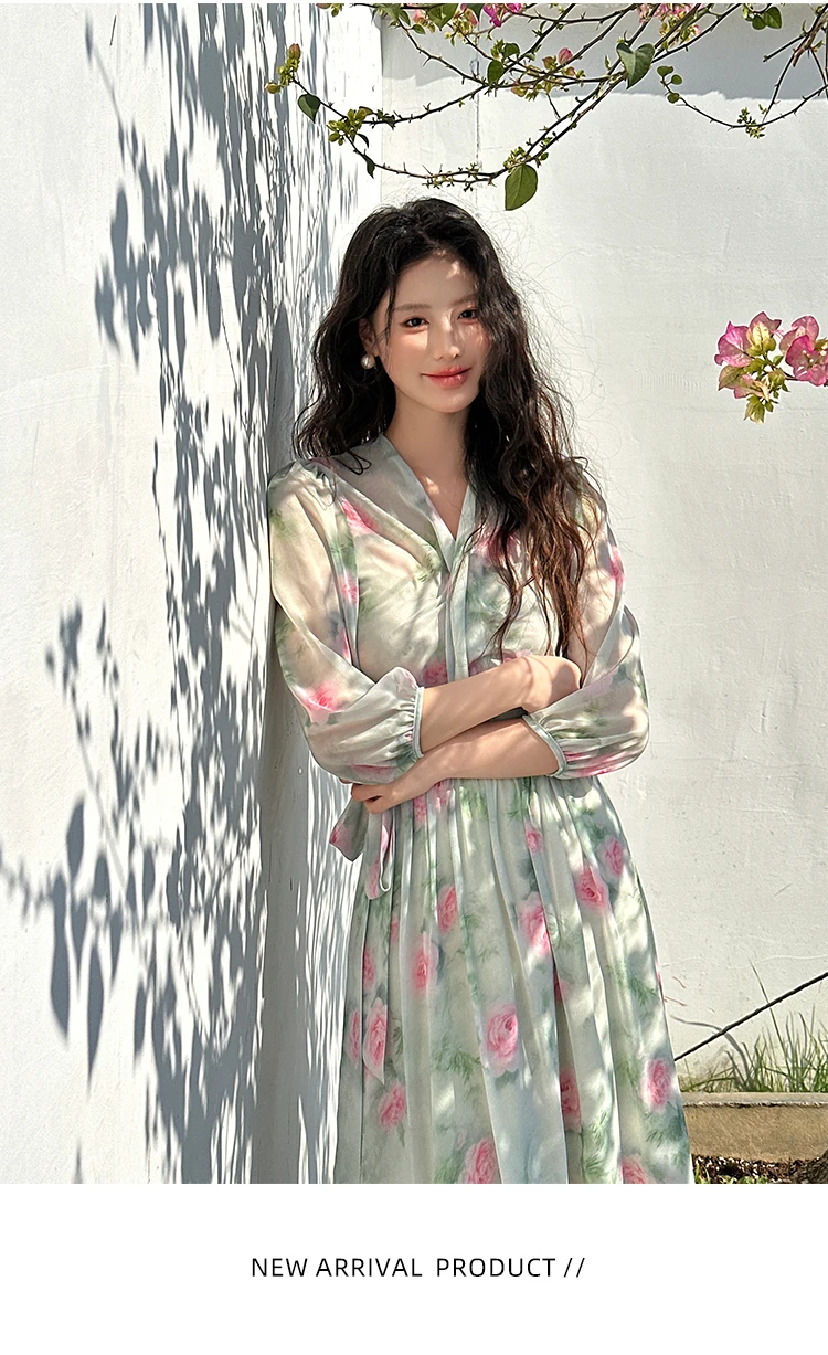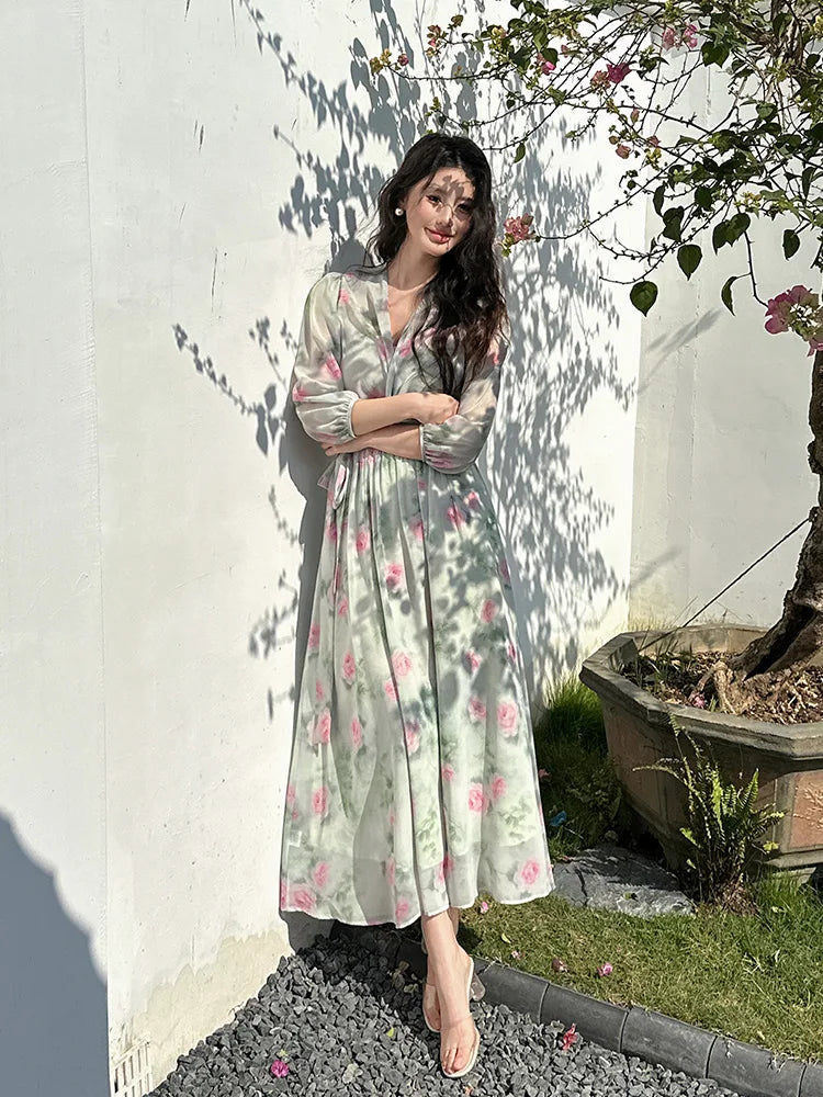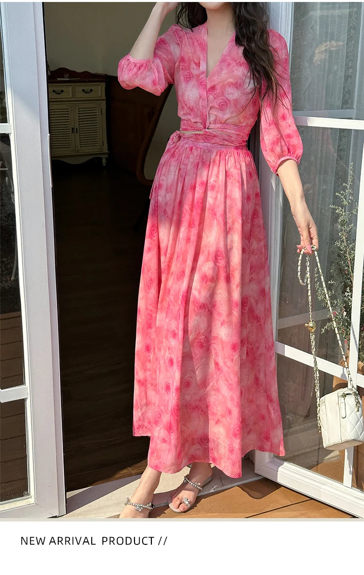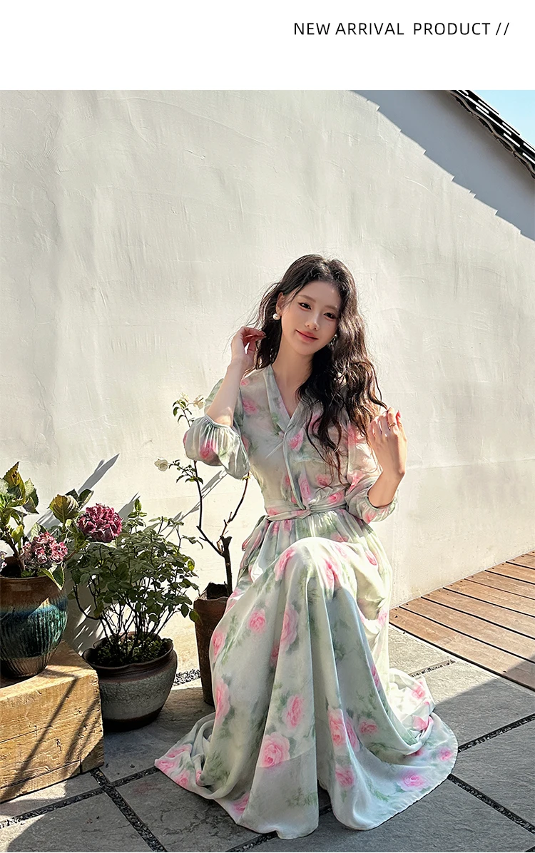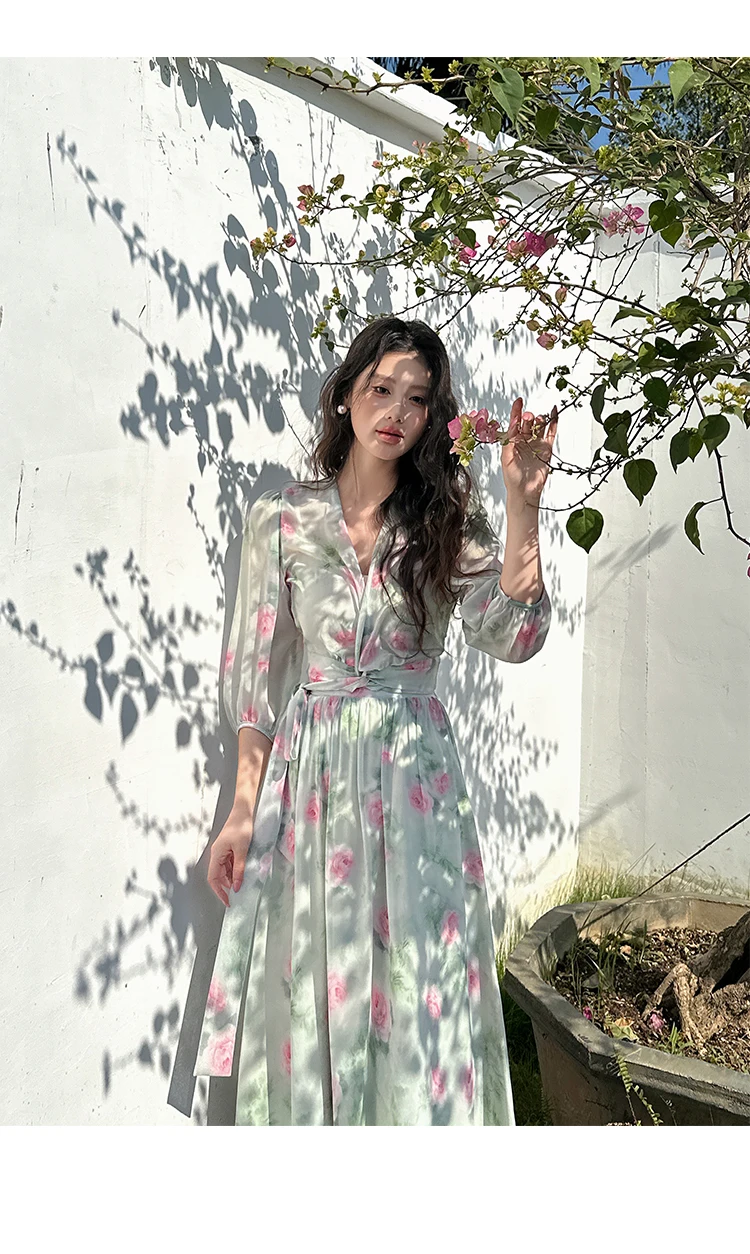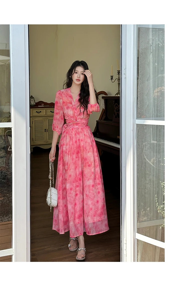 KYLETHOMASW - New Chiffon Suits Skirt Two Piece Half Sleeve Autumn Boho Floral Sets Korean Fashion V Neck Bandage Cropped Tops Long Skirt