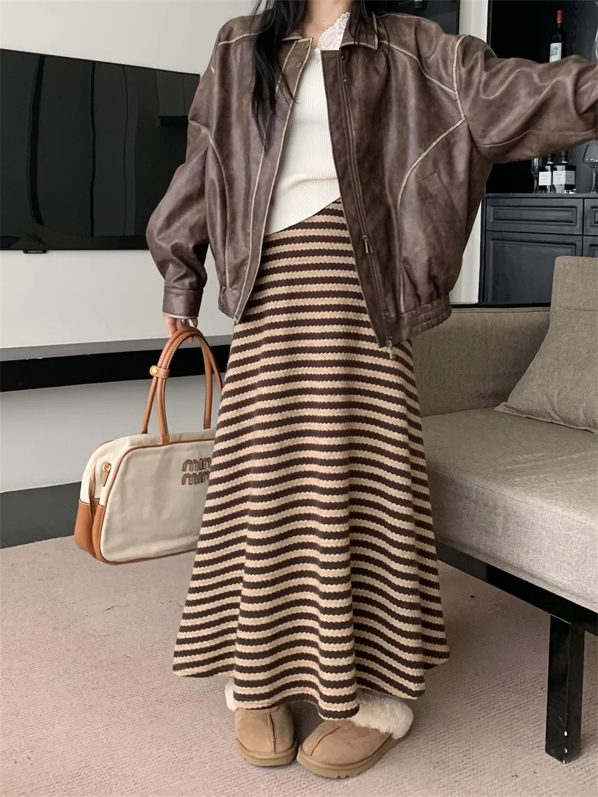 KYLETHOMASW  -  New Knitwear Stripes Loose Skirts Women High Waist Casual 2025 Chic OL All Match Vintage Winter Mujer Office Lady
