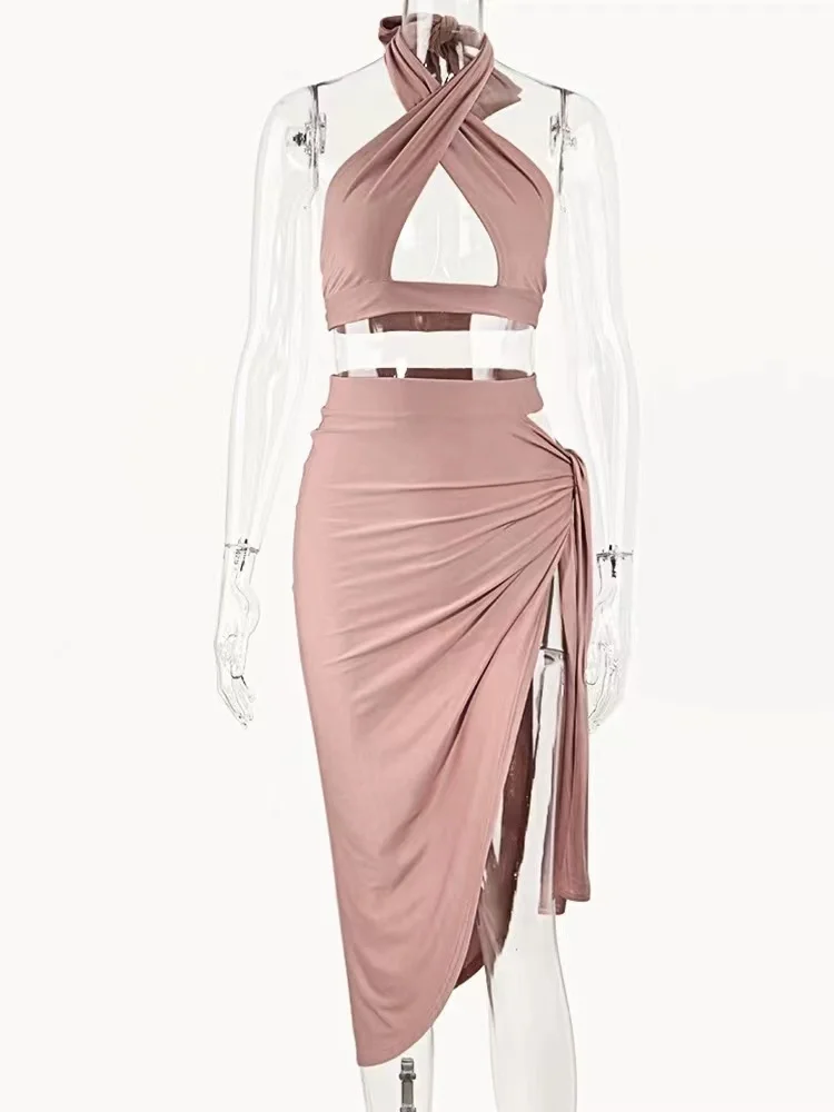 Kylethomasw New Sexy Backless Party Midi Dress Summer Women Solid Top And Skirt Set Cross Cropped Elegant Black Sleeveless Dresses