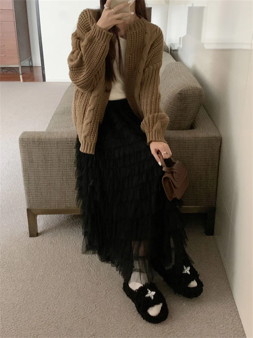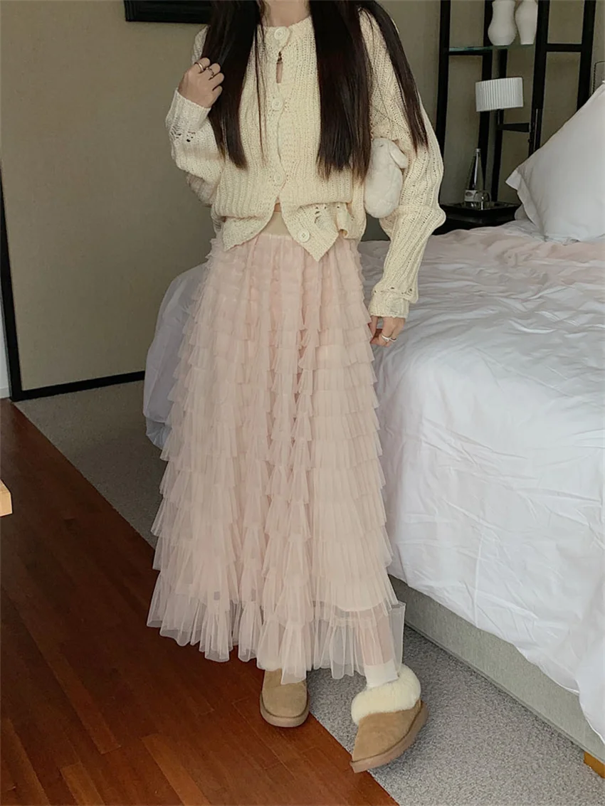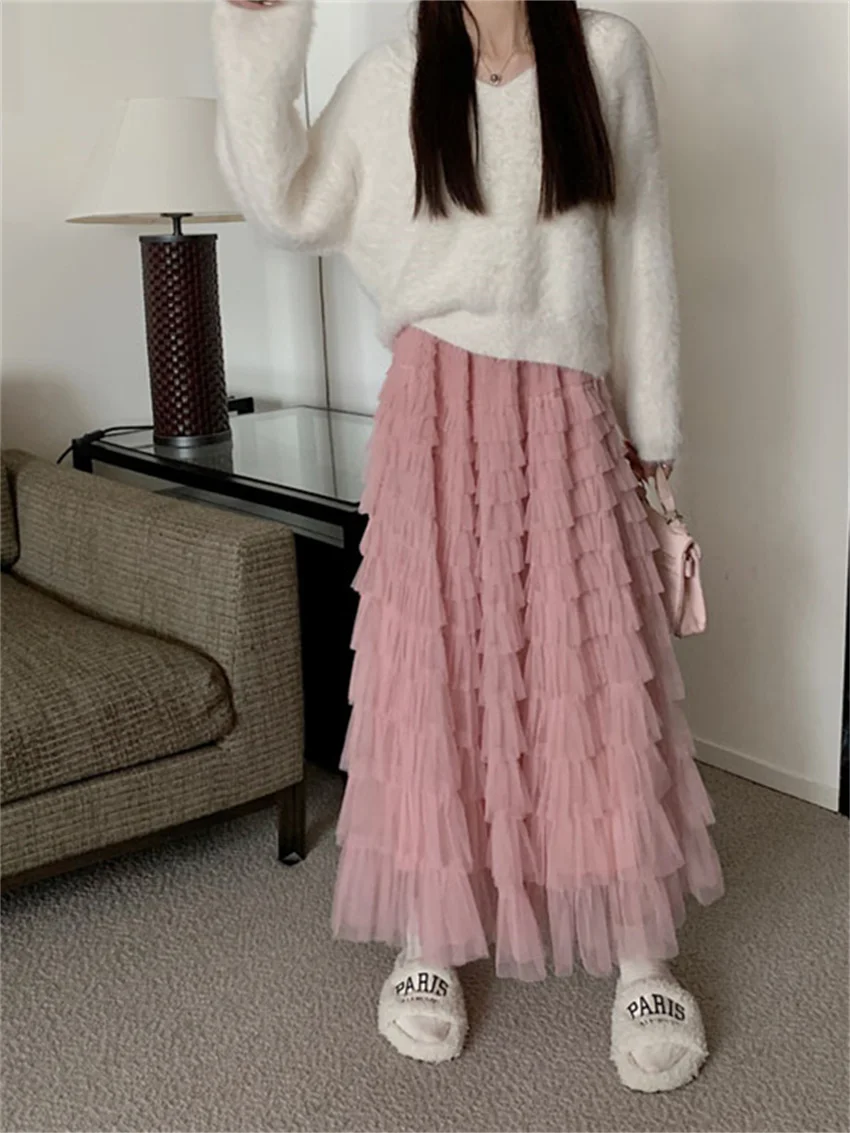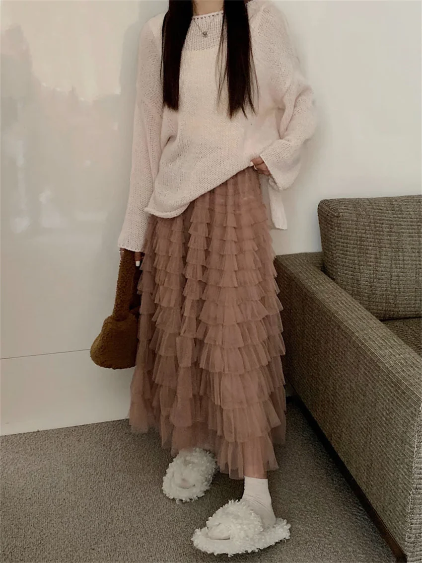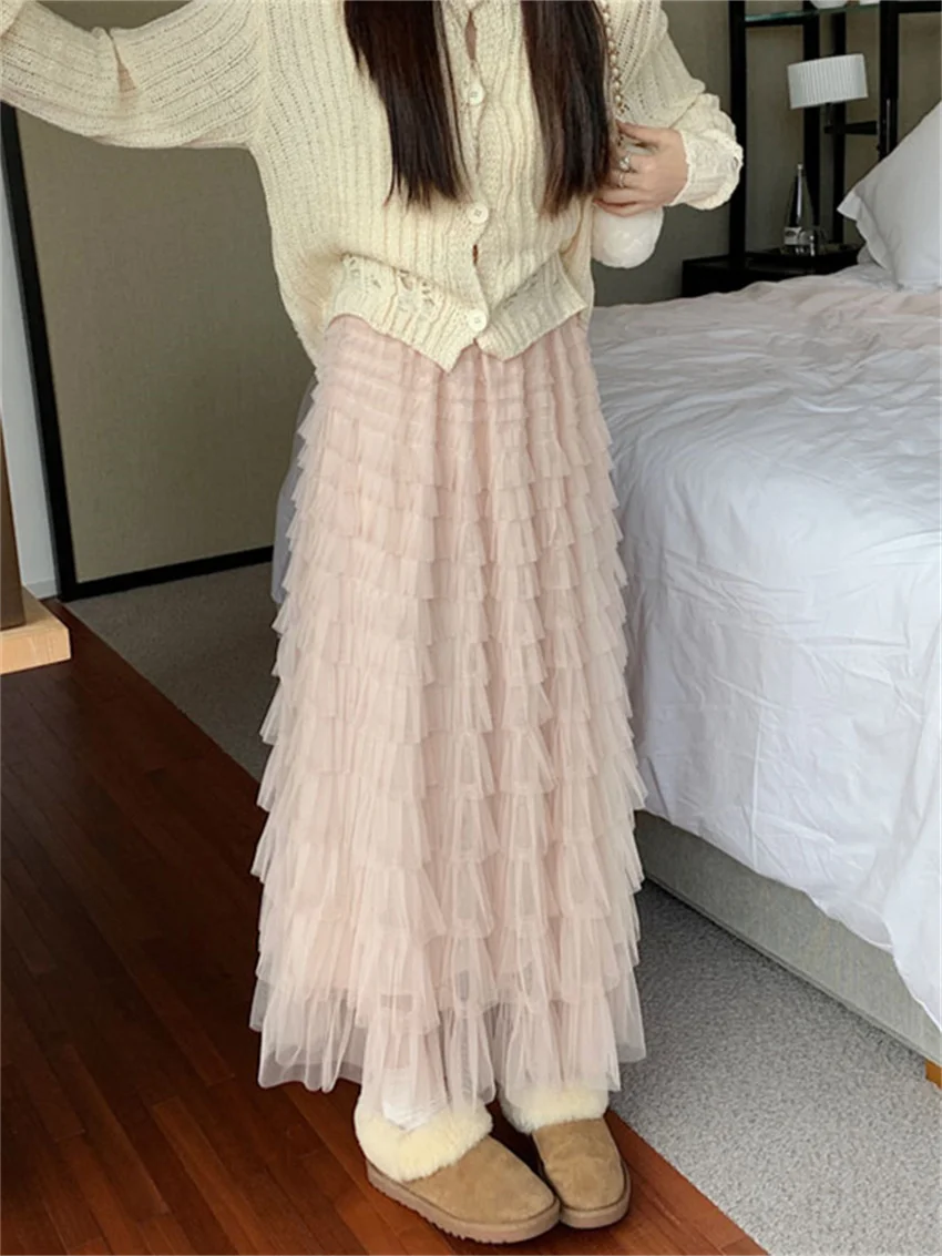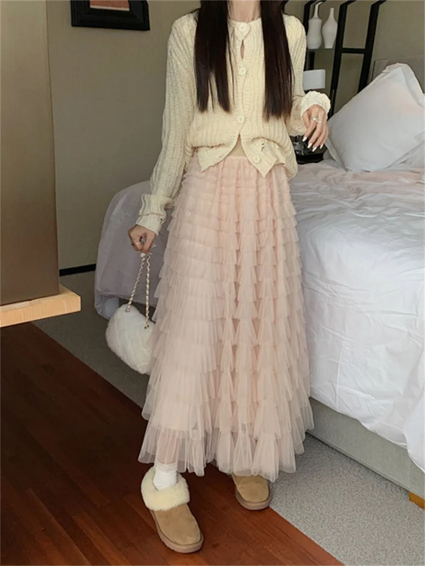 KYLETHOMASW - Sweet Cake Long Skirts Women Mesh New Loose Chic Summer 2024 OL Elegant Casual High Street Slim Gentle Vacation