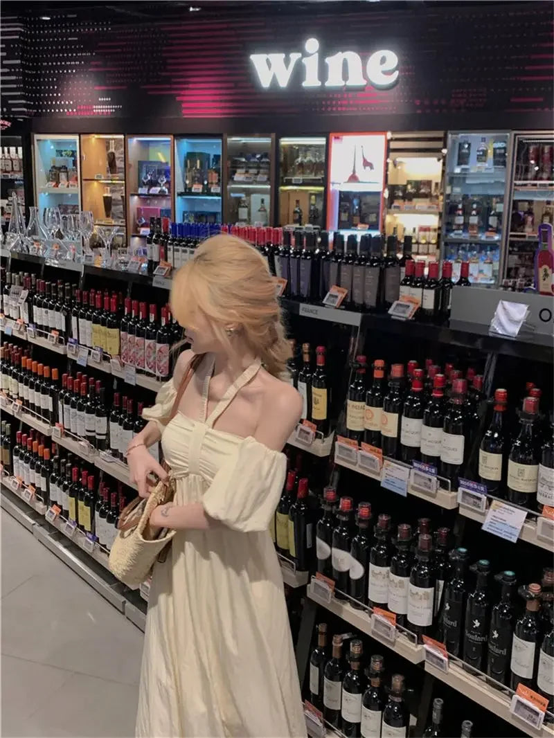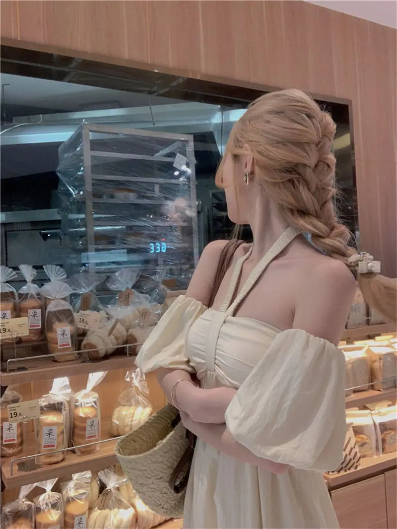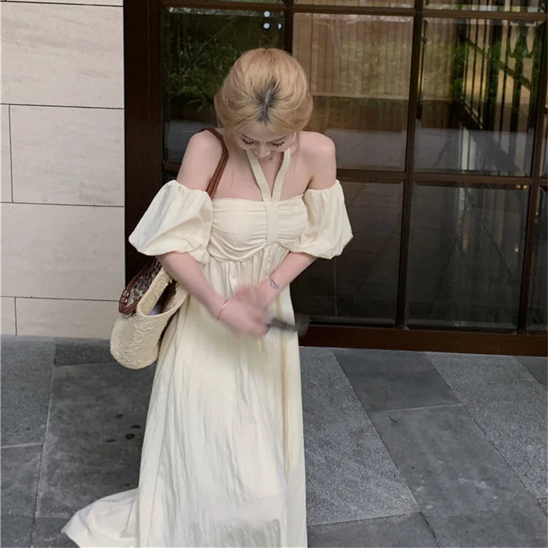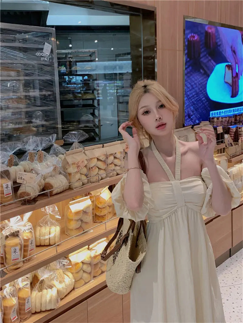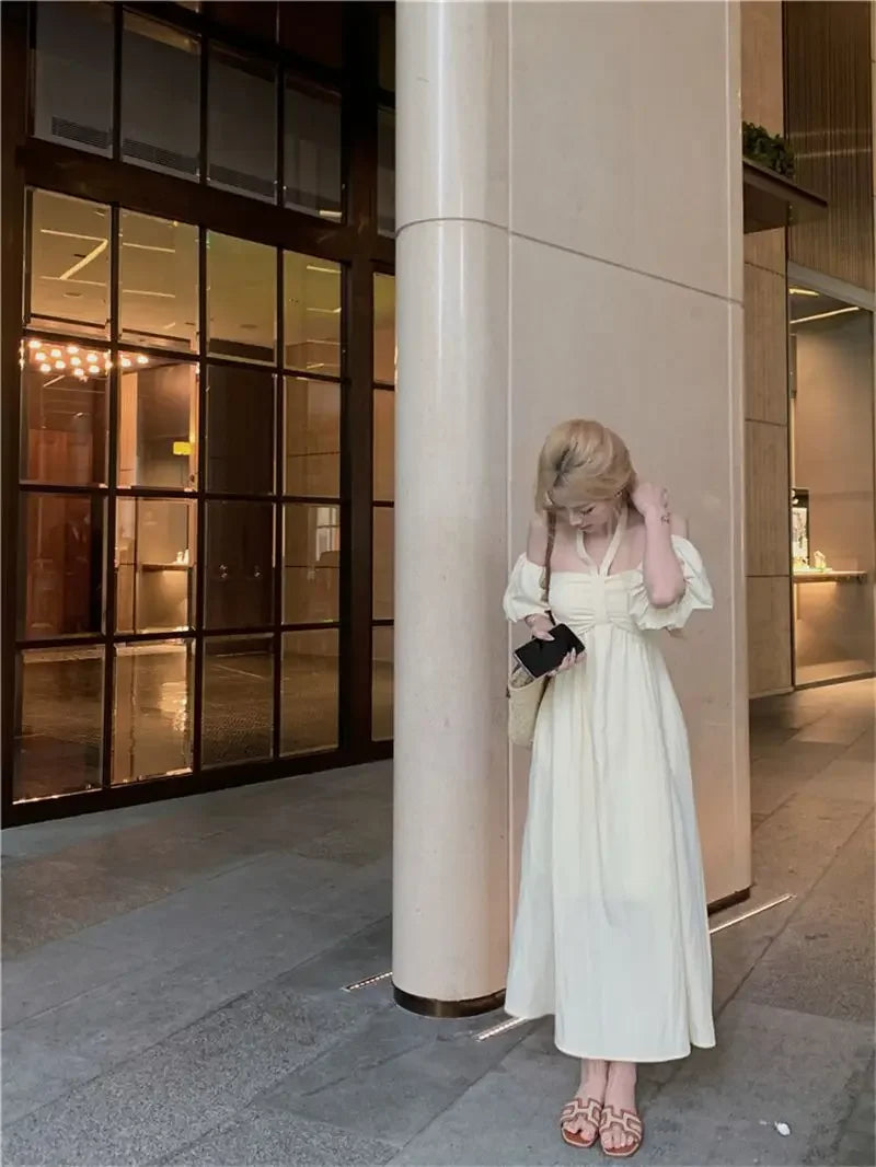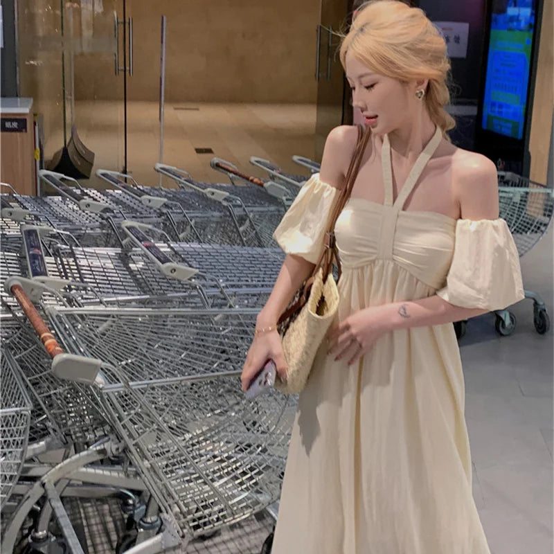 KYLETHOMASW - Sweet Hot Girl Sexy Halter Neck One-shoulder Dress Summer New Waist-hugging Slimming Short Sleeves Backless A-line Skirt