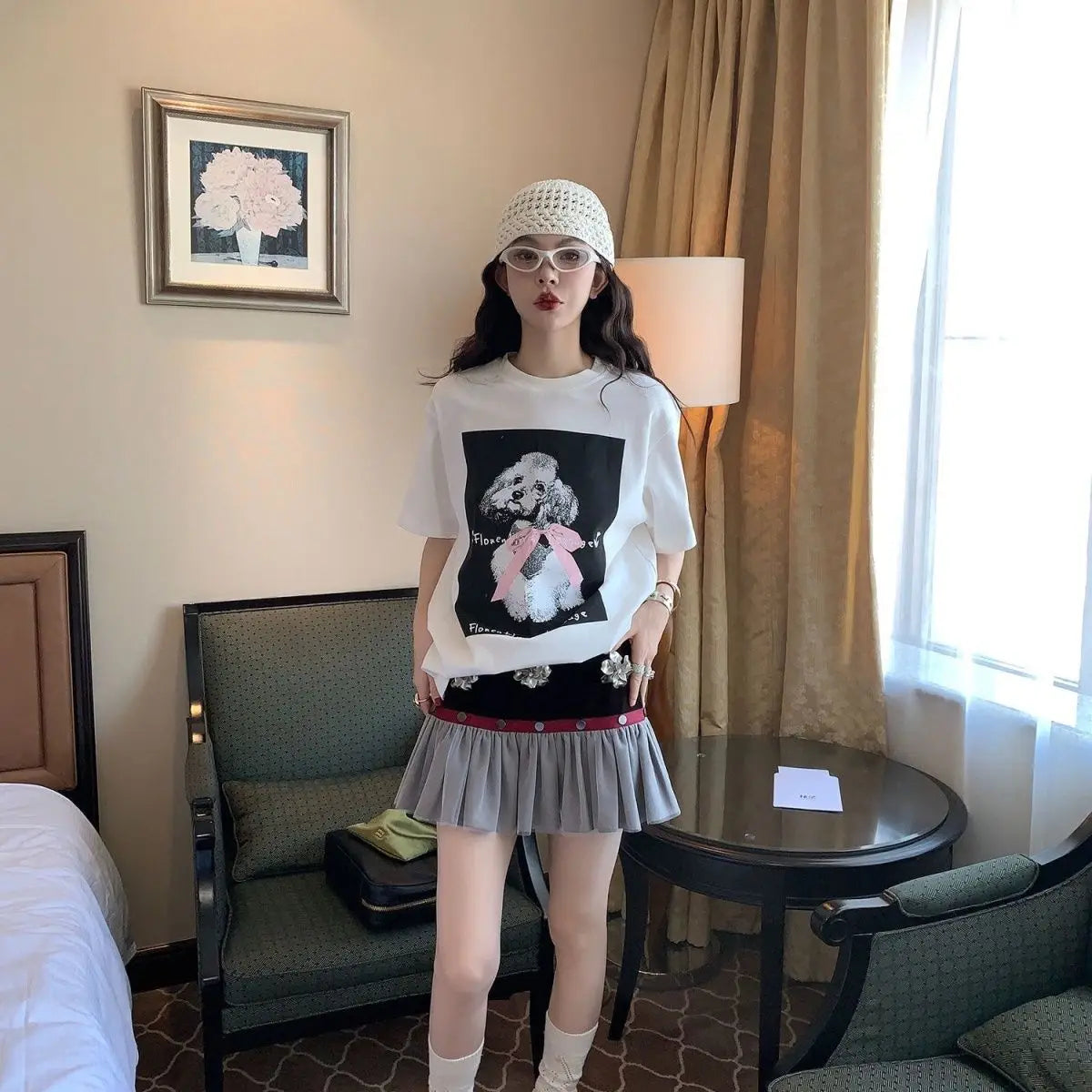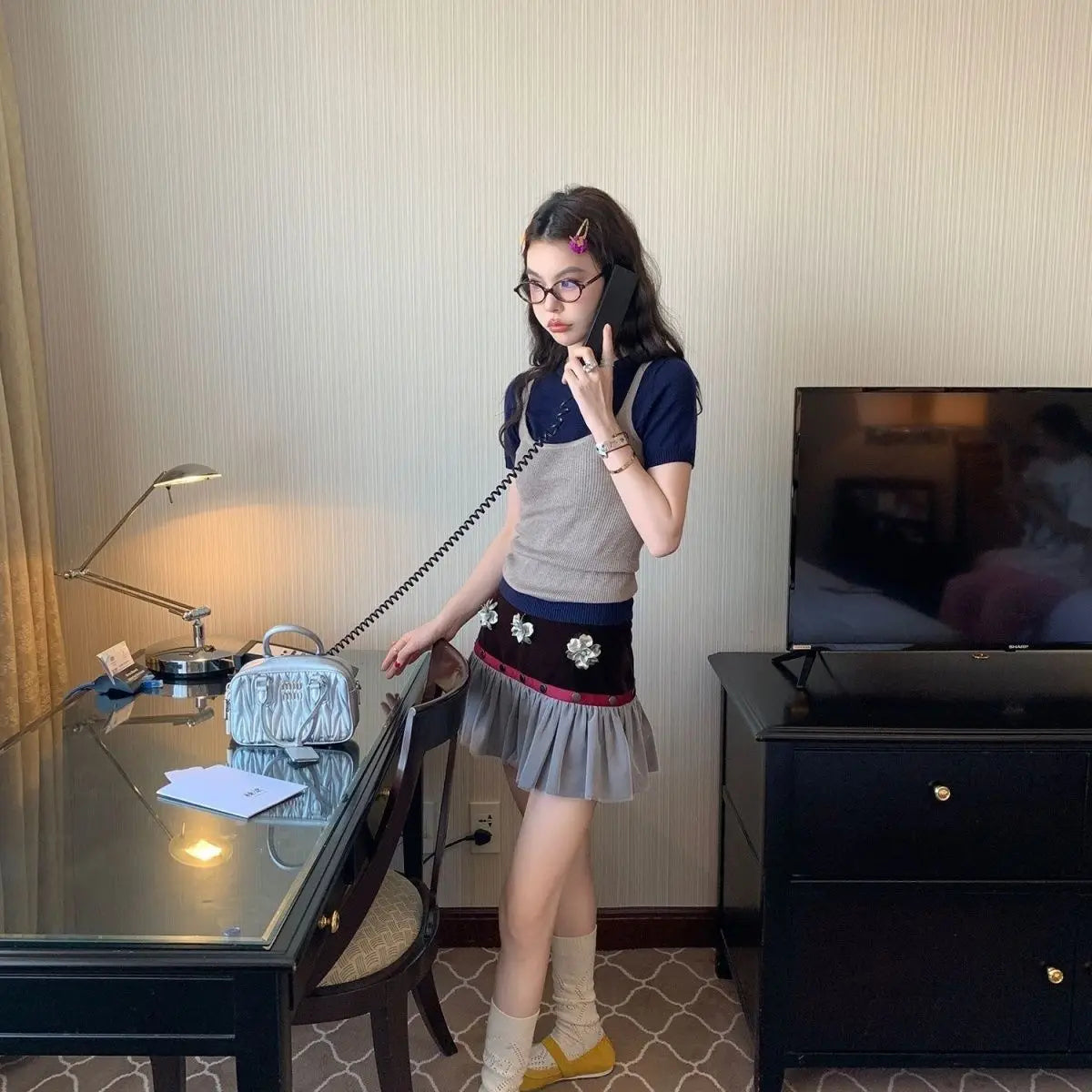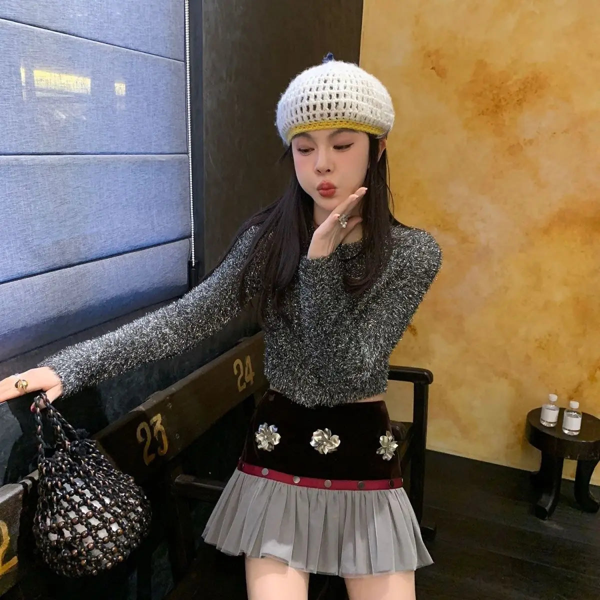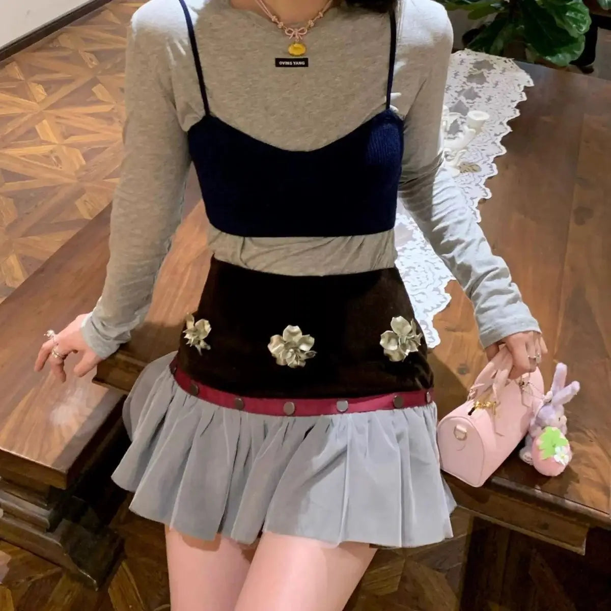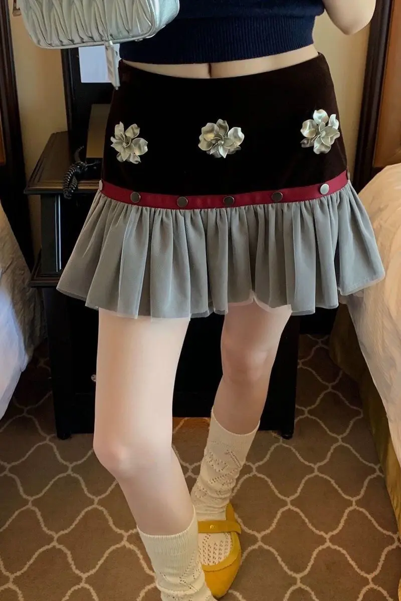 KYLETHOMASW - Velvet Patchwork Skirt Detachable Floral Accent Pleated Midi Skirt Women Trendy Convertible Design High Waist A-Line Dress