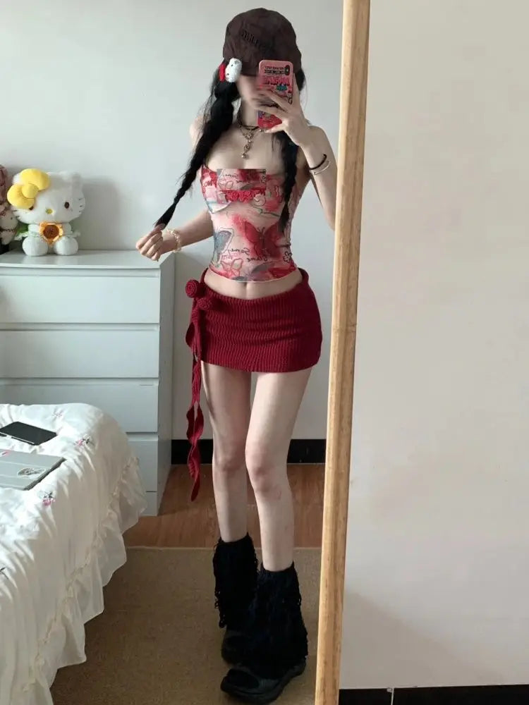 KYLETHOMASW - Women Y2K Two Piece Set Butterfly Print Tube Top and Knitted Side Tie Mini Skirt Slim Fit Suit Sexy Club Summer Street Outfit