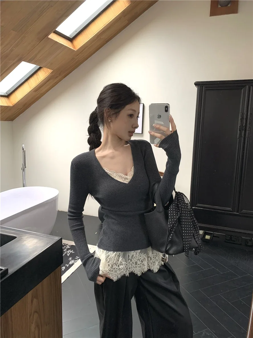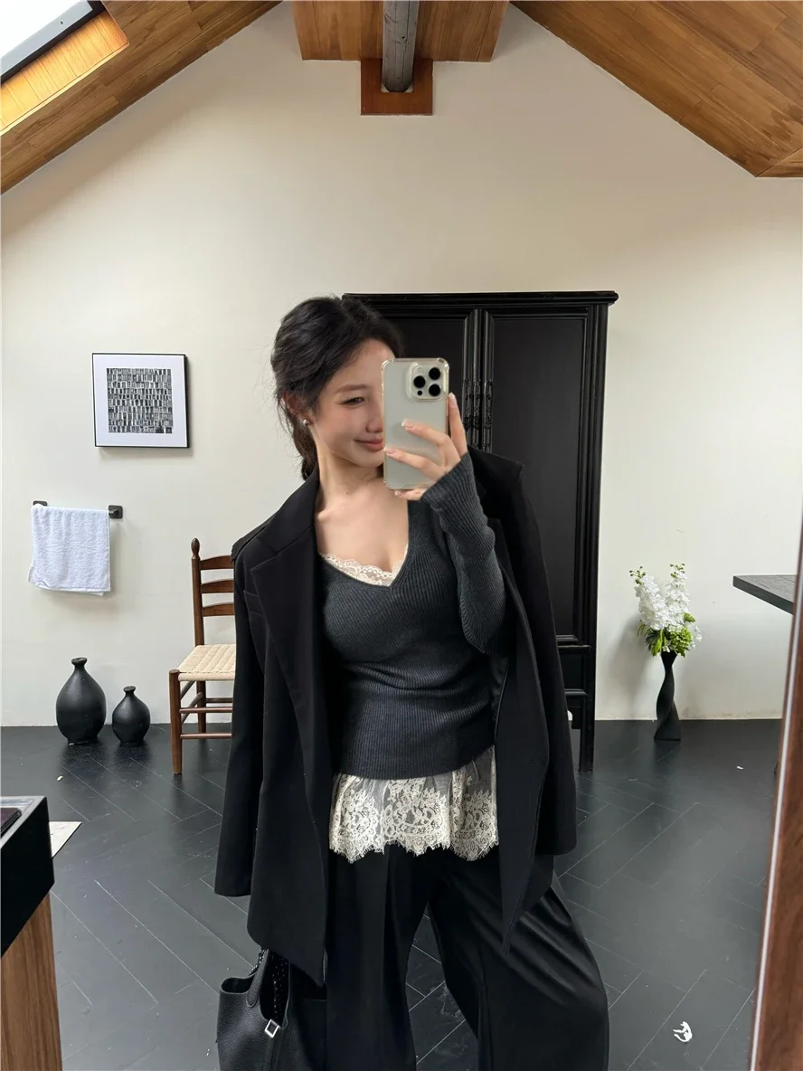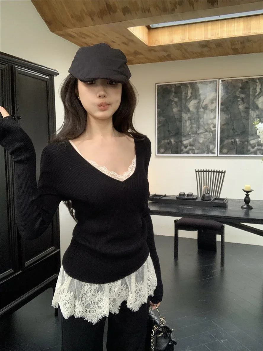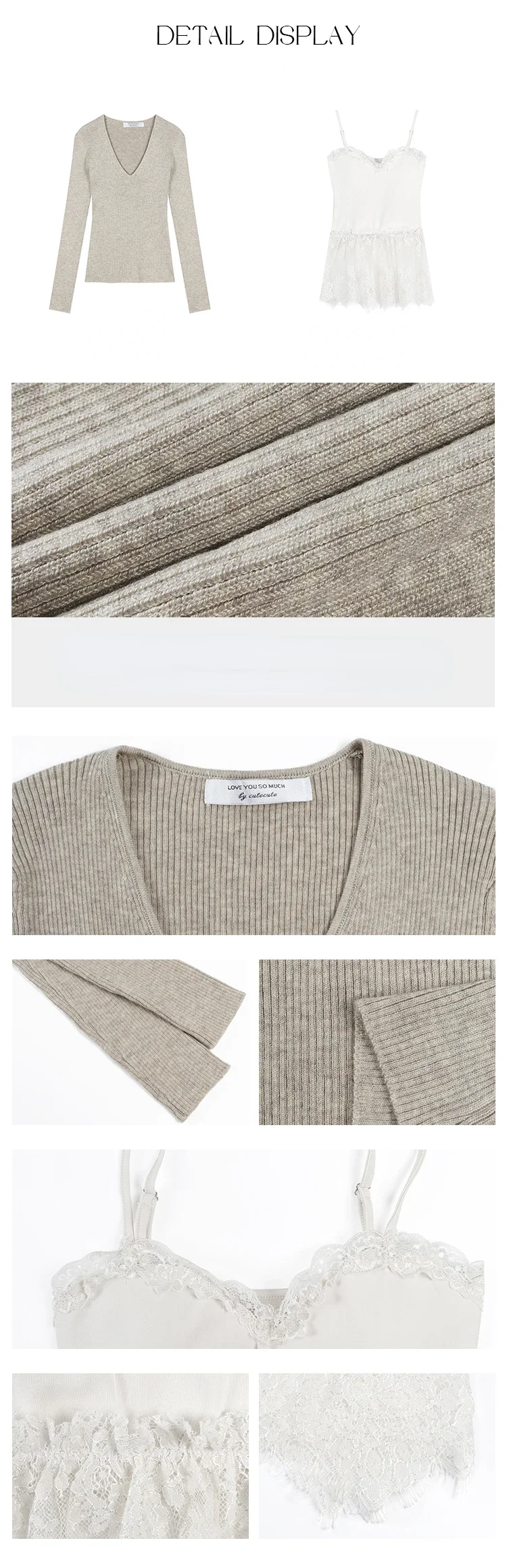 Kylethomasw Autumn New Korean V-neck Sexy Slim Thread Long-sleeved Sweater Women + Lace Splicing Hollow Casual Camisole Two-piece Suit
