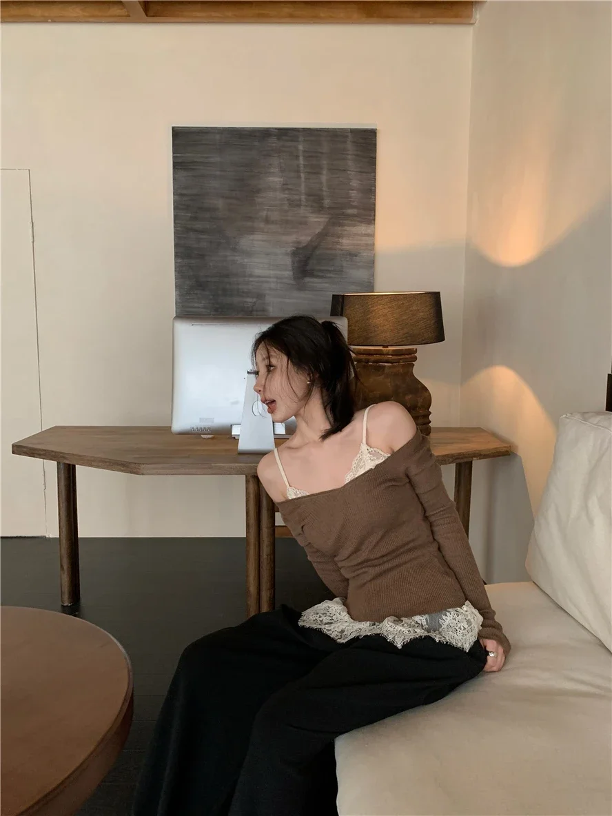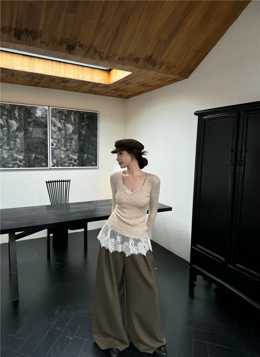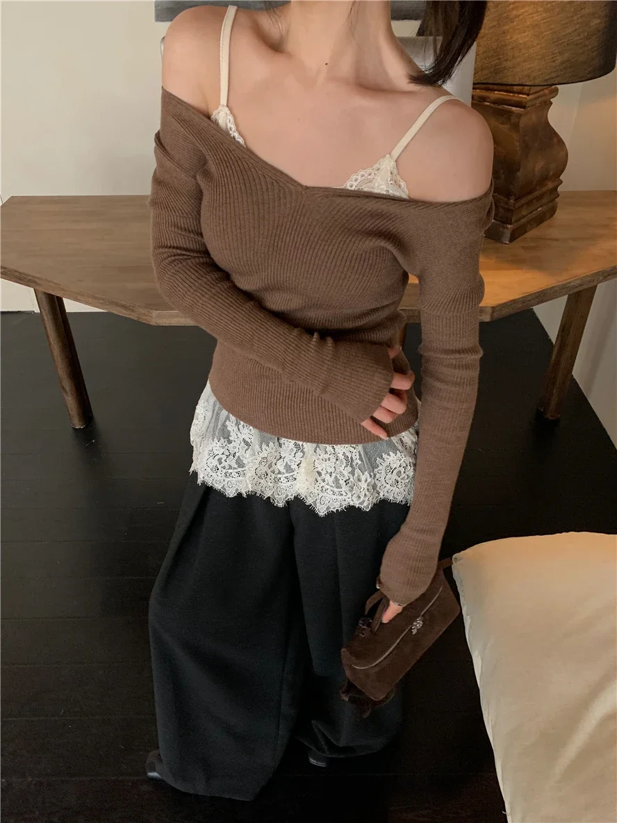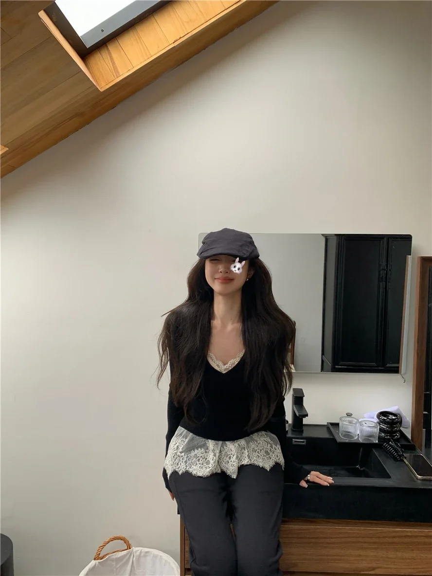 Kylethomasw Autumn New Korean V-neck Sexy Slim Thread Long-sleeved Sweater Women + Lace Splicing Hollow Casual Camisole Two-piece Suit